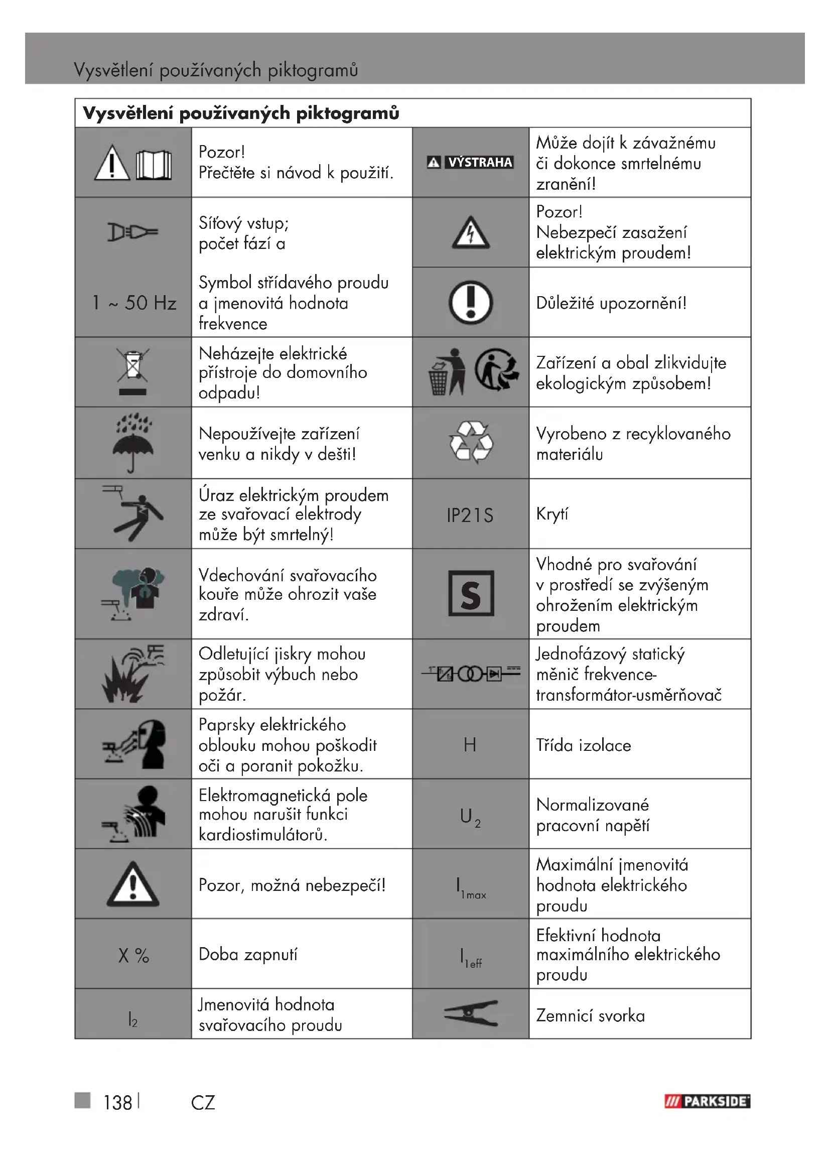 Vysvětlení používaných piktogramů Vysvětlení používaných piktogramů Pozor! Přečtěte si návod kpoužití. VÝSTRAHA Může dojít k závažnému či dokonce smrtelnému zranění! Síťový vstup; počet fází a Pozor! Nebezpečí zasažení elektrickým proudem! 1 ~ 50 Hz Symbol střídavého proudu a jmenovitá hodnota frekvence Důležité upozornění! Neházejte elektrické přístroje do domovního odpadu! Zařízení aobal zlikvidujte ekologickým způsobem! Nepoužívejte zařízení venku a nikdy v dešti! Vyrobeno z recyklovaného materiálu Úraz elektrickým proudem ze svařovací elektrody může být smrtelný! IP21S Krytí Vdechování svařovacího kouře může ohrozit vaše zdraví.