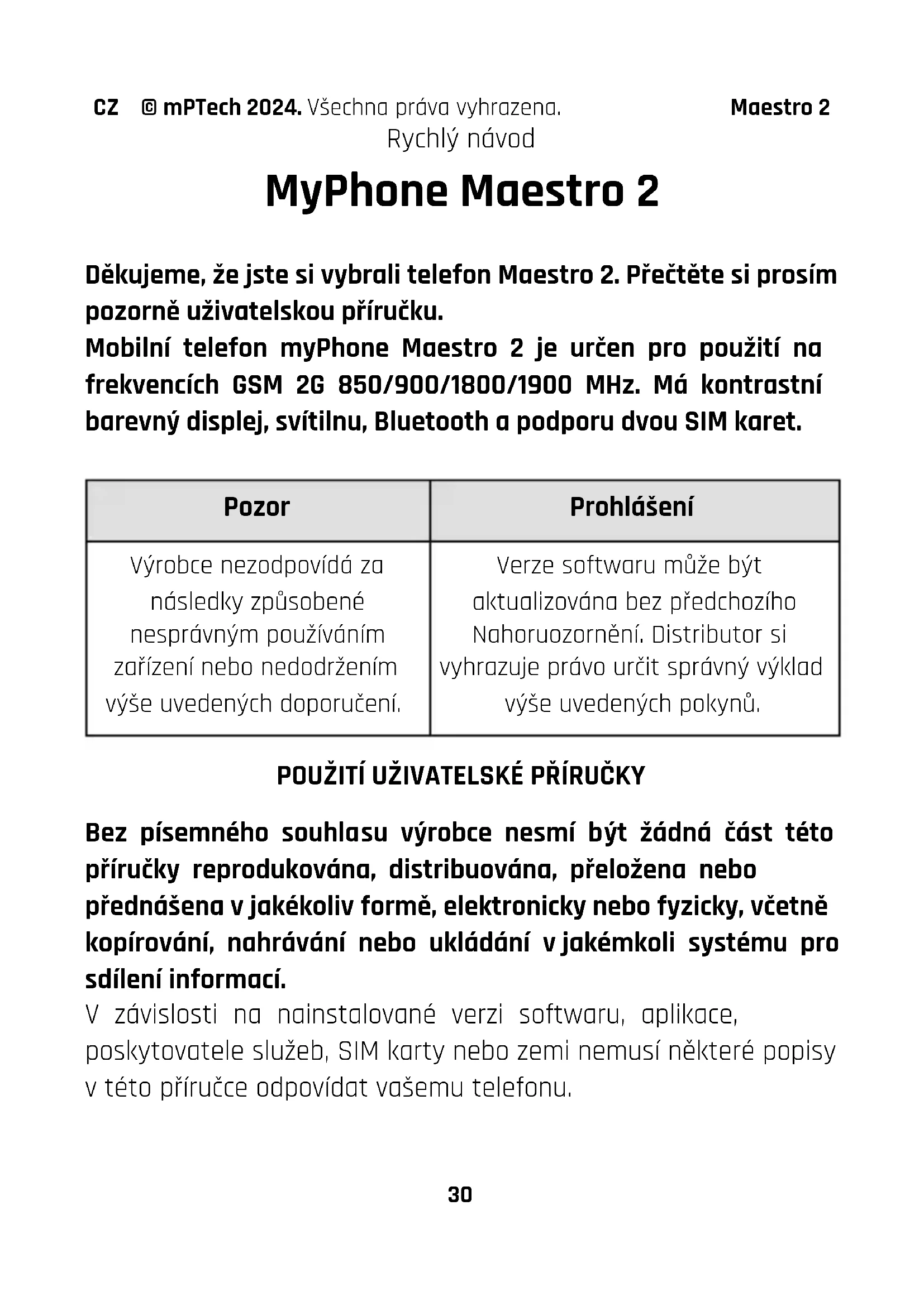 Rychlý návod MyPhone Maestro 2 Děkujeme, že jste si vybrali telefon Maestro 2. Přečtěte si prosím pozorně uživatelskou příručku. Mobilní telefon myPhone Maestro 2 je určen pro použití na frekvencích GSM 2G 850/900/1800/1900 MHz. Má kontrastní barevný displej, svítilnu, Bluetooth a podporu dvou SIM karet. Pozor Prohlášení Výrobce nezodpovídá za následky způsobené nesprávným používáním zařízení nebo nedodržením výše uvedených doporučení. Verze softwaru může být aktualizována bez předchozího Nahoruozornění. Distributor si vyhrazuje právo určit správný výklad výše uvedených pokynů. POUŽITÍ UŽIVATELSKÉ PŘÍRUČKY Bez písemného souhlasu výrobce nesmí být žádná část této příručky reprodukována, distribuována, přeložena nebo přednášena v jakékoliv formě, elektronicky nebo fyzicky, včetně kopírování, nahrávání nebo ukládání v jakémkoli systému pro sdílení informací. V závislosti na nainstalované verzi softwaru, aplikace, poskytovatele služeb, SIM karty nebo zemi nemusí některé popisy v této příručce odpovídat vašemu telefonu.CZ © mPTech 2024. Všechna práva vyhrazena. Maestro 2