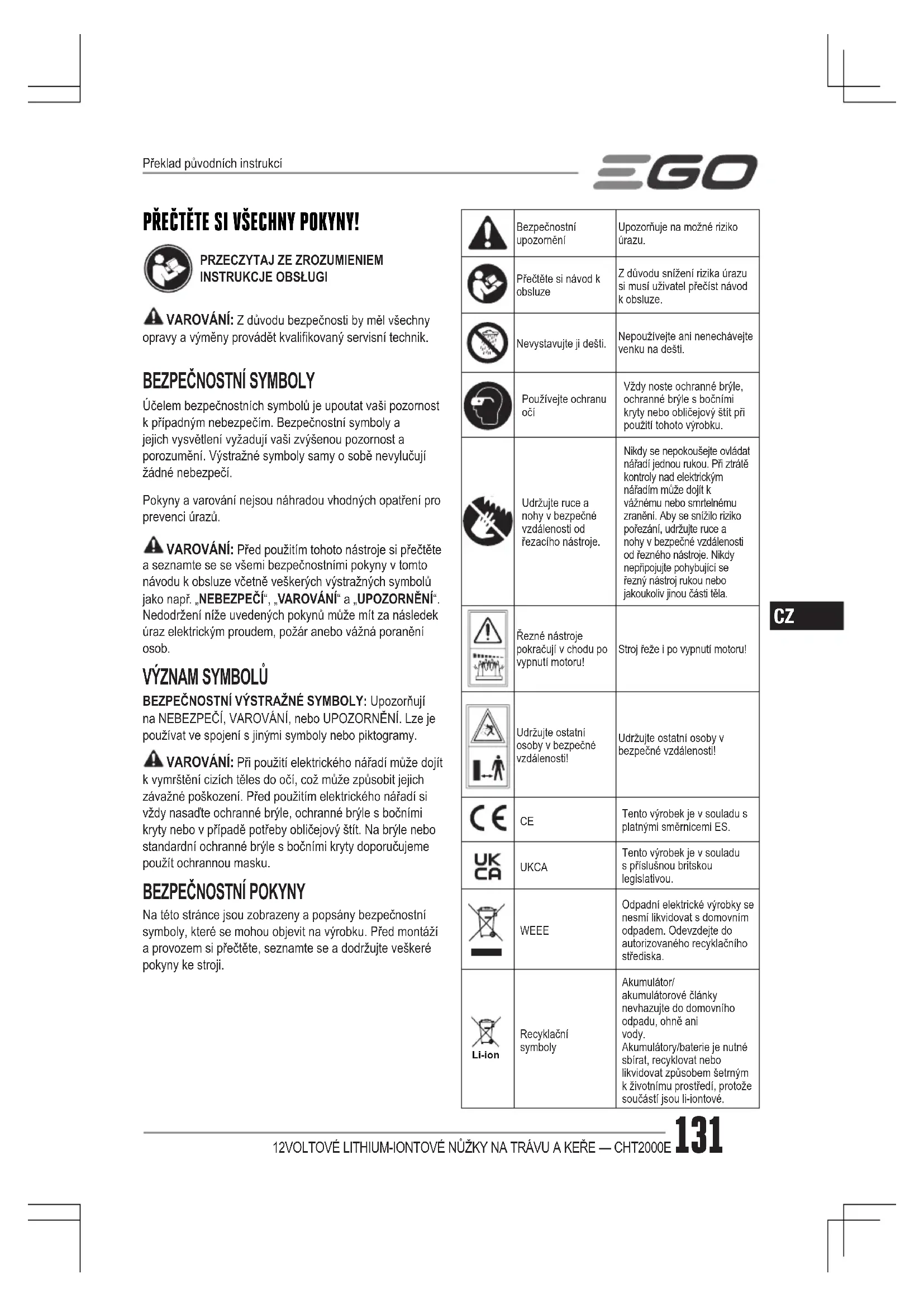 Na této stránce jsou zobrazeny a popsány bezpečnostní symboly, které se mohou objevit na výrobku. Před montáží a provozem si přečtěte, seznamte se a dodržujte veškeré pokyny ke stroji.Bezpečnostní upozorněníUpozorňuje na možné riziko úrazu.Přečtěte si návod k obsluzeZ důvodu snížení rizika úrazu si musí uživatel přečíst návod k obsluze.Nevystavujte ji dešti.Nepoužívejte ani nenechávejte venku na dešti.Používejte ochranu očí Vždy noste ochranné brýle, ochranné brýle s bočními kryty nebo obličejový štít při použití tohoto výrobku.Udržujte ruce a nohy v bezpečné vzdálenosti od řezacího nástroje.Nikdy se nepokoušejte ovládat nářadí jednou rukou. Při ztrátě kontroly nad elektrickým nářadím může dojít k vážnému nebo smrtelnému zranění. Aby se snížilo riziko pořezání, udržujte ruce a nohy v bezpečné vzdálenosti od řezného nástroje. Nikdy nepřipojujte pohybující se řezný nástroj rukou nebo jakoukoliv jinou části těla.Řezné nástroje pokračují v chodu po vypnutí motoru!Stroj řeže i po vypnutí motoru!Udržujte ostatní osoby v bezpečné vzdálenosti!Udržujte ostatní osoby v bezpečné vzdálenosti! Tento výrobek je v souladu s platnými směrnicemi ES. UKCA Tento výrobek je v souladu s příslušnou britskou legislativou. WEEE Odpadní elektrické výrobky se nesmí likvidovat s domovním odpadem. Odevzdejte do autorizovaného recyklačního střediska. Li-ion Recyklační symbolyAkumulátor/ akumulátorové články nevhazujte do domovního odpadu, ohně ani vody. Akumulátory/baterie je nutné sbírat, recyklovat nebo likvidovat způsobem šetrným k životnímu prostředí, protože součástí jsou li-iontové.Překlad původních instrukcí12VOLTOVÉ LITHIUM-IONTOVÉ NŮŽKY NA TRÁVU A KEŘE — CHT2000E132
