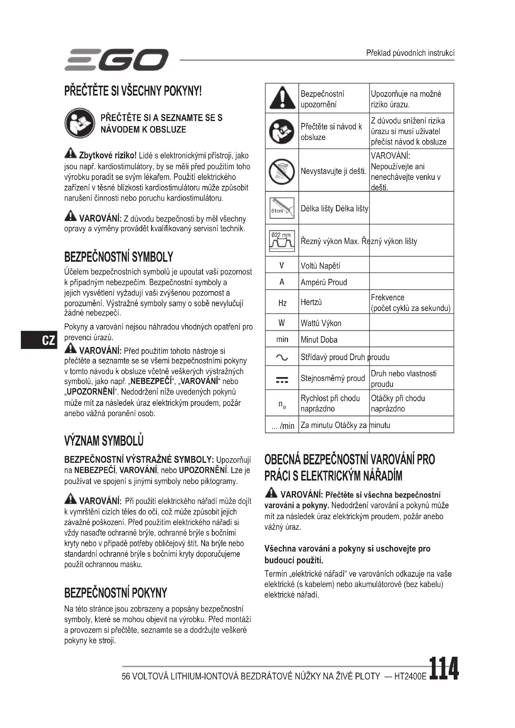 PRÁCI S ELEKTRICKÝM NÁŘADÍM VAROVÁNÍ: Přečtěte si všechna bezpečnostní varování a pokyny. Nedodržení varování a pokynů může mít za následek úraz elektrickým proudem, požár anebo vážný úraz. Všechna varování a pokyny si uschovejte pro budoucí použití. Termín „elektrické nářadí“ ve varováních odkazuje na vaše elektrické (s kabelem) nebo akumulátorové (bez kabelu) elektrické nářadí. Překlad původních instrukcí56 VOLTOVÁ LITHIUM-IONTOVÁ BEZDRÁTOVÉ NŮŽKY NA ŽIVÉ PLOTY — HT2400E