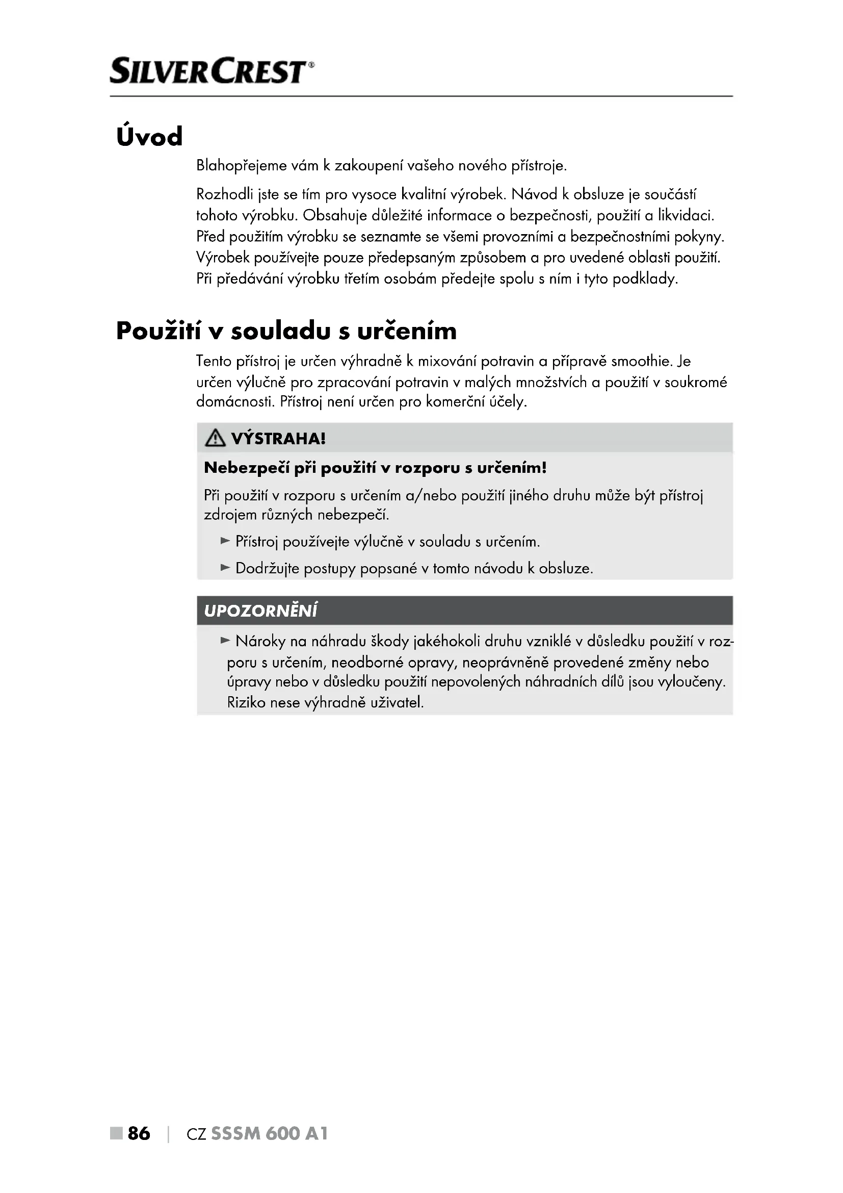 Úvod Blahopřejeme vám kzakoupení vašeho nového přístroje. Rozhodli jste se tím pro vysoce kvalitní výrobek. Návod kobsluze je součástí tohoto výrobku. Obsahuje důležité informace obezpečnosti, použití a likvidaci. Před použitím výrobku se seznamte se všemi provozními a bezpečnostními pokyny. Výrobek používejte pouze předepsaným způsobem a pro uvedené oblasti použití. Při předávání výrobku třetím osobám předejte spolu sním ityto podklady. Použití vsouladu surčením Tento přístroj je určen výhradně k mixování potravin a přípravě smoothie. Je určen výlučně pro zpracování potravin v malých množstvích a použití vsoukromé domácnosti. Přístroj není určen pro komerční účely. VÝSTRAHA! Nebezpečí při použití vrozporu surčením! Při použití vrozporu surčením a/nebo použití jiného druhu může být přístroj zdrojem různých nebezpečí. ► Přístroj používejte výlučně vsouladu surčením. ► Dodržujte postupy popsané vtomto návodu kobsluze. UPOZORNĚNÍ ► Nároky na náhradu škody jakéhokoli druhu vzniklé vdůsledku použití vroz- poru surčením, neodborné opravy, neoprávněně provedené změny nebo úpravy nebo vdůsledku použití nepovolených náhradních dílů jsou vyloučeny. Riziko nese výhradně uživatel.CZ