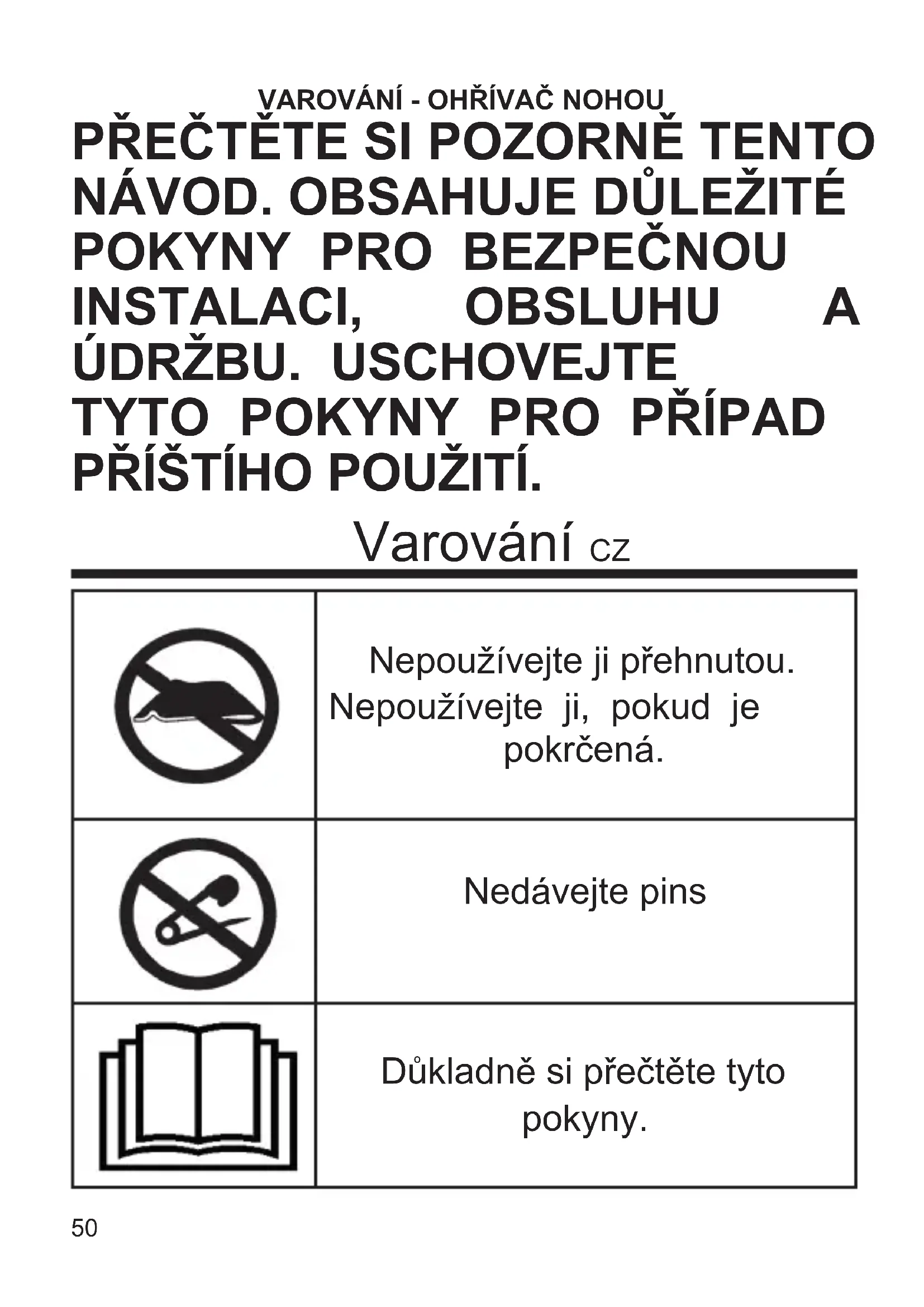 PŘÍŠTÍHO POUŽITÍ. Nepoužívejte ji přehnutou. Nepoužívejte ji, pokud je pokrčená. Nedávejte pins Důkladně si přečtěte tyto pokyny. Varování CZ51 Tento výrobek by neměly používat osoby necitlivé na teplo nebo jinými velmi zranitelnými osobami, které nejsou schopné reagovat na přehřátí. Zařízení může být používáno dětmi mladšími než 8 let a osobami s omezenými fyzickými schopnostmi, smyslovými schopnostmi nebo duševními schopnostmi, nebo bez zkušeností nebo nutných znalostí pouze pod dohledem nebo po té, co byly seznámeny s instrukcemi k bezpečnému používání zařízení a pochopily nebezpečí spojená se zařízením. Děti si nesmí hrát se zařízením. Čištění a údržba, které mají být provedeny uživatelem, nesmí být prováděny dětmi bez dozoru. Nepoužívejte, pokud je spotřebič mokrý nebo vlhký. Dlouhodobá aplikace vysoké teploty může způsobit popálení kůže. Pro nepřetržité nebo delší používání výrobku, například uživatelem, který by mohl usnout, nastavte ovládací zařízení na polohu 1, abyste předešli popáleninám na pokožce. Vyhněte se tomu, abyste usnuli, když je výrobek v provozu.52 Uložte spotřebič v originálním balení na čistém suchém místě, pokud jej nebudete používat. Nedávejte na spotřebič těžké předměty. Výrobek při uskladnění nijak neohýbejte, nemačkejte či nedeformujte pokládáním předmětů na něj. Přikrývka nevyžaduje speciální údržbu. Pouze ji pravidelně zkontrolujte z hlediska opotřebení nebo poškození. Pokud je nějaká část spotřebiče poškozená, odneste jej do servisního střediska ke kontrole, před opětovným použitím. Pokud je poškozený přívodní kabel, musí být vyměněn pouze v autorizovaném servisním středisku schváleném výrobcem. Pro čištění spotřebiče nahlédněte do oddílu ÚDRŽBA. Těhotné ženy, osoby s cukrovkou nebo s kardiostimulátorem, by se před použitím měly poradit s lékařem. Výrobek byl navržen a vyroben k provozu v domácím prostředí jako ohřívač nohou; proto je třeba jakékoli jiné použití považovat za nevhodné a tudíž nebezpečné. Nepoužívejte výrobek bez podšívky. Nepoužívejte k ohřívaní zvířat. Před použitím výrobku si sundejte boty Tento spotřebič není určen pro použití v53 nemocnicích. Před uskladněním nechte spotřebič důkladně vychladnout. Uschovejte si záruku, účtenku a příručku pro jakékoli další nahlédnutí. Po vyjmutí zařízení z obalu se ujistěte o jeho neporušenosti a v případě viditelných poškození jej nepoužívejte a obraťte se na odborně kvalikovaný personál. Nenechávejte části obalu v dosahu dětí ani obal nepoužívejte jako hru: jedná se o elektrické zařízení a je třeba s ním podle toho zacházet. Před připojením zařízení se ujistěte, že napětí, které se nachází v proudové zásuvce, odpovídá tomu, které je uvedeno na identikačním štítku. V případě, že zástrčka a zásuvka nejsou vzájemně kompatibilní, nechte vyměnit zásuvku za jinou zásuvku vhodného druhu odborně kvalikovaným personálem. Nepoužívejte adaptéry nebo prodlužovací kabely, které neodpovídají platným bezpečnostním předpisům nebo které překračují mezní hodnoty proudového odběru. Když se zařízení nepoužívá, odpojte jej od elektrické sítě. Pro vytažení zástrčky ze zásuvky netahejte za napájecí kabel ani za samotné zařízení. Použití jakéhokoli elektrického zařízení vyžaduje dodržení několika základních pravidel, konkrétně: - Nedotýkejte se zařízení mokrýma nebo vlhkýma rukama. - Nenechávejte zařízení vystaveno působení atmosférických vlivů (déšť, sůl). - Nevystavujte jej nárazům. Přívodní kabel roztáhněte na plnou délku, abyste zabránili přehřátí. Pokud dojde k závadě, zásahu pojistky, ochranné tepelné pojistky nebo provozní anomálii výrobku, okamžitě jej odpojte za zásuvky, nijak jej neupravujte a kontaktujte autorizované servisní středisko. Z bezpečnostních důvodů nesmí být výrobek a ovládací jednotka otevřené. Vyhněte se přiblížení ovládací jednotky zdrojům tepla. Zabraňte zakrytí ovládací jednotky nebo jejího umístění nad výrobkem během jeho provozu. Výrobek nesmí být podroben váze těla. Nepoužívejte zařízení venku. Nepoužívejte výrobek společně s jinými topnými zařízeními.54 Funkce Zasuňte zástrčku do zásuvky. Zapněte přístroj stlačením tlačítka ON/OFF na několik sekund. Přístroj se automaticky zapne v poloze 3. Chcete-li změnit polohu ohřevu, stiskněte následně tlačítko TEMP, dokud nedosáhnete požadované úrovně, nastavitelné od 1 do 6. Před použitím předehřejte přístroj v poloze 6 po dobu prvních 10 minut, poté nastavte požadovanou polohu. V případě dlouhodobého nebo nepřetržitého používání je třeba jej používat v poloze 1, aby nedošlo k popálení kůže. Po 90 minutách provozu se přístroj automaticky vypne. Pokud se na displeji objeví symbol P nebo symbol E, znamená to, že má přístroj poruchu. Chcete-li přístroj vypnout, stiskněte na 3 sekundy tlačítko ON/OFF. Údržba Odpojte zástrčku od elektrické zásuvky a před čištěním je nechejte vychladnout. K čištění spotřebiče použijte suchý nebo jemně navlhčený hadřík. Nepoužívejte velké množství tekutiny, nebo hadry, abyste zabránili vniknutí vody do spotřebiče a jeho poškození. Nepoužívejte k čištění chemická rozpouštědla ani nesušte v sušičce. Může se poškodit a další použití může být proto nebezpečné. NIKDY NEPONOŘUJTE SPOTŘEBIČ DO VODY. Neukládejte a nepoužívejte výrobek dříve, než je zcela suchý.55