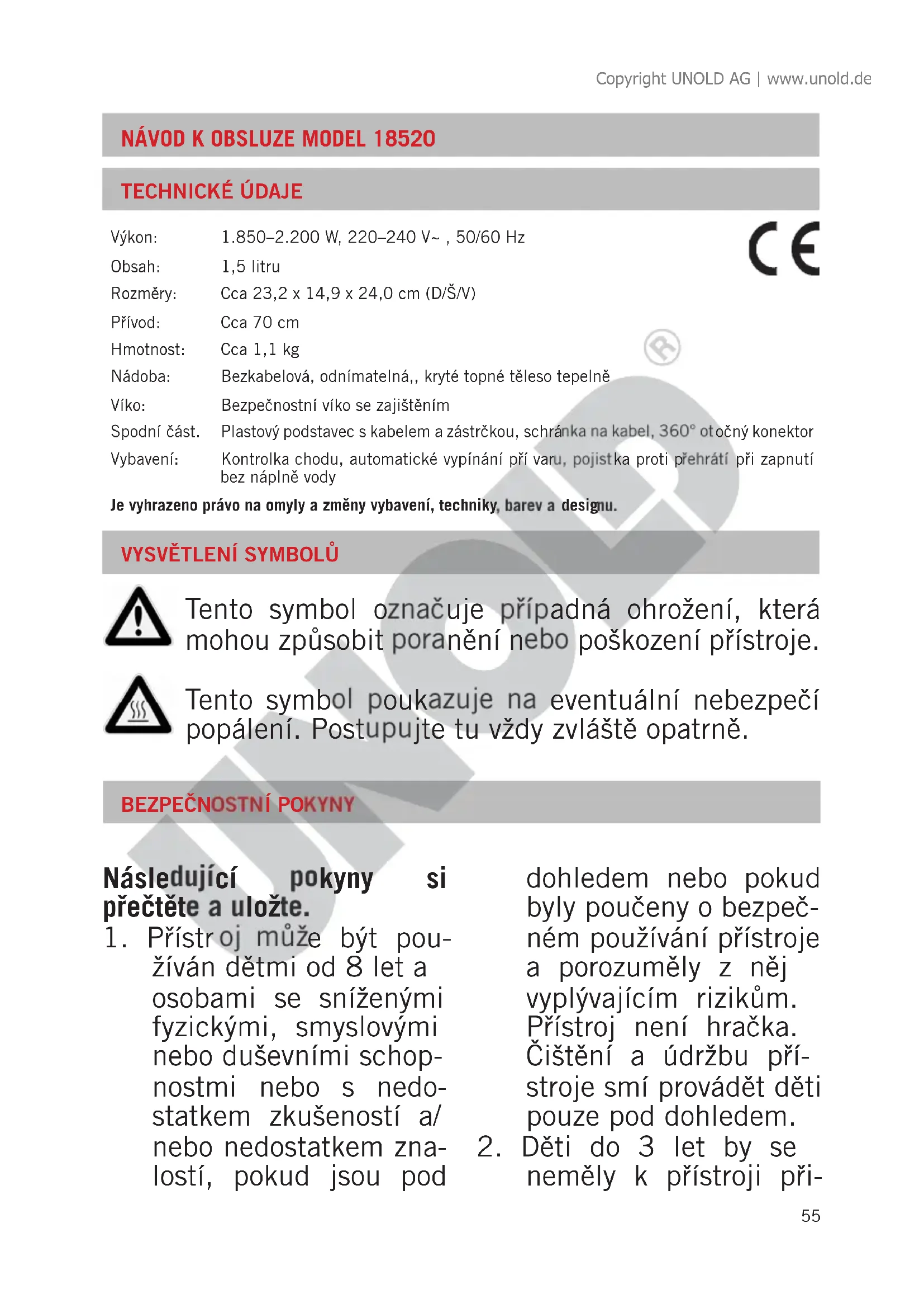 Tento symbol označuje případná ohrožení, která mohou způsobit poranění nebo poškození přístroje. Tento symbol poukazuje na eventuální nebezpečí popálení. Postupujte tu vždy zvláště opatrně. Výkon: 1.850–2.200W, 220–240V~ , 50/60 Hz Obsah: 1,5 litru Rozměry: Cca 23,2 x 14,9 x 24,0 cm (D/Š/V) Přívod: Cca 70 cm Hmotnost: Cca 1,1 kg Nádoba: Bezkabelová, odnímatelná,, kryté topné těleso tepelně Víko: Bezpečnostní víko se zajištěním Spodní část. Plastový podstavec s kabelem a zástrčkou, schránka na kabel, 360° otočný konektor Vybavení: Kontrolka chodu, automatické vypínání pří varu, pojistka proti přehrátí při zapnutí bez náplně vody Je vyhrazeno právo na omyly a změny vybavení, techniky, barev a designu. Copyright UNOLD AG | www.unold.de56 bližovat nebo být pod trvalým dohledem.
