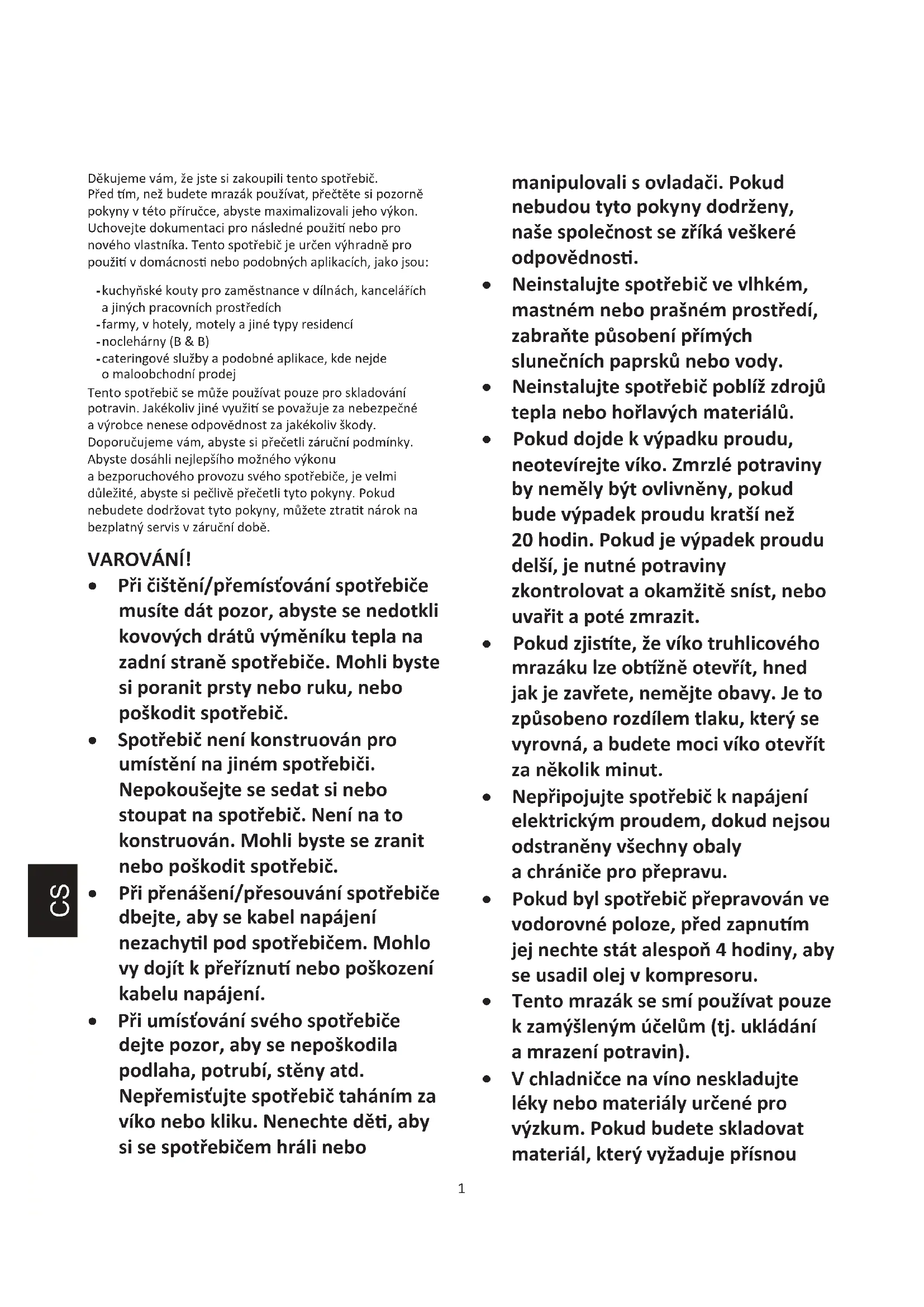 V chlaĚŶiēĐe Ŷa víŶo ŶĞskladujte lĠŬy ŶĞďo materiály urēĞŶĠ pro výzku m. Pokud budete skladovat materiál, který vyǎaduje pƎísŶou CS2 kontrolu teploty skladování, je moǎné, ǎe dojde k jeho znehodnocení nebo mƽǎe dojít k nekontrolované reakci a vzniku nebezpeēí. x PƎed jakoukoliv manipulací se spotƎebiēem, odpojte kabel napájení od zásuvky. x PƎi dodání zkontrolujte, ǎe produkt není poškozen a ǎe všechny souēásƟ a pƎíslušenství jsou v dokonalém stavu. x Pokud dojde k úniku chladiva, nedotýkejte se zásuvky a nepouǎşvejte otevƎený oheŸ. OtevƎete okno a vyvĢtrejte. Poté zavolejte servisní stƎedisko a poǎĄdejte o opravu. x Nepouǎşvejte prodluǎovací kabely nebo adaptéry. x Netahejte a neohýbejte kabel napájení, nedotýkejte se zásuvky mokrýma rukama. x VyŚŶĢte se poškození zástrēky nebo kabelu napájení; mohlo by dojít k úrazu elektrickým proudem nebo poǎĄru. x Neumisƛujte ani neukládejte hoƎlavé nebo vysoce prchavé látky, jako jsou éter, benzín, LPG, propan, aerosolové nádoby, lepidla,ēistý alkohol atd. Tyto materiály mohou zƉƽsobit výbuch. x Je-li napájecí kabel poškozen, musí jej vymĢŶit výrobce, jeho servisní technik nebo podo ďŶĢ kvaliĮkovaný technik, aby nedošlo ke vzniku nebezpeēných situací. x Pobůşǎ chladniēky na víno nepouǎşvejte ani neukládejte hoƎlavé spreje, jako jsou barvy ve spreji. Mohlo by dojít k výbuchu nebo poǎĄru. x Na horní stranu spotƎebiēe nepokládejte pƎedmĢty nebo nádoby s vodou. x Nedoporuēujeme pouǎşvat prodluǎovací kabely ani síƛové adaptéry. x Nelikvidujte spotƎebiēspálením. PƎi pƎepravĢ a pouǎşvání spotƎebiēe dbejte, aby nedošlo k poškození okruhu/potrubí chladiva. V pƎípaĚĢ poškození nevystavuj te spotƎebiē ohni, zdroũƽm vznícení a okĂŵǎŝtĢ vyvĢtrejte místnost, ve které je spotƎebiēumístĢŶ x Systém chlazení umístĢŶý za a uvnitƎ chladniēky na víno obsahuje chladivo. ZabraŸte poškození potrubí. x UvnitƎ prostoru pro skladování potravin ve spotƎebiēi nepouǎşvejte elektrické spotƎebiēe, pokud se nejedná o spotƎebiēe doporuēené výrobcem. x Nepoškoěte okruh chladiva. x Nepouǎşvejte mechanické nástroje ani jinak neurychlujte proces rozmrazování. Pouǎşvejte pouze prostƎedky doporuēené výrobcem. x UvnitƎ prostoru pro skladování potravin nepouǎşvejte elektrické spotƎebiēe, pokud se nejedná ospotƎebiēe doporuēené výrobcem. x Otvory pro venƟůĂci spotƎebiēe nebo skƎíŶĢ, ve které je spotƎebiē vestavĢŶ, udrǎujte volné bez CS3 pƎekĄǎek. x Pro odstraŸování námrazy nepouǎşvejte špiēaté nebo ostré pƎedmĢty. x Nedotýkejte se vnitƎních chladicích prvkƽ, a to obzvláštĢ pokud máte mokré ruce, protoǎe byste se mohli popálit nebo zranit. x Na pomoc odmrazování nikdy nepouǎşvejte vysoušeēe vlasƽ elektrické ohƎívaēe a jiné podobné elektrické spotƎebiēe. x Námrazu neškrábejte noǎem nebo ostrými pƎedmĢty. Mohlo by dojít k poškození okruhu chladiva a vyteklé chladivo mƽǎe zƉƽsobit poǎĄr nebo poškození zraku. x Nepouǎşvejte ǎĄdná mechanická zaƎízení pro urychlení procesu rozmrazování. x Je absolutŶĢ nezbytné zabránit pouǎşvání otevƎeného oŚŶĢ nebo elektrických pƎístroũƽ, jako jsou ohƎívaēe, parní ēis Ɵēe, svíēky, olejové lampy a podobné, pro zrychlení fáze rozmrazování. x Okolí kompresoru nikdy nemyjte vodou. Po vyēištĢŶí, abyste zabránili korozi, ĚƽŬlaĚŶĢ je otƎete suchým hadrem. x Doporuēuje se udrǎovat zástrēku v ēistotĢ. Nánosy prachu na zástrēce mohou zƉƽsobit poǎĄr. x Produkt ve urēen a vyroben pouze pro pouǎŝơ v domácnosƟ. x Tato záruka pozbude platnosƟ, pokud je produkt instalován nebo pouǎşván v komerēních nebo nerezidenēních prostorách. x Tento produkt musí být správŶĢ instalován, umístĢŶ a provozován v souladu s pokyny uvedenými v broǎuƎe Pokyny pro uǎŝvatele. x Tato záruka je platná pouze pro nové produkty a není pƎenosná, pokud je produkt znovu prodán. x Naše spoleēnost vyluēuje odpovĢĚŶost za náhodné nebo následné škody. x Záruka v ǎĄdném pƎípaĚĢ neruší vaše práva vyplývající z pƎedpisƽ nebo zákoŶƽ x Chladniēku na víno neopravujte. Všechny opravy musí prováĚĢƚ pouze kvaliĮkovaný opraváƎ. BEZPENOST D dÍ! x Pokud likvidujete produkt se zámkem nebo západkou na dveƎích, zajistĢte, aby byly dveƎe v bezpeēné poloze, aby se v produktu nemohly zavƎít ĚĢƟ. x Tento spotƎebiēmohou pouǎşvat ĚĢƟ starší 8 let a osoby s omezenými fyzickými, senzorickými nebo mentálními schopnostmi nebo osoby nezkušené a neznalé za pƎedpokladu, ǎe je zajištĢŶ dostateēný dohled nebo jsou poskytnuty dostateēné pokyny, jak pouǎşvat spotƎebiēbezpeēným zƉƽsobem, a ǎe osoby rozumí moǎným riziŬƽm. x DĢƟ si nesmí se spotƎebiēem hrát. istĢŶí a uǎŝvatelskou údrǎbu nesmí prováĚĢt ĚĢƟ bez dozoru. ͻ Tento spotƎebiē smĢũí naplŸovat a vyprazĚŸovat ĚĢƟ ve vĢŬƵ od 3 do 8 let. CS4 VAROVÁNÍ! PƎiumisƛování spotƎebiēe zajistĢte, aby se napájecí kabel nezachy nebo nepoškodil. VAROVÁNÍ! V zadní ēás spotƎebiēe neumisƛujte více pƎenosných zásuvek nebo pƎenosných zdrojƽ Dodrǎujte následující pokyny, abyste zabránili kontaminaci potravin. ͻ Otevírání dveƎí na dlouhou dobu mƽǎezpƽsobit výrazné zvýšení teploty v pƎihrádkách spotƎebiēe. ͻ istĢte pravidelnĢ povrchy, které mohou pƎijít do kontaktu s potravinami, a pƎístupné odvoĚŸovací systémy. ͻ istĢte nádrǎe na vodu, pokud nebyly pouǎity po dobu 48 hodin; pokud voda nebyla ēerpána po dobu 5dnƽ,propláchnĢte vodní systém ƉƎipojený k pƎívodu vody. ͻ Syrové maso a ryby skladujte ve vhodných nádobách v chladniēce tak, aby nedocházelo ke k