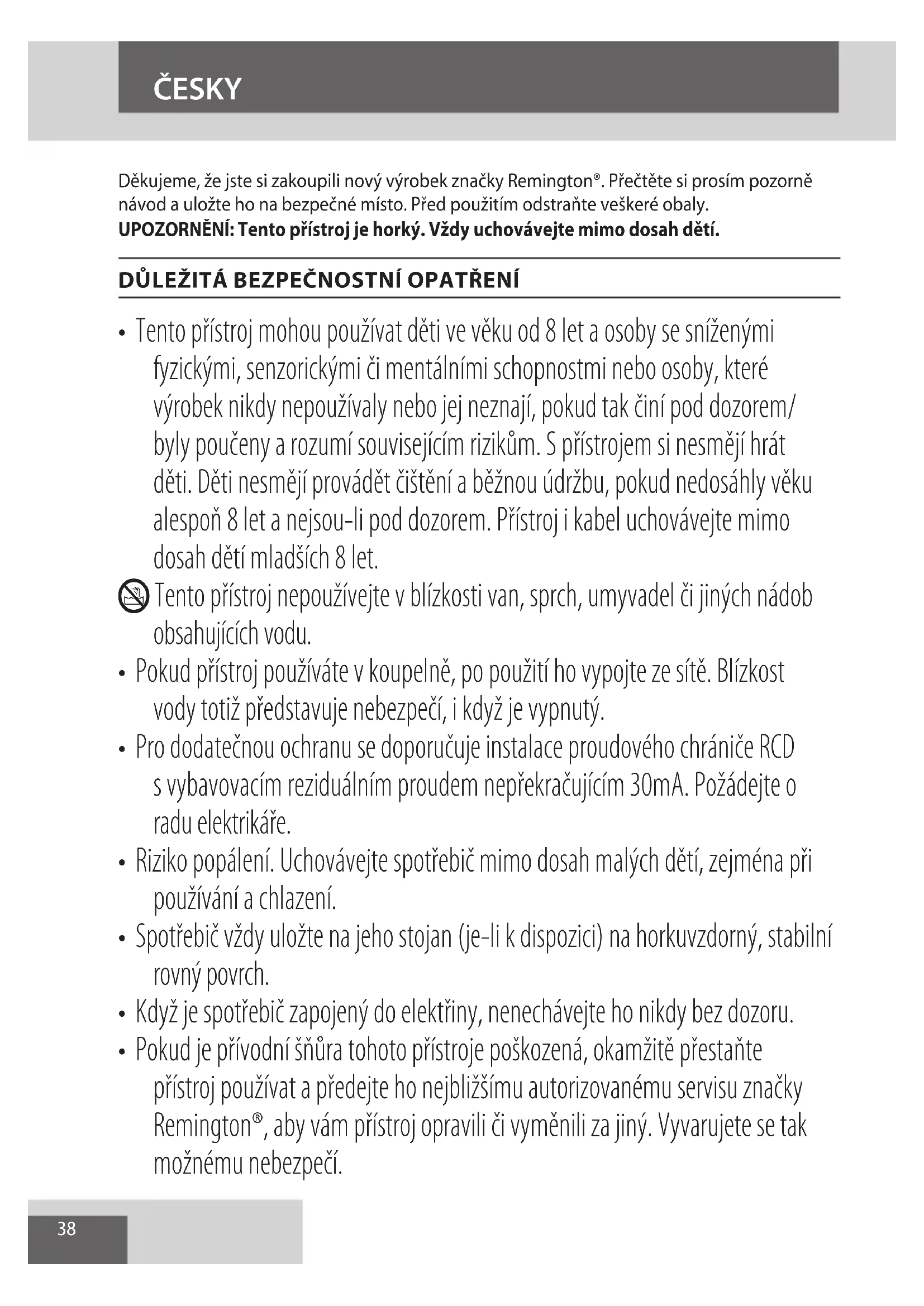 - Pokud je přívodní šňůra tohoto přístroje poškozená, okamžitě přestaňte přístroj používat a předejte ho nejbližšímu autorizovanému servisu značky Remington®, aby vám přístroj opravili či vyměnili za jiný. Vyvarujete se tak možnému nebezpečí. ČESKY39