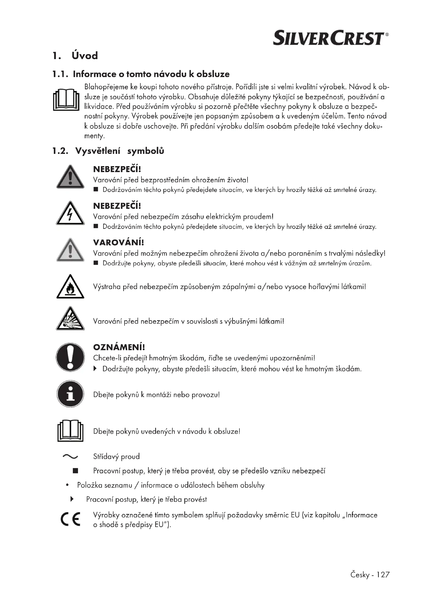 1.1. Informace otomto návodu kobsluze Blahopřejeme ke koupi tohoto nového přístroje. Pořídili jste si velmi kvalitní výrobek. Návod kob- sluze je součástí tohoto výrobku. Obsahuje důležité pokyny týkající se bezpečnosti, používání a likvidace. Před používáním výrobku si pozorně přečtěte všechny pokyny kobsluze a bezpeč- nostní pokyny. Výrobek používejte jen popsaným způsobem a kuvedeným účelům. Tento návod kobsluze si dobře uschovejte. Při předání výrobku dalším osobám předejte také všechny doku- menty. 1.2. Vysvětlení symbolů NEBEZPEČÍ! Varování před bezprostředním ohrožením života! Dodržováním těchto pokynů předejdete situacím, ve kterých by hrozily těžké až smrtelné úrazy. NEBEZPEČÍ! Varování před nebezpečím zásahu elektrickým proudem! Dodržováním těchto pokynů předejdete situacím, ve kterých by hrozily těžké až smrtelné úrazy. VAROVÁNÍ! Varování před možným nebezpečím ohrožení života a/nebo poraněním strvalými následky! Dodržujte pokyny, abyste předešli situacím, které mohou vést kvážným až smrtelným úrazům. Výstraha před nebezpečím způsobeným zápalnými a/nebo vysoce hořlavými látkami! Varování před nebezpečím vsouvislosti svýbušnými látkami! OZNÁMENÍ! Chcete-li předejít hmotným škodám, řiďte se uvedenými upozorněními! Dodržujte pokyny, abyste předešli situacím, které mohou vést ke hmotným škodám. Dbejte pokynů kmontáži nebo provozu! Dbejte pokynů uvedených vnávodu kobsluze! Střídavý proud