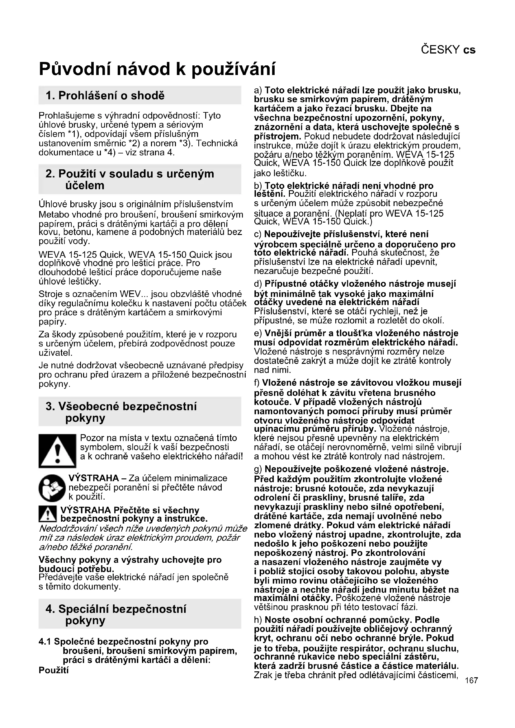 Původní návod k používání Prohlašujeme s výhradní odpovědností: Tyto úhlové brusky, určené typem a sériovým číslem *1), odpovídají všem příslušným ustanovením směrnic *2) a norem *3). Technická dokumentace u *4) – viz strana 4. Úhlové brusky jsou s originálním příslušenstvím Metabo vhodné pro broušení, broušení smirkovým papírem, práci s drátěnými kartáči a pro dělení kovu, betonu, kamene a podobných materiálů bez použití vody. WEVA 15-125 Quick, WEVA 15-150 Quick jsou doplňkově vhodné pro lešticí práce. Pro dlouhodobé lešticí práce doporučujeme naše úhlové leštičky. Stroje s označením WEV... jsou obzvláště vhodné díky regulačnímu kolečku k nastavení počtu otáček pro práce s drátěným kartáčem a smirkovými papíry. Za škody způsobené použitím, které je v rozporu s určeným účelem, přebírá zodpovědnost pouze uživatel. Je nutné dodržovat všeobecně uznávané předpisy pro ochranu před úrazem a přiložené bezpečnostní pokyny. Pozor na místa v textu označená tímto symbolem, slouží k vaší bezpečnosti a k ochraně vašeho elektrického nářadí! VÝSTRAHA – Za účelem minimalizace nebezpečí poranění si přečtěte návod k použití. VÝSTRAHA Přečtěte si všechny bezpečnostní pokyny a instrukce. Nedodržování všech níže uvedených pokynů může mít za následek úraz elektrickým proudem, požár a/nebo těžké poranění. Všechny pokyny a výstrahy uchovejte pro budoucí potřebu. Předávejte vaše elektrické nářadí jen společně s těmito dokumenty.