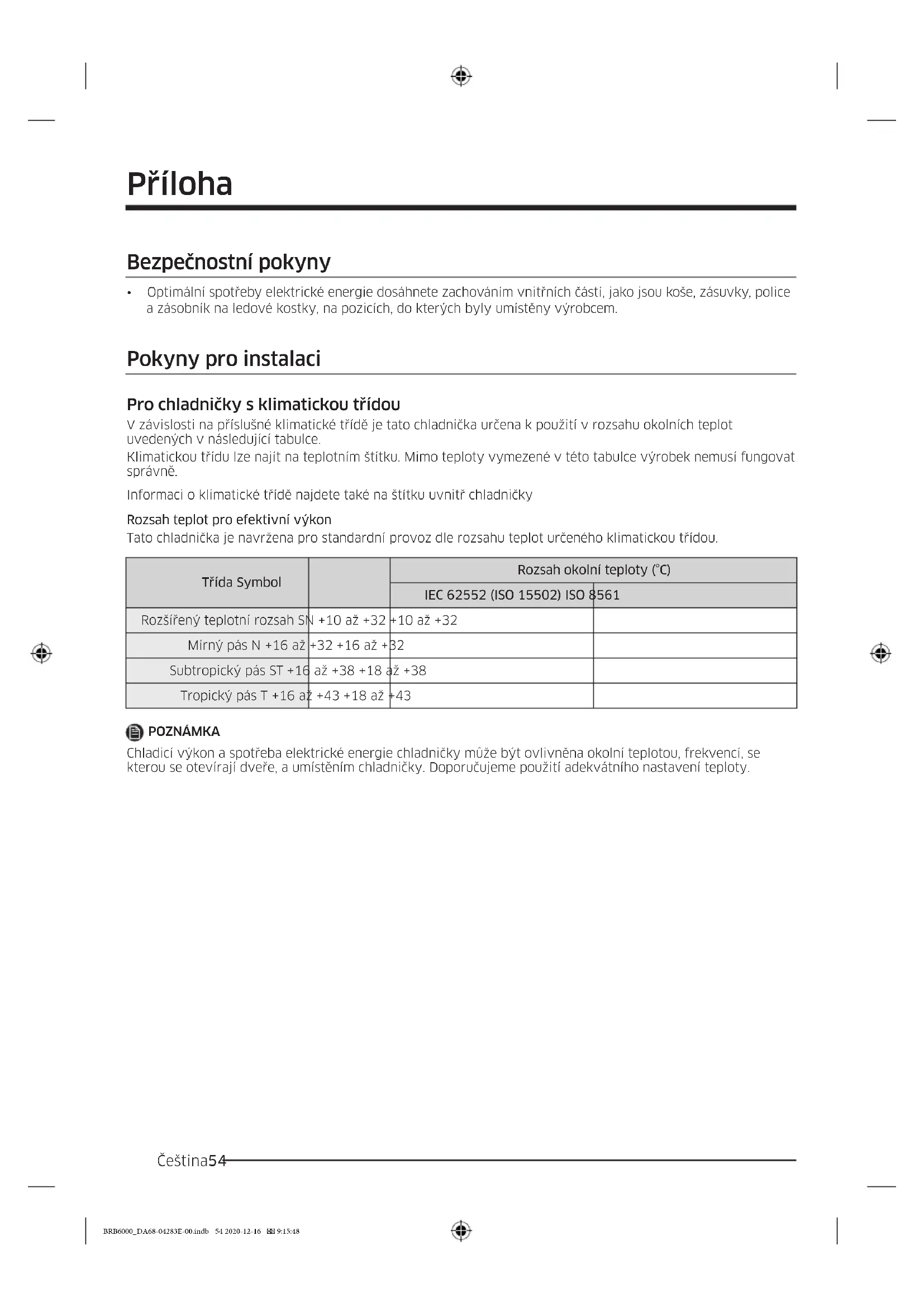 Rozšířený teplotní rozsah SN +10 až +32 +10 až +32 Mírný pás N +16 až +32 +16 až +32 Subtropický pás ST +16 až +38 +18 až +38 Tropický pás T +16 až +43 +18 až +43 POZNÁMKA Chladicí výkon a spotřeba elektrické energie chladničky může být ovlivněna okolní teplotou, frekvencí, se kterou se otevírají dveře, a umístěním chladničky. Doporučujeme použití adekvátního nastavení teploty. BRB6000_DA68-04283E-00.indb 54 2020-12-16 9:15:48Čeština 55 Pokyny ohledně teploty Doporučená teplota Optimální nastavení teploty pro skladování potravin: