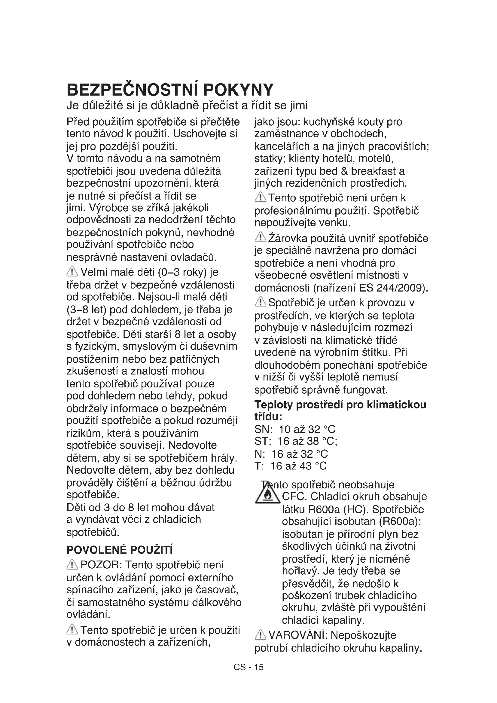 POZOR: Tento spotřebič není určen k ovládání pomocí externího spínacího zařízení, jako je časovač, či samostatného systému dálkového ovládání. Tento spotřebič je určen k použití v domácnostech a zařízeních, jako jsou: kuchyňské kouty pro zaměstnance v obchodech, kancelářích a na jiných pracovištích; statky; klienty hotelů, motelů, zařízení typu bed & breakfast a jiných rezidenčních prostředích. Tento spotřebič není určen k profesionálnímu použití. Spotřebič nepoužívejte venku. Žárovka použitá uvnitř spotřebiče je speciálně navržena pro domácí spotřebiče a není vhodná pro všeobecné osvětlení místnosti v domácnosti (nařízení ES 244/2009). Spotřebič je určen k provozu v prostředích, ve kterých se teplota pohybuje v následujícím rozmezí v závislosti na klimatické třídě uvedené na výrobním štítku. Při dlouhodobém ponechání spotřebiče v nižší či vyšší teplotě nemusí spotřebič správně fungovat. Teploty prostředí pro klimatickou třídu: SN: 10 až 32 °C ST: 16 až 38 °C; N: 16 až 32 °C T: 16 až 43 °C Tento spotřebič neobsahuje CFC. Chladicí okruh obsahuje látku R600a (HC). Spotřebiče obsahující isobutan (R600a): isobutan je přírodní plyn bez škodlivých účinků na životní prostředí, který je nicméně hořlavý. Je tedy třeba se přesvědčit, že nedošlo k poškození trubek chladicího okruhu, zvláště při vypouštění chladicí kapaliny. VAROVÁNÍ: Nepoškozujte potrubí chladicího okruhu kapaliny.CS - 16 VAROVÁNÍ: Větrací otvory v plášti spotřebiče nebo ve vestavěné konstrukci nesmí být zakryty. VAROVÁNÍ: Neurychlujte odmrazování jinými mechanickými, elektrickými a chemickými postupy, než jaké doporučuje výrobce. VAROVÁNÍ: Do oddílů spotřebiče neumisťujte, ani v nich nepoužívejte elektrické přístroje, které nejsou výslovně schváleny výrobcem. VAROVÁNÍ: Výrobníky ledu a dávkovače vody, které nejsou přímo připojeny k přívodu vody, musí být plněny pouze pitnou vodou. VAROVÁNÍ: Automatické tvořiče ledu a/nebo nádobky na vodu musí být připojeny výhradně k přívodu pitné vody s tlakem v rozmezí 0,17 až 0,81 MPa (1,7 až 8,1 bar). Neumisťujte do zařízení nebo v jeho blízkosti výbušné látky, jako např. plechovky s aerosoly, a neskladujte ani nemanipulujte zde s benzínem či jinými hořlavými materiály. Je-li váš model vybaven chladicími vložkami, nepijte kapalinu, která je v nich obsažena (není toxická). Nejezte ledové kostky nebo ledová lízátka ihned po vyjmutí z mrazničky, mohly by vám způsobit omrzliny v ústech. Je-li výrobek určen k použití se vzduchovým ltrem v přístupném krytu ventilátoru, musí být ltr vložen vždy, když je chladnička zapnutá. Do mrazničky nevkládejte skleněné nádoby s tekutinami, neboť by mohly prasknout. Nezakrývejte ventilátor (je-li jím spotřebič vybaven) potravinami. Po vložení potravin zkontrolujte, zda jste správně zavřeli dvířka, zejména pak dvířka mrazničky. Poškozené těsnění je nutné co nejdříve vyměnit. Chladicí oddíl používejte pouze k uchovávání čerstvých potravin a mrazicí oddíl pouze k uchovávání zmrazených potravin, zmrazování čerstvých potravin a k výrobě ledových kostek. Vyvarujte se skladování nezabalených potravin v přímém kontaktu s vnitřními povrchy chladničky nebo mrazničky. Spotřebiče mohou obsahovat speciální přihrádky (přihrádka na čerstvé potraviny, přihrádka s nulovou teplotou, ...). Není-li v příručce ke konkrétnímu výrobku uvedeno jinak, tyto přihrádky je možné vyjmout, aniž by to mělo vliv na výkon spotřebiče. Cyklopentan se používá jako nadouvadlo v izolační pěně a je hořlav Nejvhodnější oddíly spotřebiče pro skladování různých druhů potravin s ohledem na distribuci tepla v oddílech spotřebiče jsou následující: