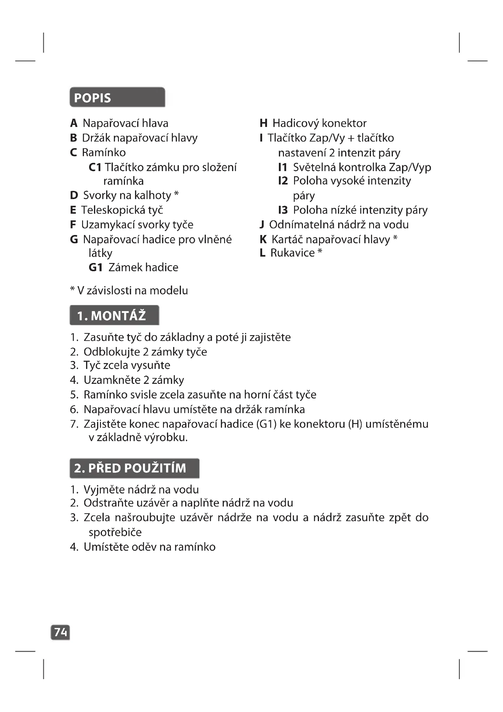 - Nigdy nie myj ani nie płucz urządzenia bezpośrednio nad zlewem.74 POPIS A Napařovací hlava B Držák napařovací hlavy C Ramínko C1 Tlačítko zámku pro složení ramínka D Svorky na kalhoty * E Teleskopická tyč F Uzamykací svorky tyče G Napařovací hadice pro vlněné látky G1 Zámek hadice H Hadicový konektor I Tlačítko Zap/Vy + tlačítko nastavení 2 intenzit páry I1 Světelná kontrolka Zap/Vyp I2 Poloha vysoké intenzity páry I3 Poloha nízké intenzity páry J Odnímatelná nádrž na vodu K Kartáč napařovací hlavy * L Rukavice *