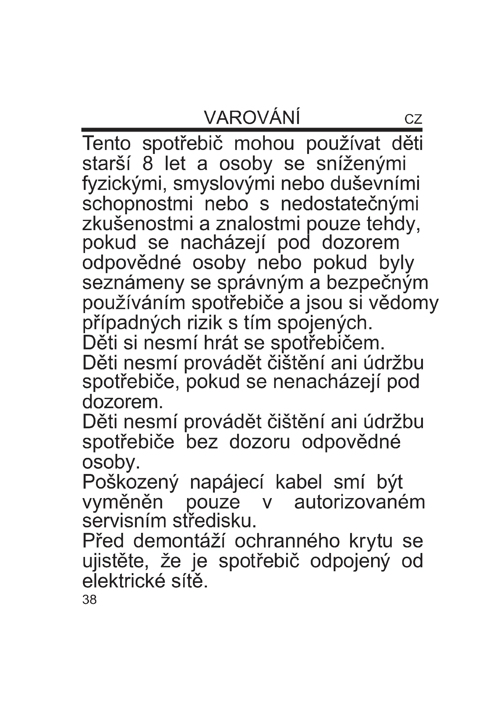 “Aplicación de la Directiva 2012/19/EU sobre Residuos de Aparatos Eléctricos y Electrónicos (RAEE)”, concerniente al uso reducido de sustancias peligrosas en equipos eléctricos y electrónicos, así como a la eliminación de residuos”. El símbolo del contenedor marcado con una X señalado en el equipo o en la confección indica que el producto al nal de su vida útil debe ser recogido separadamente de los otros desechos. El usuario por lo tanto tendrá que entregar el equipo que llegó al nal de su vida a los centros comunales de recogida diferenciada de desechos eléctricos y electrónicos idóneos. Para más detalles, por favor contactar a la autoridad local correspondiente. La adecuada recogida diferenciada para el envío sucesivo del equipo al reciclaje, al tratamiento y a la eliminación ambientalmente compatible contribuye a evitar posibles efectos negativos en el ambiente y en la salud y favorece el reutilizo y/o reciclado de los materiales que componen el equipo. La eliminación abusiva del producto por parte del usuario dará lugar a la aplicación de multas administrativas de conformidad con las leyes en vigor. ELIMINACIÓN EMBALAJE Con el n de respetar el medio ambiente, el material de embalaje debe ser eliminado correctamente de acuerdo con la recogida selectiva. Compruebe la normativa local.37 GARANTÍA Condiciones La garantía tiene validez de 24 meses desde la fecha de la compra. La presente garantía es válida solo si es correctamente llenada y acompañada de la factura scal que certica la fecha de la compra. El aparato debe ser entregado exclusivamente en un Centro de Asistencia nuestro autorizado. Por garantía se entiende la sustitución o la reparación de los componentes del aparato que resultan defectuosos en el origen por defectos de fabricación. Está de todos modos garantizada la asistencia (con pago) incluso en productos fuera de garantía. El consumidor es titular de los derechos aplicables por la legislación nacional que disciplina la venta de los bienes de consumo; esta garantía deja no perjudica estos derechos. La Casa fabricante declina toda responsabilidad por eventuales daños a personas, animales o cosas, consecuencia de uso inadecuado del aparato y la inobservancia de las prescripciones indicadas en el respectivo manual de instrucciones. Limitaciones Todo derecho de garantía y toda responsabilidad nuestra decaen si el aparato ha sido: -Manipulado por parte de personal no autorizado. -Empleado, conservado o transportado de manera inadecuada. Están de todos modos excluidas de la garantías las pérdidas de prestaciones estéticas o tales de no comprometer la sustancia de las funciones. Si, no obstante el cuidado en la selección de los materiales y el empeño en la realización del producto que ha apenas comprado se detectaran defectos, o en caso de que necesitara información, le recomendamos llamar al revendedor de zona.38 Tento spotřebič mohou používat děti starší 8 let a osoby se sníženými fyzickými, smyslovými nebo duševními schopnostmi nebo s nedostatečnými zkušenostmi a znalostmi pouze tehdy, pokud se nacházejí pod dozorem odpovědné osoby nebo pokud byly seznámeny se správným a bezpečným používáním spotřebiče a jsou si vědomy případných rizik s tím spojených. Děti si nesmí hrát se spotřebičem. Děti nesmí provádět čištění ani údržbu spotřebiče, pokud se nenacházejí pod dozorem. Děti nesmí provádět čištění ani údržbu spotřebiče bez dozoru odpovědné osoby. Poškozený napájecí kabel smí být vyměněn pouze v autorizovaném servisním středisku. Před demontáží ochranného krytu se ujistěte, že je spotřebič odpojený od elektrické sítě. VAROVÁNÍ CZ39 UPOZORNĚNÍ: Pečlivě si přečtěte tento návod k obsluze, který obsahuje důležité pokyny týkající se bezpečné instalace, použití a údržby spotřebiče. Uschovejte tento návod pro případné použití v budoucnu. Děti si nesmí hrát se spotřebičem. Tento spotřebič smí být používán pouze k účelům, ke kterým byl navržen; jakékoliv použití, které není v souladu s pokyny obsaženými v tomto návodu k obsluze, se považuje za nevhodné a nebezpečné. Výrobce nenese odpovědnost za možné škody způsobené nevhodným a/nebo nepřiměřeným použitím. Tento spotřebič NENÍ vhodný k použití v prostředí, kde hrozí nebezpečí výbuchu (tam, kde se vyskytují hořlavé látky, jako je plyn, pára, mlha nebo prach, za atmosférických podmínek, kdy se spaliny po zapálení šíří ve vzduchu). Obalové materiály (igelitové sáčky, polystyren atd.) musíte uchovávat mimo dosah dětí nebo zdravotně postižených osob, protože představují potenciální zdroj nebezpečí. Instalace/montáž spotřebiče musí být provedena podle pokynů výrobce. Špatný postup může způsobit poranění osob či zvířat nebo poškození předmětů, za které výrobce nenese žádnou odpovědnost. Umístěte spotřebič na horizontální a stabilní povrch. Před prvním použitím spotřebiče zkontrolujte, zda nedošlo k poškození napájecího kabelu nebo samotného spotřebiče během přepravy. Pokud si nejste jistí, obraťte se na kvalikovanou osobu. Před prvním připojením spotřebiče k elektrické síti se ujistěte, že jmenovitý výkon (napětí a frekvence) spotřebiče odpovídá Vaší elektrické síti a že zásuvka je vhodná pro zástrčku spotřebiče. Ujistěte se, že napájecí systém je vybaven vhodnou ochranou podle platných zákonů. NEPŘIPOJUJTE spotřebič k vícenásobné zásuvce. Pokud je to možné, vyvarujte se použití adaptérů a/nebo prodlužovacích kabelů; pokud je jejich použití naprosto nezbytné, používejte pouze materiály, které odpovídají současným bezpečnostním předpisům a vyhovují elektrickým parametrům spotřebiče. Nepoužívejte spotřebič spolu s externím časovačem a/nebo jiným zaří