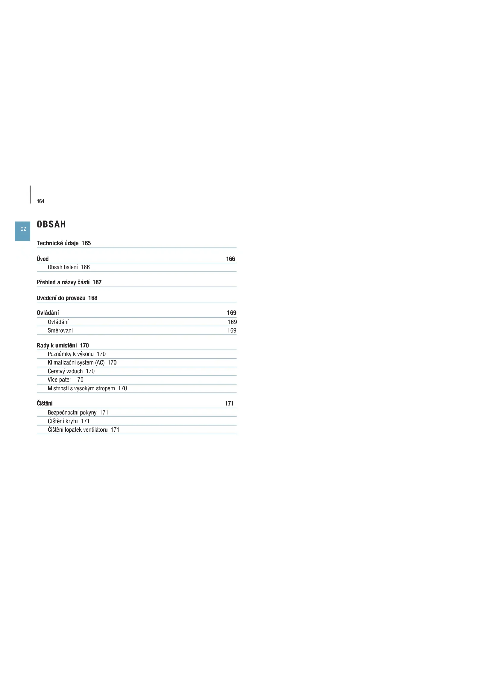 OBSAH Technické údaje 165 Úvod 166 Obsah balení 166 Přehled anázvy částí 167 Uvedení do provozu 168 Ovládání 169 Ovládání 169 Směrování 169 Rady kumístění 170 Poznámky kvýkonu 170 Klimatizační systém (AC) 170 Čerstvý vzduch 170 Více pater 170 Místnosti svysokým stropem 170 Čištění 171 Bezpečnostní pokyny 171 Čištění krytu 171 Čištění lopatek ventilátoru 171165