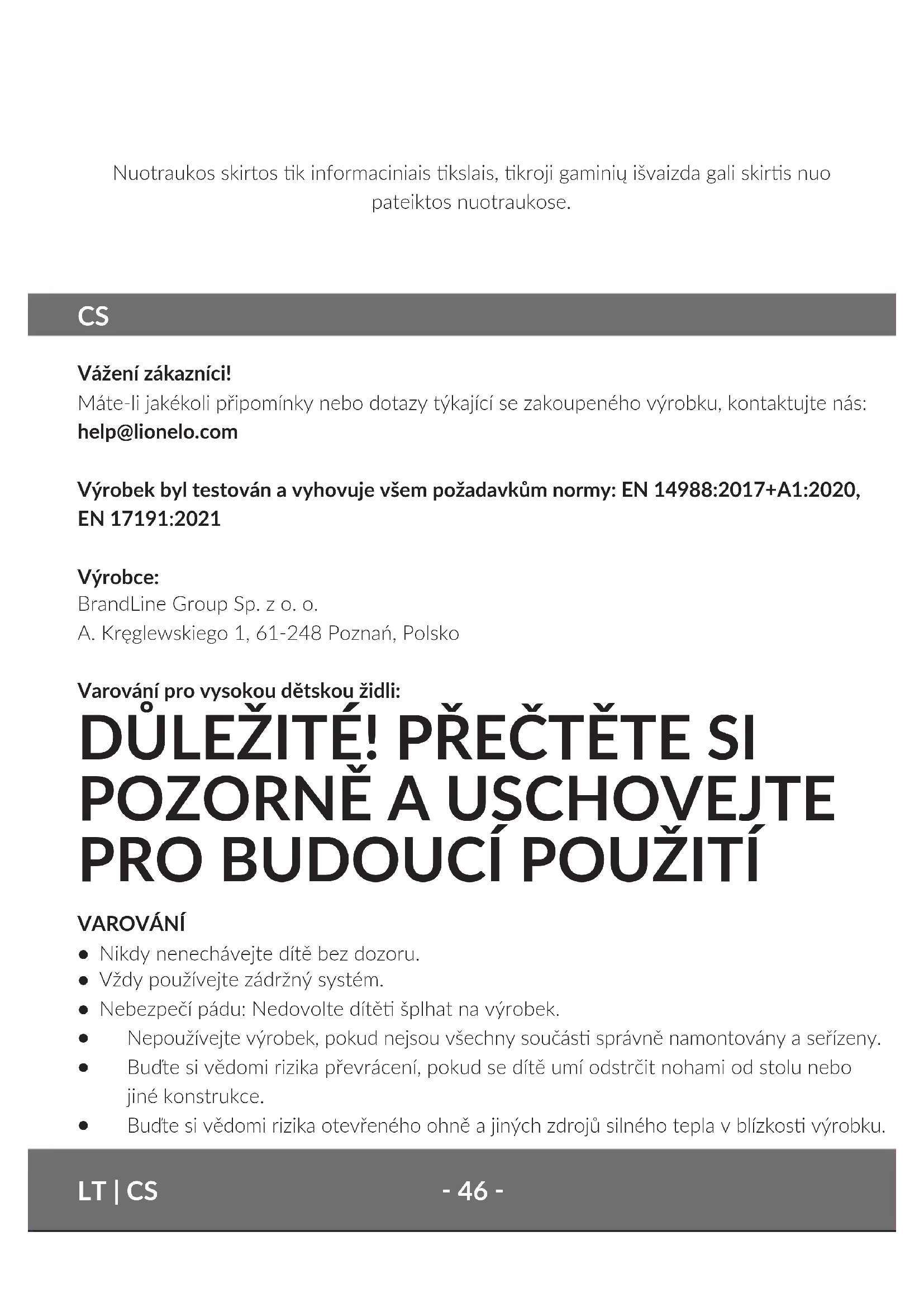 Vážení zákazníci! Máte-li jakékoli připomínky nebo dotazy týkající se zakoupeného výrobku, kontaktujte nás: help@lionelo.com Výrobek byl testován a vyhovuje všem požadavkům normy: EN 14988:2017+A1:2020, EN 17191:2021 Výrobce: BrandLine Group Sp. z o. o. A. Kręglewskiego 1, 61-248 Poznań, Polsko Varování pro vysokou dětskou židli: DŮLEŽITÉ! PŘEČTĚTE SI