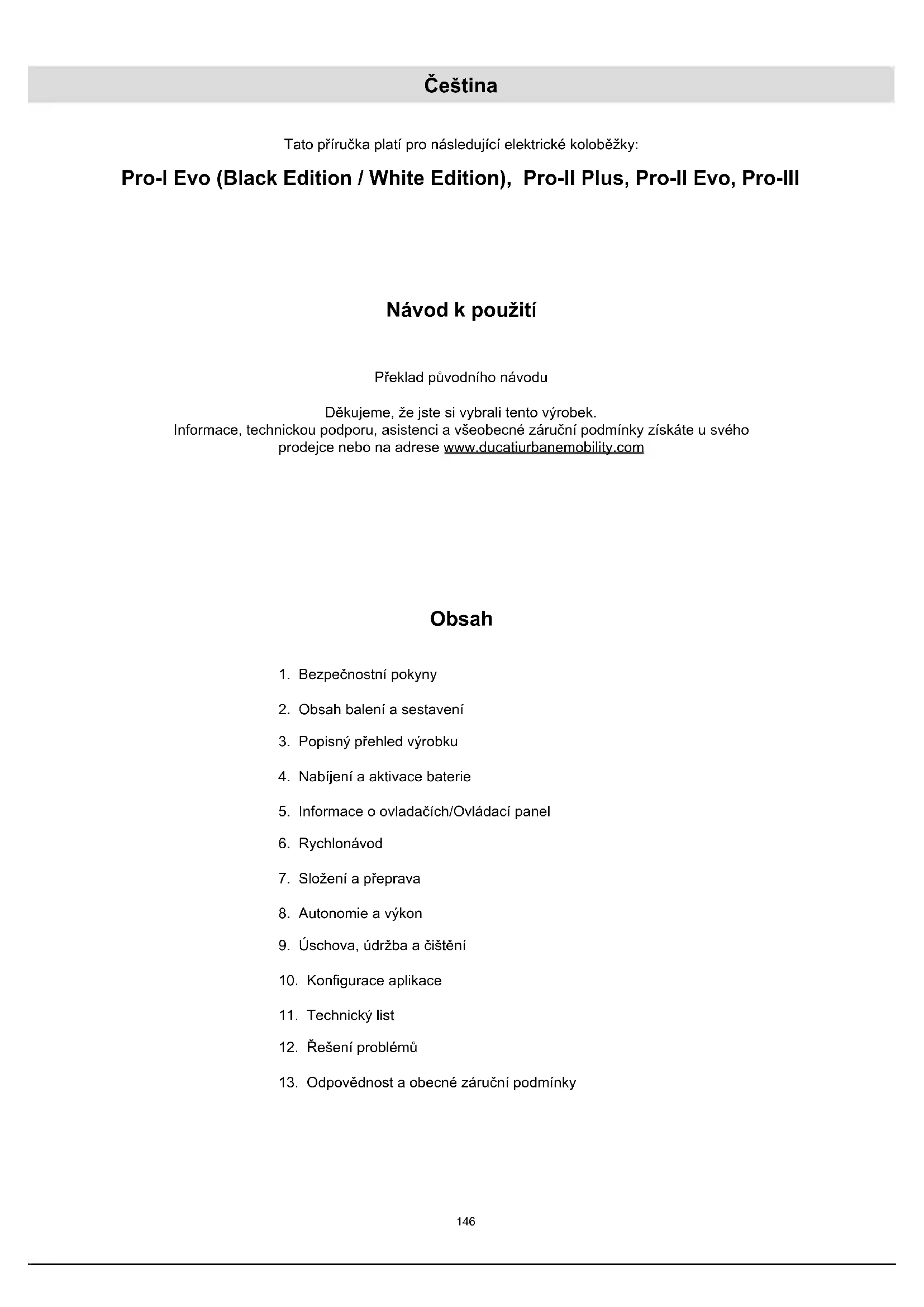 - V prodejnách nových elektrických a elektronických zařízení. Zde je možné bezplatně odevzdat velmi malé OEEZ (s nejdelší Zde je možné bezplatně odevzdat velmi malé OEEZ (s nejdelší stranou menší než 25 cm), zatímco větší lze odevzdat v režimu 1 za 1, tj. odevzdáním starého výrobku při zakoupení nového se stejnými funkcemi. Kromě toho je režim 1 za 1 zaručen vždy při nákupu nového EEZ spotřebitelem, bez ohledu na velikost OEEZ. V případě neoprávněné likvidace elektrického nebo elektronického zařízení mohou být uplatněny sankce stanovené platnými právními předpisy na ochranu životního prostředí (dle italské legislativy, je nutné ověřit předpisy platné v zemi použití/likvidace vozidla). Pokud OEEZ obsahuje baterie nebo akumulátory, musí být odstraněny a podrobeny zvláštnímu oddělenému sběru. POZOR Zpracování vybitých baterií (platí ve všech zemích Evropské unie a v dalších evropských systémech s odděleným sběrem) Tento symbol na výrobku nebo na obalu označuje, že s baterií se nesmí nakládat jako s běžným komunálním odpadem. U některých typů baterií může být tento symbol použit v kombinaci s chemickým symbolem. Pokud baterie obsahuje více než 0,0005% rtuti nebo 0,004% olova, přidávají se chemické symboly pro rtuť (Hg) nebo olovo (Pb). Zajištěním správné likvidace baterií pomáháte předcházet možným negativním dopadům na životní prostředí a zdraví, které by jinak mohly být způsobeny jejich nevhodnou likvidací. Recyklace materiálů pomáhá chránit přírodní zdroje. V případě výrobků, které z důvodu bezpečnosti, výkonu nebo ochrany dat vyžadují pevné připojení k vnitřní baterii, musí být vyměněny pouze kvalikovaným servisním personálem. Po skončení životnosti výrobku jej odevzdejte do vhodných sběren zaměřených na likvidaci elektrických a elektronických zařízení: tím zajistíte, že bude správně naloženo i s baterií uloženou uvnitř. Podrobnější informace o způsobu likvidace použité baterie nebo výrobku získáte od místní služby pro likvidaci odpadu nebo v obchodě, kde jste výrobek zakoupili. V každém případě musí být likvidace provedena v souladu s předpisy platnými v zemi nákupu.170 Návod na použitie Preklad pôvodného návodu Ďakujeme, že ste si vybrali tento výrobok. Pre informácie, technickú podporu, pomoc a konzultáciu o všeobecných záručných podmienkach sa obráťte na svojho predajcu alebo navštívte webové sídlo www.ducatiurbanemobility.com Slovenčina Tento návod platí pre nasledujúce elektrické kolobežky: Pro-I Evo (Black Edition / White Edition), Pro-II Plus, Pro-II Evo, Pro-III