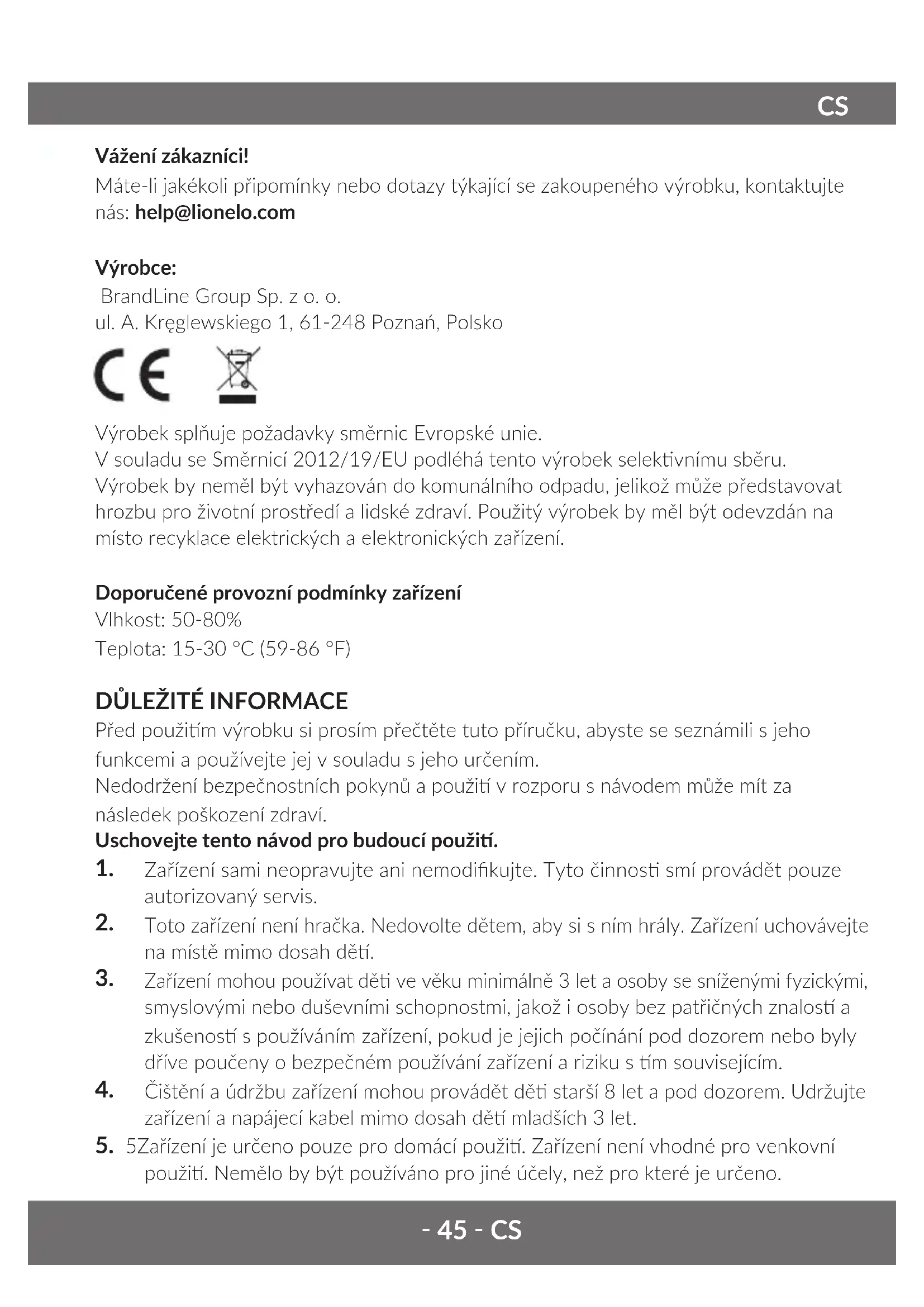 Vážení zákazníci! Máte-li jakékoli připomínky nebo dotazy týkající se zakoupeného výrobku, kontaktujte nás: help@lionelo.com Výrobce: BrandLine Group Sp. z o. o. ul. A. Kręglewskiego 1, 61-248 Poznań, Polsko Výrobek splňuje požadavky směrnic Evropské unie. V souladu se Směrnicí 2012/19/EU podléhá tento výrobek selekvnímu sběru. Výrobek by neměl být vyhazován do komunálního odpadu, jelikož může představovat hrozbu pro životní prostředí a lidské zdraví. Použitý výrobek by měl být odevzdán na místo recyklace elektrických a elektronických zařízení. Doporučené provozní podmínky zařízení Vlhkost: 50-80% Teplota: 15-30 °C (59-86 °F)
