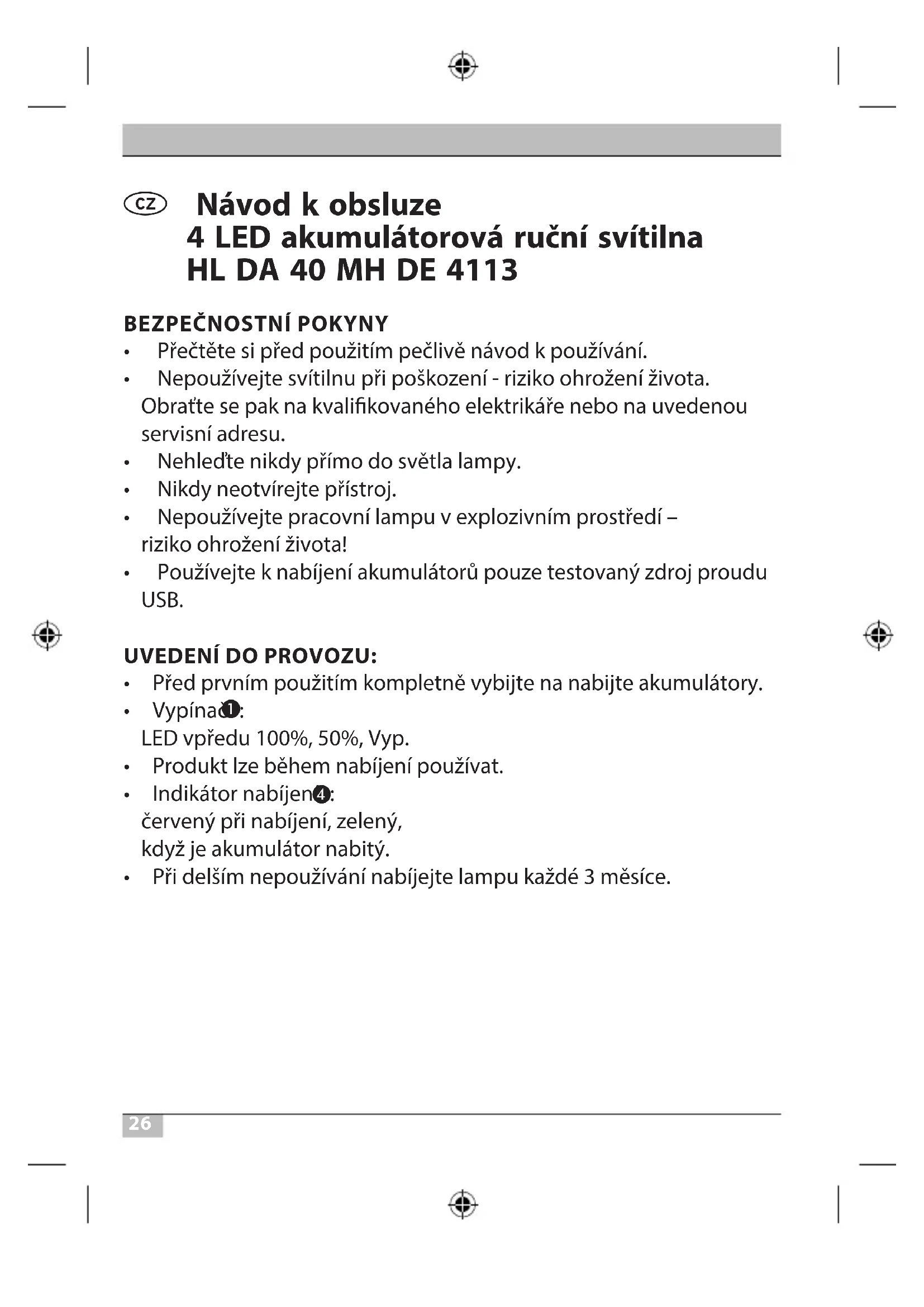 Návod k obsluze 4 LED akumulátorová ruční svítilna HL DA 40 MH DE 4113