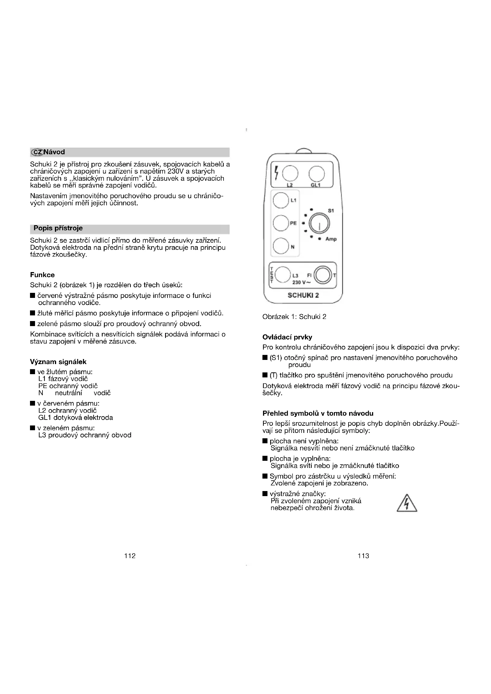 à̉Ë͇ˆËË ÌÂÔÓ·‰ÓÍ ÒıÂÏ˚ Á‡˘ËÚ˚ ÓÚ ÚÓÍÓ‚ ÔÓ‚ÂʉÂÌËfl èÂÂÔÛÚ‡Ì˚ ÏÂÊ‰Û ÒÓ·ÓÈ ÌÂÈڇθÌ˚È Ë Á‡˘ËÚÌ˚È ÔÓ‚Ó‰‡. çÂËÒÔ‡‚̇ ÒıÂχ Á‡˘ËÚ˚ ÓÚ ÚÓÍÓ‚ ÔÓ‚ÂʉÂÌËfl. çÂÔÓ·‰Í‡ ÔÓfl‚ÎflÂÚÒfl Ú‡Í, Í‡Í ÔÓ͇Á‡ÌÓ Ì‡ ËÒ. 10. é‰Ì‡ÍÓ ÒıÂχ Á‡˘ËÚ˚ ÓÚ ÚÓÍÓ‚ ÔÓ‚ÂʉÂÌËfl Ì ҇·‡Ú˚‚‡ÂÚ, ·ÏÔÓ˜ÍË ‚ ÊÂÎÚÓÏ ‰Ë‡Ô‡ÁÓÌ ÔÓ‰ÓÎʇ˛Ú „ÓÂÚ¸. ëÓÔÓÚË‚ÎÂÌË Á‡˘ËÚÌÓ„Ó ÔÓ‚Ó‰‡ ÒÎ˯ÍÓÏ ‚˚ÒÓÍÓÂ. êËÒ. 12: ÉÓflÚ ‚Ò ·ÏÔÓ˜ÍË ‚ ÊÂÎÚÓÏ ‰Ë‡Ô‡ÁÓÌÂ. L3 Á‡„Ó‡ÂÚÒfl ‰ÓÔÓÎÌËÚÂθÌÓ ÔË Ì‡Ê‡ÚËË Í·‚Ë¯Ë T. é‰ÌÓ‚ÂÏÂÌÌÓ „‡ÒÌÂÚ PE, ‡ L2 ‚˚҂˜˂‡ÂÚÒfl ̇ ÍÓÓÚÍÓ ‚ÂÏfl. ëÔÛÒÚfl 200 ÏÒ L3 „‡ÒÌÂÚ, ‡ ·ÏÔÓ˜ÍË ‚ ÊÂÎÚÓÏ ‰Ë‡Ô‡ÁÓÌ ÔÓ‰ÓÎʇ˛Ú „ÓÂÚ¸. ëıÂχ Á‡˘ËÚ˚ ÓÚ ÚÓÍÓ‚ ÔÓ‚ÂʉÂÌËfl Ì ҇·‡Ú˚‚‡ÂÚ. ì Á‡˘ËÚÌÓ„Ó ÔÓ‚Ó‰‡ ̉ÓÔÛÒÚËÏÓ ‚˚ÒÓÍÓ ÒÓÔÓÚË‚ÎÂÌËÂ. ç‡ Á‡˘ËÚÌÓÏ ÍÓÌÚ‡ÍÚ ÏÓÊÂÚ ‚ÓÁÌËÍÌÛÚ¸ ÓÔ‡ÒÌÓ ‰Îfl ÊËÁÌË, ‚˚ÒÓÍÓ ̇ÔflÊÂÌËÂ! R ~ Ì ‰ÓÔÛÒÚËÏÓ Schuki 2 22.01.2004 15:49 Uhr Seite 110112 CZ Návod Schuki 2 je přístroj pro zkoušení zásuvek, spojovacích kabelů a chráničových zapojení u zařízení s napětím 230V a starých zařízeních s ,,klasickým nulováním”. U zásuvek a spojovacích kabelů se měří správné zapojení vodičů. Nastavením jmenovitého poruchového proudu se u chráničo- vých zapojení měří jejich účinnost. Popis přístroje Schuki 2 se zastrčí vidlicí přímo do měřené zásuvky zařízení. Dotyková elektroda na přední straně krytu pracuje na principu fázové zkoušečky. Funkce Schuki 2 (obrázek 1) je rozdělen do třech úseků: y červené výstražné pásmo poskytuje informace o funkci ochranného vodiče. y žluté měřící pásmo poskytuje informace o připojení vodičů. y zelené pásmo slouží pro proudový ochranný obvod. Kombinace svítících a nesvítících signálek podává informaci o stavu zapojení v měřené zásuvce. Význam signálek y ve žlutém pásmu: L1 fázový vodič PE ochranný vodič N neutrální vodič y v červeném pásmu: L2 ochranný vodič GL1 dotyková elektroda y v zeleném pásmu: L3 proudový ochranný obvod