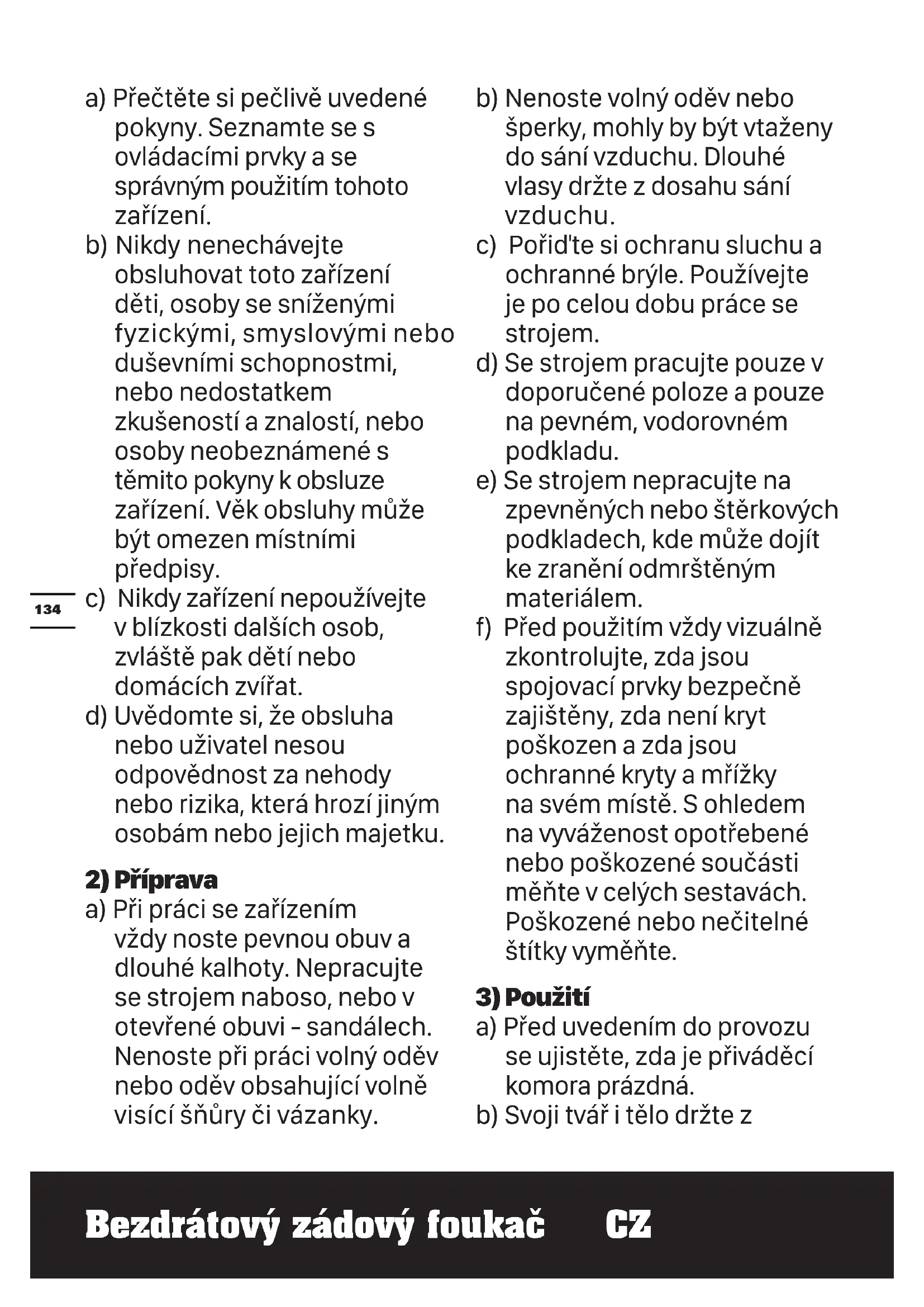 a) Při práci se zařízením vždy noste pevnou obuv a dlouhé kalhoty. Nepracujte se strojem naboso, nebo v otevřené obuvi - sandálech. Nenoste při práci volný oděv nebo oděv obsahující volně visící šňůry či vázanky. b) Nenoste volný oděv nebo šperky, mohly by být vtaženy do sání vzduchu. Dlouhé vlasy držte z dosahu sání vzduchu. c) Pořiďte si ochranu sluchu a ochranné brýle. Používejte je po celou dobu práce se strojem. d) Se strojem pracujte pouze v doporučené poloze a pouze na pevném, vodorovném podkladu. e) Se strojem nepracujte na zpevněných nebo štěrkových podkladech, kde může dojít ke zranění odmrštěným materiálem. f) Před použitím vždy vizuálně zkontrolujte, zda jsou spojovací prvky bezpečně zajištěny, zda není kryt poškozen a zda jsou ochranné kryty a mřížky na svém místě. S ohledem na vyváženost opotřebené nebo poškozené součásti měňte v celých sestavách. Poškozené nebo nečitelné štítky vyměňte.
