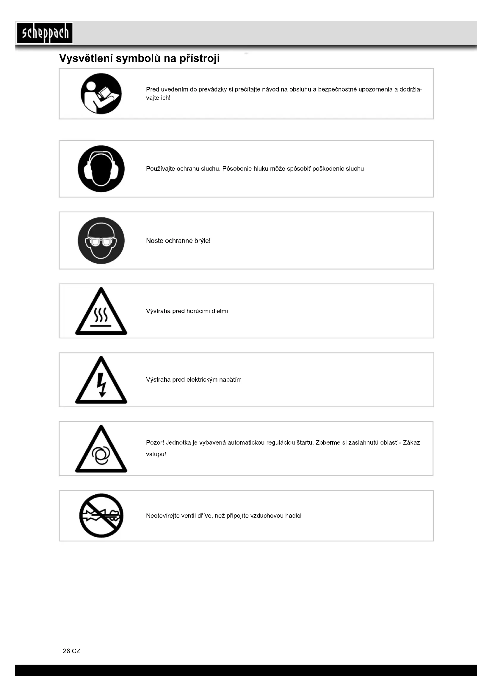 - Contrôler le raccord rapide, le cas échéant, le remplacer26 CZ Vysvětlení symbolů na přístroji Pred uvedením do prevádzky si prečítajte návod na obsluhu a bezpečnostné upozornenia a dodržia- vajte ich! Výstraha pred elektrickým napätím Pozor! Jednotka je vybavená automatickou reguláciou štartu. Zoberme si zasiahnutú oblasť - Zákaz vstupu! Používajte ochranu sluchu. Pôsobenie hluku môže spôsobiť poškodenie sluchu. Výstraha pred horúcimi dielmi Neotevírejte ventil dříve, než připojíte vzduchovou hadici Noste ochranné brýle!27CZ Popis zařízení
