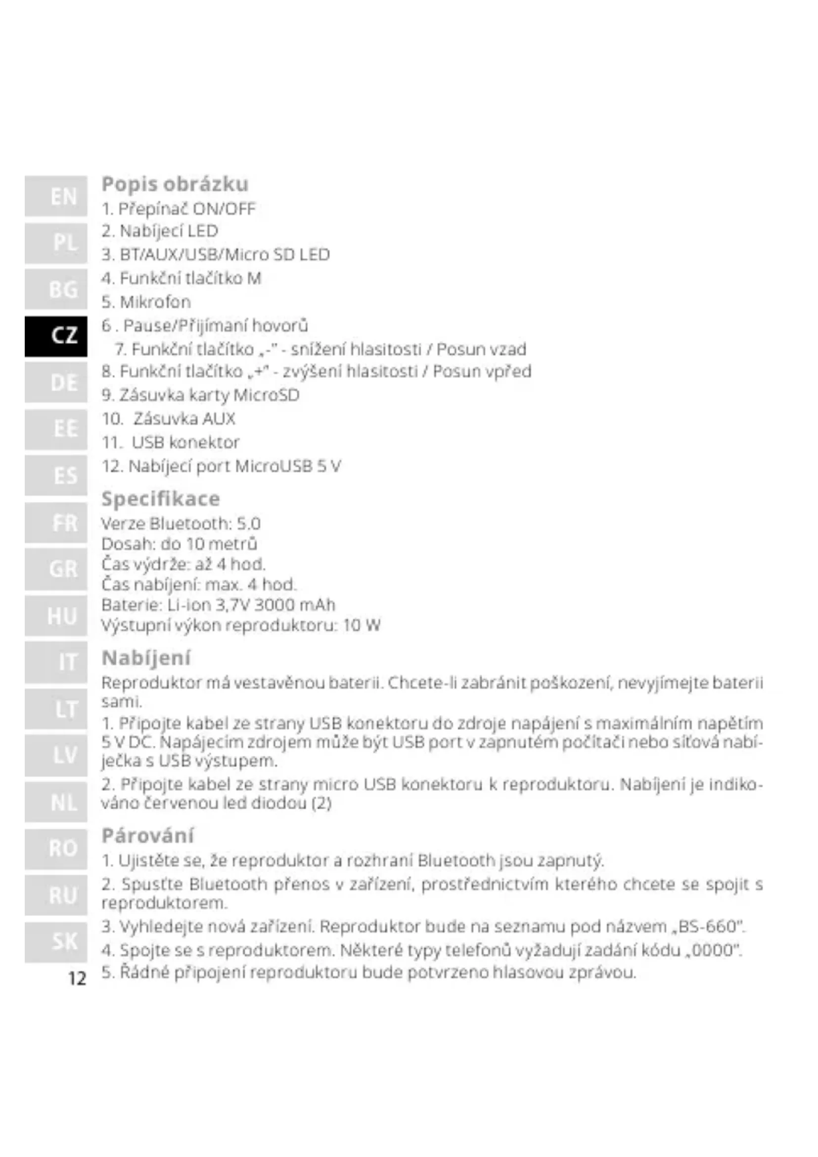 Specikace Verze Bluetooth: 5.0 Dosah: do 10 metrů Čas výdrže: až 4 hod. Čas nabíjení: max. 4 hod. Baterie: Li-ion 3,7V 3000 mAh Výstupní výkon reproduktoru: 10 W Nabíjení Reproduktor má vestavěnou baterii. Chcete-li zabránit poškození, nevyjímejte baterii sami.
