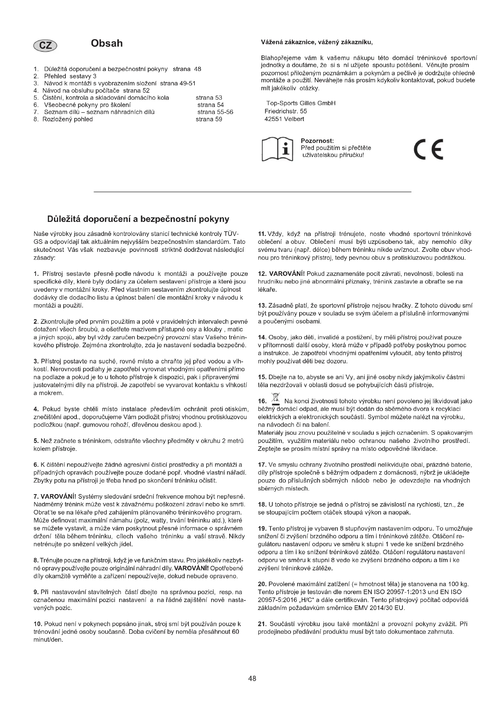 Vážená zákaznice, vážený zákazníku, Blahopřejeme vám k vašemu nákupu této domácí tréninkové sportovní jednotky a doufáme, že si s ní užijete spoustu potěšení. Věnujte prosím pozornost přiloženým poznámkám a pokynům a pečlivě je dodržujte ohledně montáže a použití. Neváhejte nás prosím kdykoliv kontaktovat, pokud budete mít jakékoliv otázky. Top-Sports Gilles GmbH Friedrichstr. 55 42551 Velbert Pozornost: Před použitím si přečtěte uživatelskou příručku! Důležitá doporučení a bezpečnostní pokyny Naše výrobky jsou zásadně kontrolovány stanicí technické kontroly TÜV- GS a odpovídají tak aktuálním nejvyšším bezpečnostním standardům. Tato skutečnost Vás však nezbavuje povinnosti striktně dodržovat následující zásady: