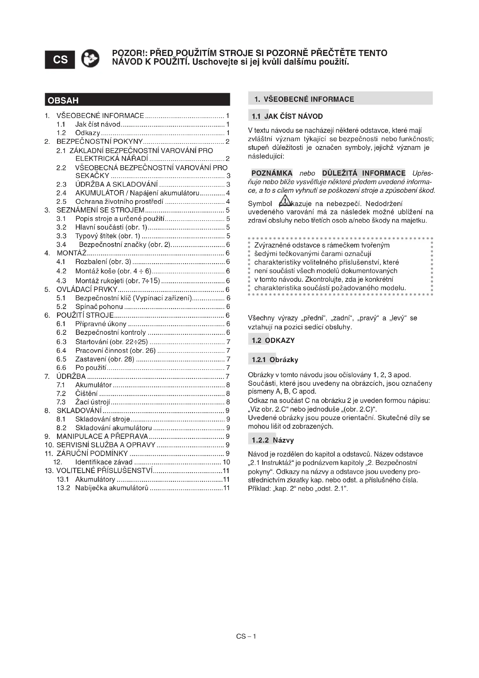 Návod je rozdělen do kapitol a odstavců. Název odstavce „2.1 Instruktáž“ je podnázvem kapitoly „2. Bezpečnostní pokyny“. Odkazy na názvy a odstavce jsou uvedeny pro- střednictvím zkratky kap. nebo odst. a příslušného čísla. Příklad: „kap. 2“ nebo „odst. 2.1”. POZOR!: PŘED POUŽITÍM STROJE SI POZORNĚ PŘEČTĚTE TENTO NÁVOD K POUŽITÍ. Uschovejte si jej kvůli dalšímu použití.