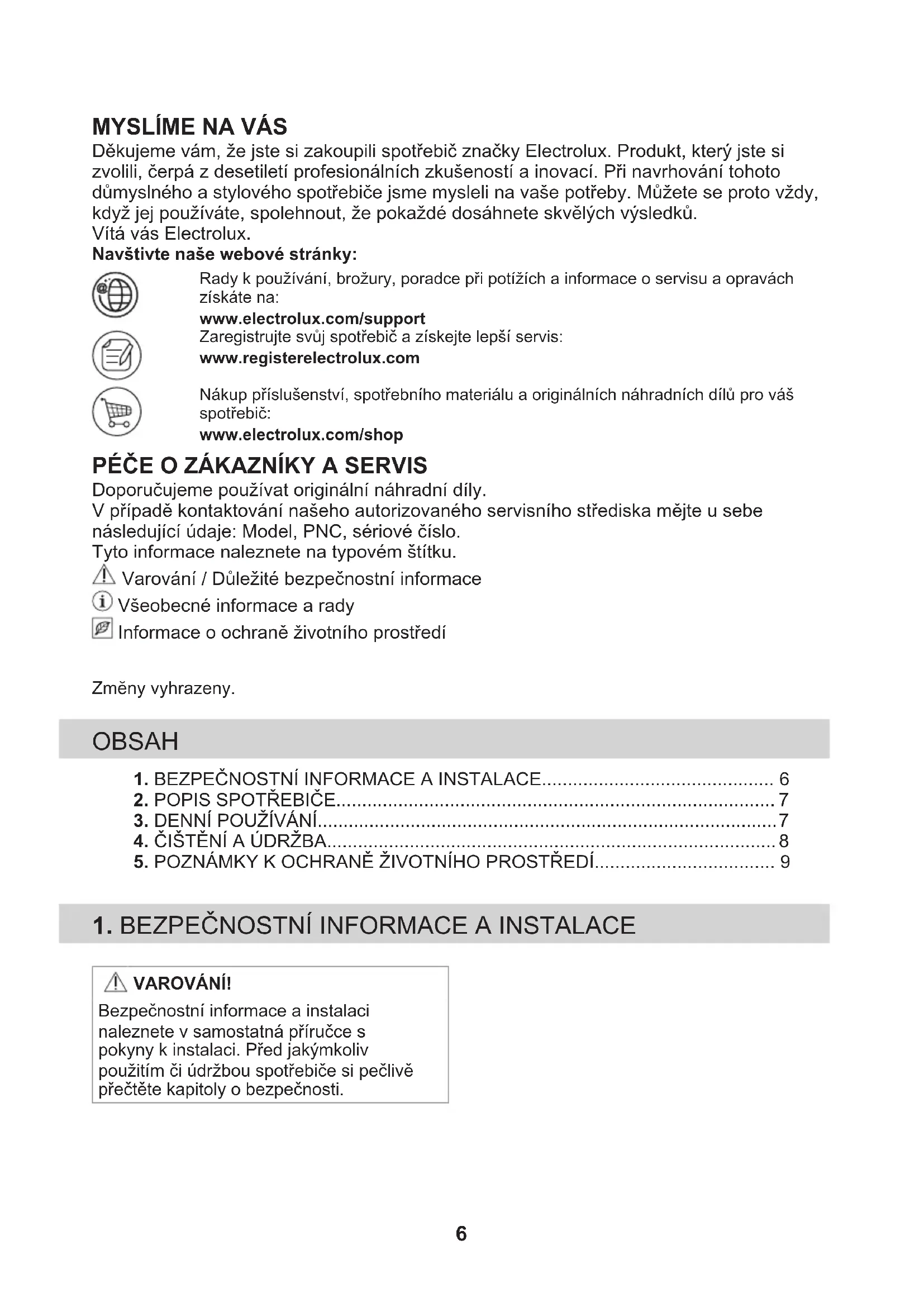 Děkujeme vám, že jste si zakoupili spotřebič značky Electrolux. Produkt, který jste si zvolili, čerpá z desetiletí profesionálních zkušeností a inovací. Při navrhování tohoto důmyslného a stylového spotřebiče jsme mysleli na vaše potřeby. Můžete se proto vždy, když jej používáte, spolehnout, že pokaždé dosáhnete skvělých výsledků. Vítá vás Electrolux. Navštivte naše webové stránky: Rady k používání, brožury, poradce při potížích a informace o servisu a opraváchzískáte na:www.electrolux.com/supportZaregistrujte svůj spotřebič a získejte lepší servis:www.registerelectrolux.comNákup příslušenství, spotřebního materiálu a originálních náhradních dílů pro vášspotřebič:www.electrolux.com/shop PÉČE O ZÁKAZNÍKY A SERVIS Doporučujeme používat originální náhradní díly. V případě kontaktování našeho autorizovaného servisního střediska mějte u sebe následující údaje: Model, PNC, sériové číslo. Tyto informace naleznete na typovém štítku. Varování / Důležité bezpečnostní informace Všeobecné informace a rady Informace o ochraně životního prostředí Zmĕny vyhrazeny. OBSAH