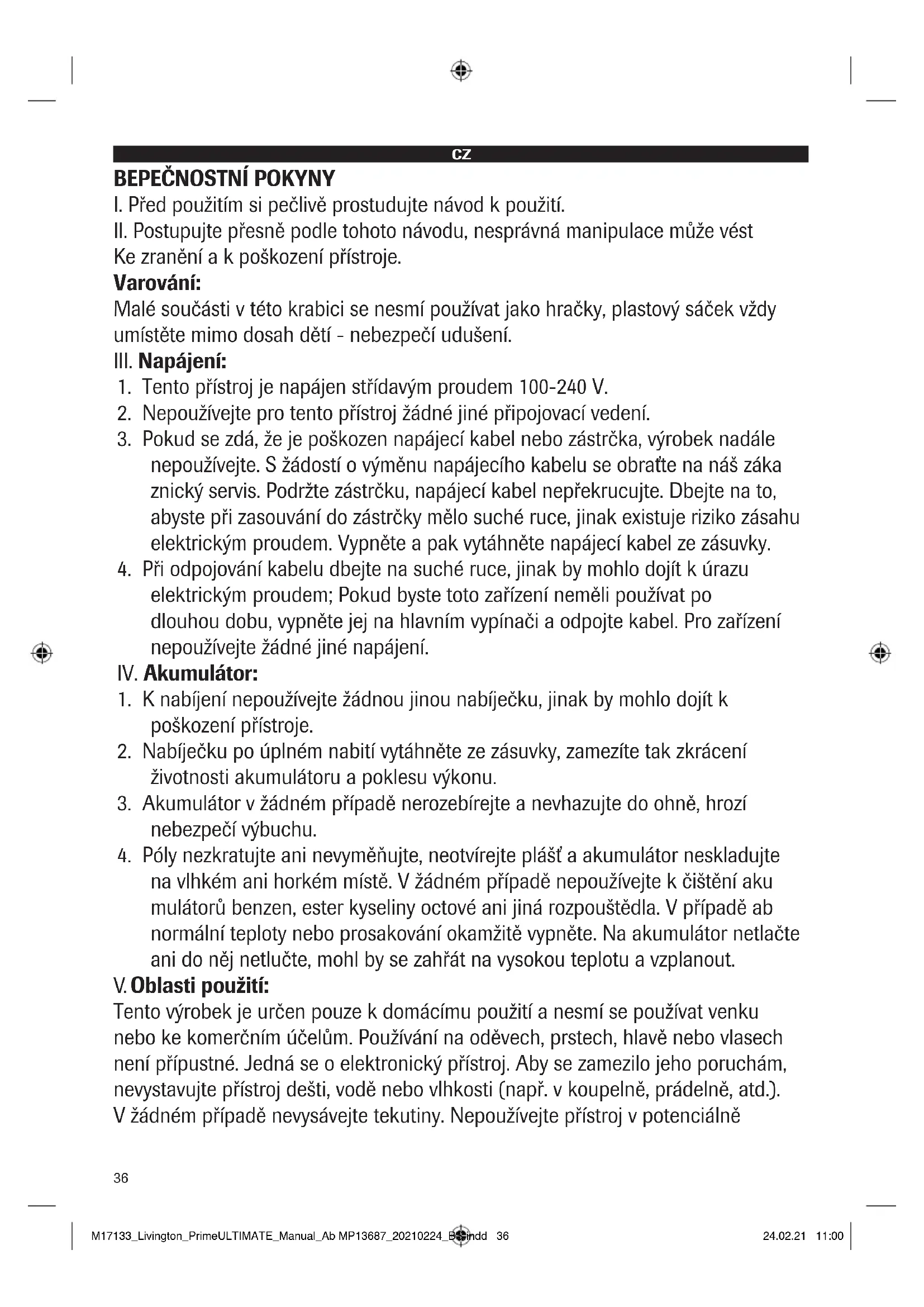 Tento výrobek je určen pouze k domácímu použití a nesmí se používat venku nebo ke komerčním účelům. Používání na oděvech, prstech, hlavě nebo vlasech není přípustné. Jedná se o elektronický přístroj. Aby se zamezilo jeho poruchám, nevystavujte přístroj dešti, vodě nebo vlhkosti (např. v koupelně, prádelně, atd.). V žádném případě nevysávejte tekutiny. Nepoužívejte přístroj v potenciálně M17133_Livington_PrimeULTIMATE_Manual_Ab MP13687_20210224_BS.indd 36M17133_Livington_PrimeULTIMATE_Manual_Ab MP13687_20210224_BS.indd 36 24.02.21 11:0024.02.21 11:0037 nebezpečném prostředí, např. v blízkosti plynových spotřebičů, olejových nádrží, chemikálií a jiných zápalných nebo výbušných látek. Nepoužívejte tento přístroj k vysávání popela, hořících cigaret nebo zápalek - nebezpečí požáru. Tento výrobek nepoužívejte k odstraňování hořlavých nebo těkavých kapalin, jako je benzín, petrolej, barevný lak, čistič, alkohol, parfém, koberec, čisticí prostředek na podlahu atd. použít. Nepoužívejte tento výrobek k odstranění prášku nebo toneru v laserové tiskárně nebo kopírce, abyste zabránili vzniku požáru nebo výbuchu.
