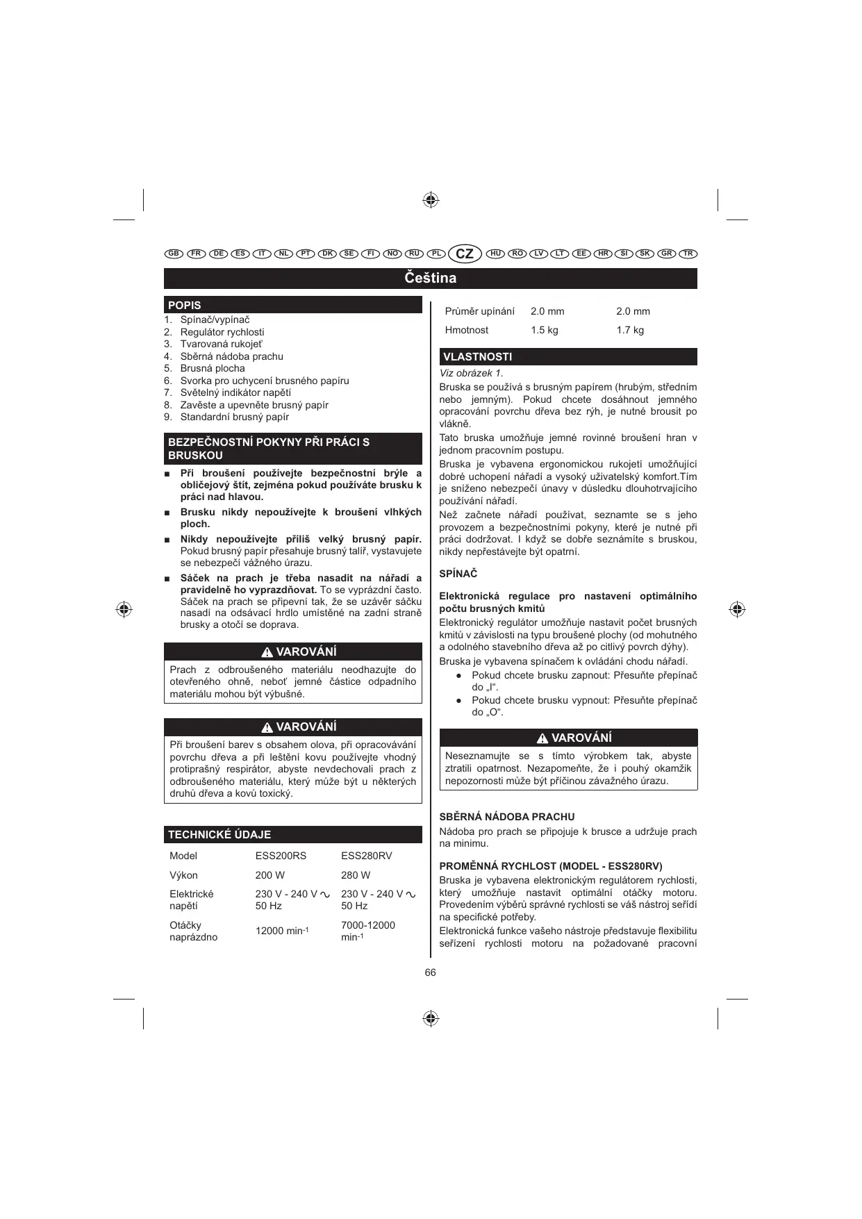 Nádoba pro prach se p ipojuje k brusce a udržuje prach na minimu. TECHNICKÉ ÚDAJE Model ESS200RS ESS280RV Výkon 200 W 280 W Elektrické nap³tí 230 V - 240 V 50 Hz 230 V - 240 V 50 Hz Otáky naprázdno 12000 min-1 7000-12000 min-1 PROM¼NNÁ RYCHLOST (MODEL - ESS280RV) Bruska je vybavena elektronickým regulátorem rychlosti, který umož uje nastavit optimální otáky motoru. Provedením výb³r´ správné rychlosti se váš nástroj se ídí na speciÀcké pot eby. Elektronická funkce vašeho nástroje p edstavuje Åexibilitu se ízení rychlosti motoru na požadované pracovní