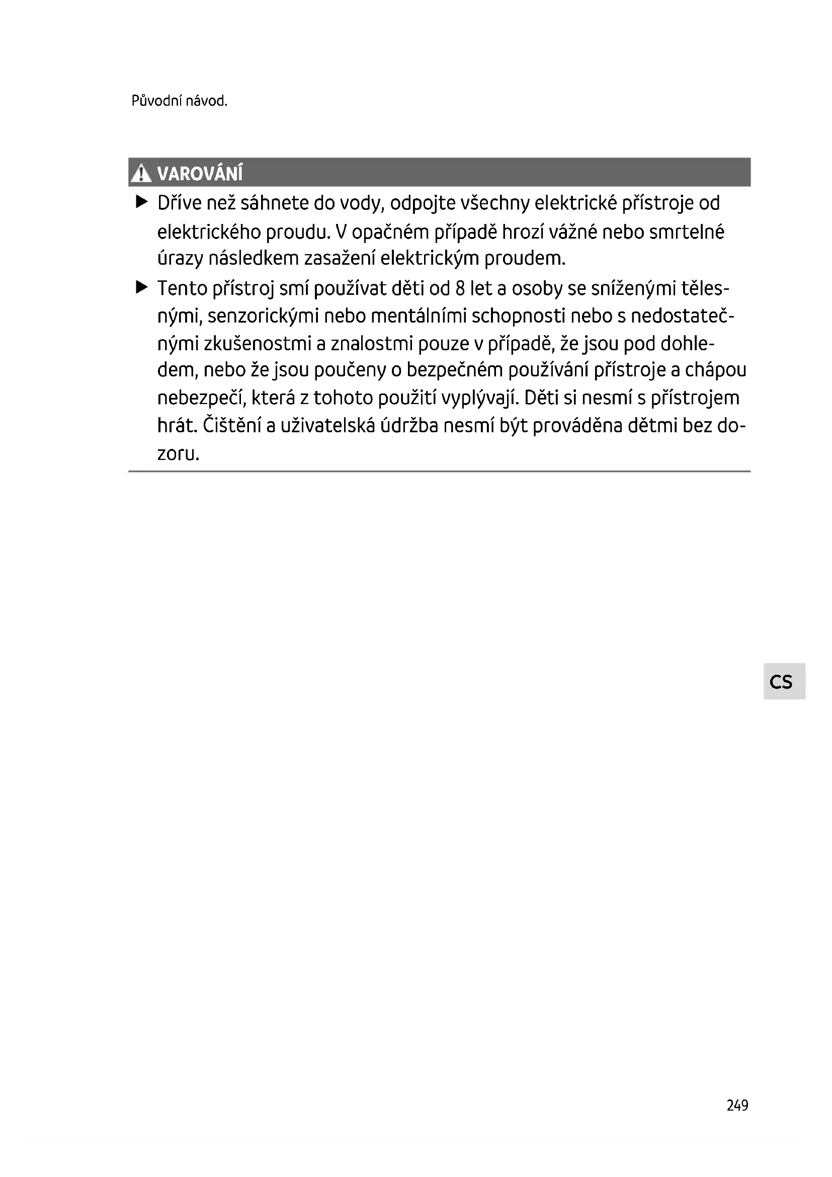 VAROV ÁNÍ VAROVÁNÍ Dříve než sáhnete do vody, odpojte všechny elektrické přístroje od elektrického proudu. V opačném případě hrozí vážné nebo smrtelné úrazy následkem zasažení elektrickým proudem. Tento přístroj smí používat děti od 8 let a osoby se sníženými těles- nými, senzorickými nebo mentálními schopnosti nebo s nedostateč- nými zkušenostmi a znalostmi pouze v případě, že jsou pod dohle- dem, nebo že jsou poučeny o bezpečném používání přístroje a chápou nebezpečí, která z tohoto použití vyplývají. Děti si nesmí s přístrojem hrát. Čištění a uživatelská údržba nesmí být prováděna dětmi bez do- zoru.250 Bezpečnostní pokyny Přípojka elektrické energie