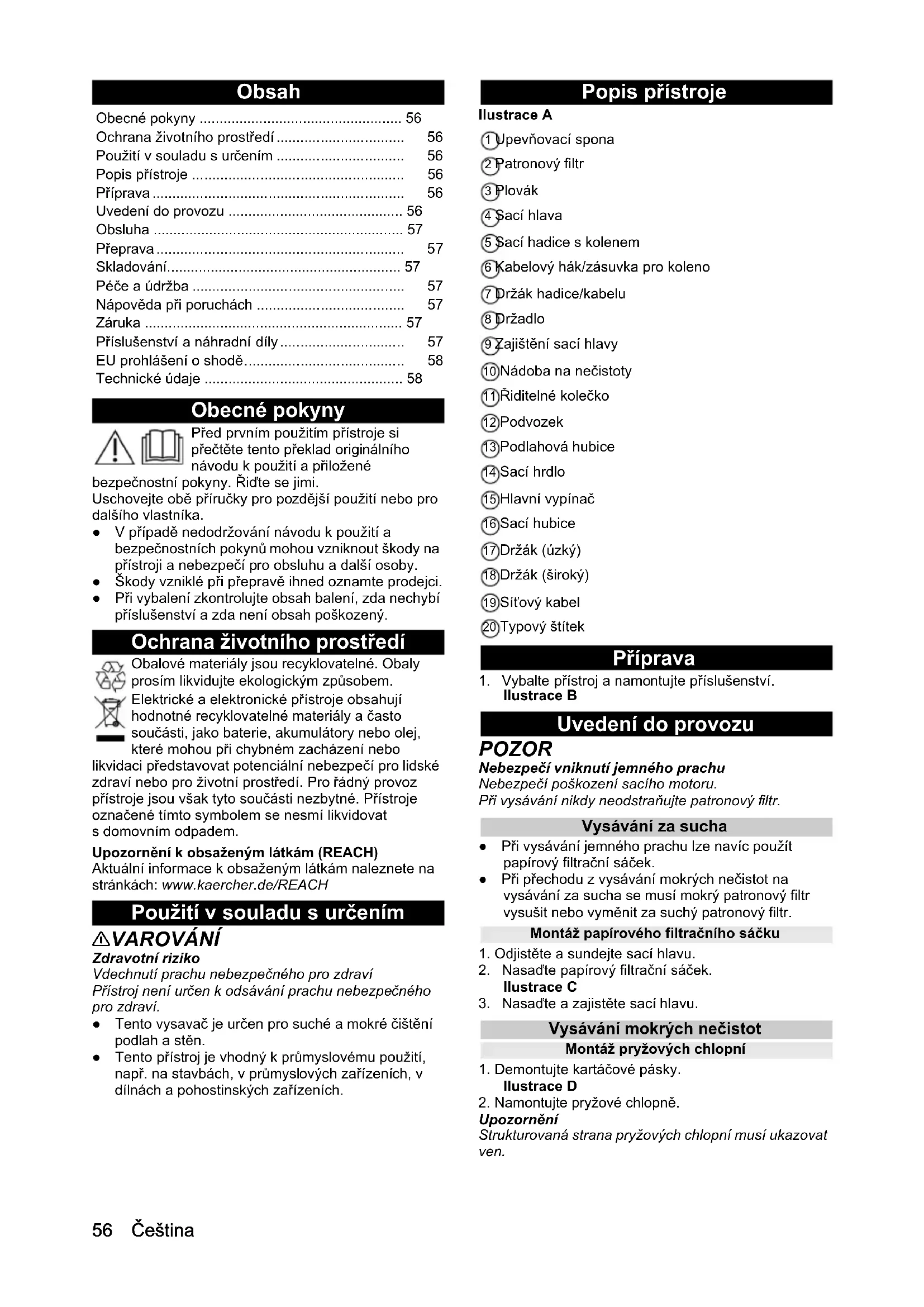 H05VV-F 2x1,0 H05VV-F 2x1,0 H05VV-F 2x1,0 Alkatrészszám (EU) 9.770-820.0 9.770-820.0 9.770-820.0 Kábelhossz m 6,5 6,5 6,556 Čeština Obsah Obecné pokyny Před prvním použitím přístroje si přečtěte tento překlad originálního návodu k použití a přiložené bezpečnostní pokyny. Řiďte se jimi. Uschovejte obě příručky pro pozdější použití nebo pro dalšího vlastníka. ● V případě nedodržování návodu k použití a bezpečnostních pokynů mohou vzniknout škody na přístroji a nebezpečí pro obsluhu a další osoby. ● Škody vzniklé při přepravě ihned oznamte prodejci. ● Při vybalení zkontrolujte obsah balení, zda nechybí příslušenství a zda není obsah poškozený. Ochrana životního prostředí Obalové materiály jsou recyklovatelné. Obaly prosím likvidujte ekologickým způsobem. Elektrické a elektronické přístroje obsahují hodnotné recyklovatelné materiály a často součásti, jako baterie, akumulátory nebo olej, které mohou při chybném zacházení nebo likvidaci představovat potenciální nebezpečí pro lidské zdraví nebo pro životní prostředí. Pro řádný provoz přístroje jsou však tyto součásti nezbytné. Přístroje označené tímto symbolem se nesmí likvidovat s domovním odpadem. Upozornění k obsaženým látkám (REACH) Aktuální informace k obsaženým látkám naleznete na stránkách: www.kaercher.de/REACH Použití v souladu s určením 몇 VAROVÁNÍ Zdravotní riziko Vdechnutí prachu nebezpečného pro zdraví Přístroj není určen k odsávání prachu nebezpečného pro zdraví. ● Tento vysavač je určen pro suché a mokré čištění podlah a stěn. ● Tento přístroj je vhodný k průmyslovému použití, např. na stavbách, v průmyslových zařízeních, v dílnách a pohostinských zařízeních. Popis přístroje Ilustrace A 1 Upevňovací spona 2 Patronový filtr 3 Plovák 4 Sací hlava 5 Sací hadice s kolenem 6 Kabelový hák/zásuvka pro koleno 7 Držák hadice/kabelu 8 Držadlo 9 Zajištění sací hlavy 10 Nádoba na nečistoty 11 Řiditelné kolečko 12 Podvozek 13 Podlahová hubice 14 Sací hrdlo 15 Hlavní vypínač 16 Sací hubice 17 Držák (úzký) 18 Držák (široký) 19 Síťový kabel 20 Typový štítek Příprava