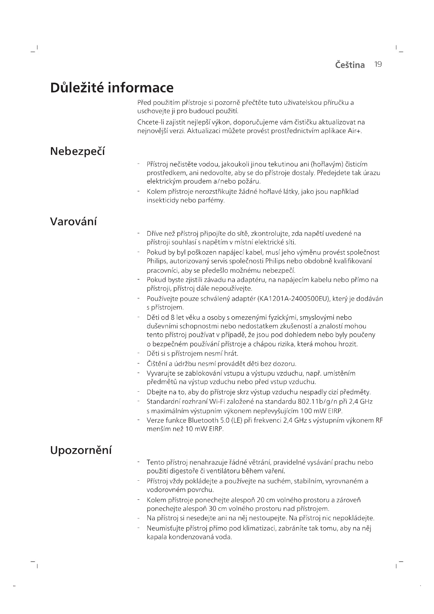 Čeština Důležité informace Před použitím přístroje si pozorně přečtěte tuto uživatelskou příručku a uschovejte ji pro budoucí použití. Chcete-li zajistit nejlepší výkon, doporučujeme vám čističku aktualizovat na nejnovější verzi. Aktualizaci můžete provést prostřednictvím aplikace Air+. Nebezpečí
