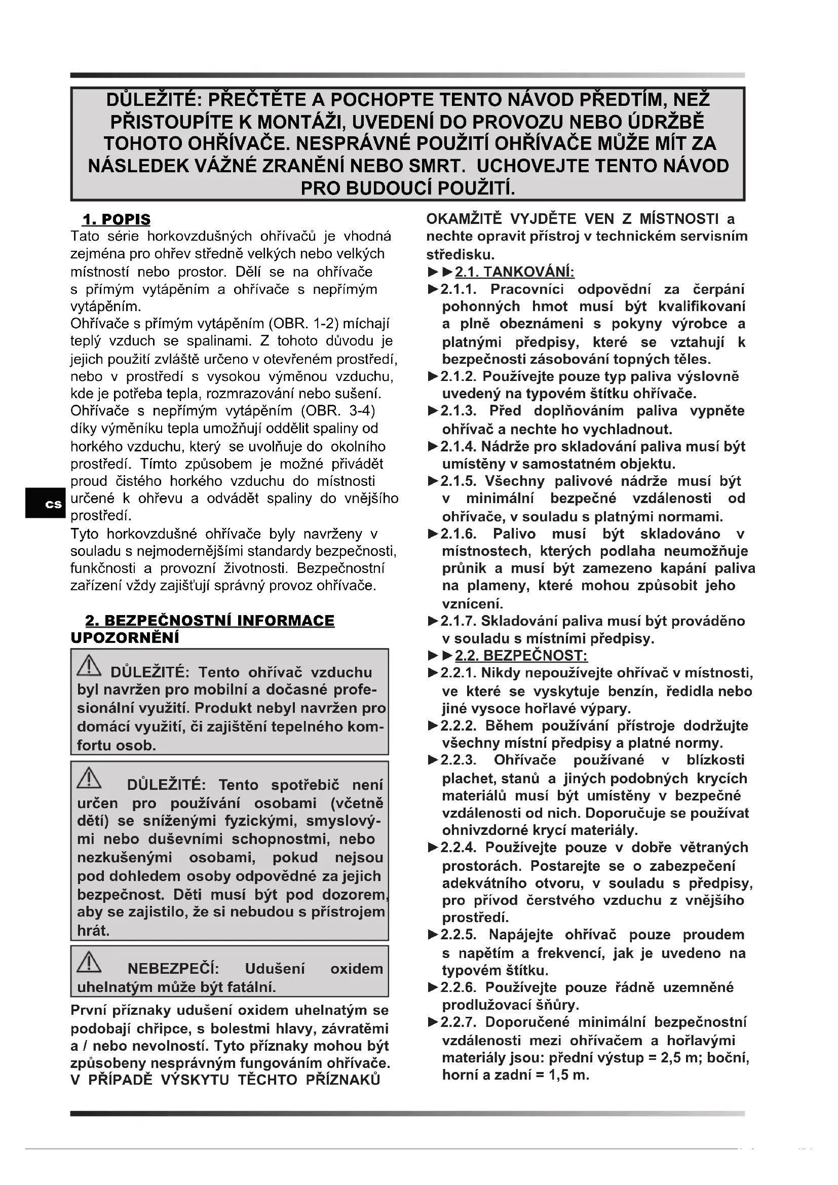 UPOZORNĚNÍ DŮLEŽITÉ: Tento ohřívač vzduchu byl navržen pro mobilní a dočasné profe- sionální využití. Produkt nebyl navržen pro domácí využití, či zajištění tepelného kom- fortu osob. DŮLEŽITÉ: Tento spotřebič není určen pro používání osobami (včetně dětí) se sníženými fyzickými, smyslový- mi nebo duševními schopnostmi, nebo nezkušenými osobami, pokud nejsou pod dohledem osoby odpovědné za jejich bezpečnost. Děti musí být pod dozorem, aby se zajistilo, že si nebudou s přístrojem hrát. NEBEZPEČÍ: Udušení oxidem uhelnatým může být fatální. První příznaky udušení oxidem uhelnatým se podobají chřipce, s bolestmi hlavy, závratěmi a / nebo nevolností. Tyto příznaky mohou být způsobeny nesprávným fungováním ohřívače. V PŘÍPADĚ VÝSKYTU TĚCHTO PŘÍZNAKŮ OKAMŽITĚ VYJDĚTE VEN Z MÍSTNOSTI a nechte opravit přístroj v technickém servisním středisku. ►►2.1. TANKOVÁNÍ: ►2.1.1. Pracovníci odpovědní za čerpání pohonných hmot musí být kvalikovaní a plně obeznámeni s pokyny výrobce a platnými předpisy, které se vztahují k bezpečnosti zásobování topných těles. ►2.1.2. Používejte pouze typ paliva výslovně uvedený na typovém štítku ohřívače. ►2.1.3. Před doplňováním paliva vypněte ohřívač a nechte ho vychladnout. ►2.1.4. Nádrže pro skladování paliva musí být umístěny v samostatném objektu. ►2.1.5. Všechny palivové nádrže musí být v minimální bezpečné vzdálenosti od ohřívače, v souladu s platnými normami. ►2.1.6. Palivo musí být skladováno v místnostech, kterých podlaha neumožňuje průnik a musí být zamezeno kapání paliva na plameny, které mohou způsobit jeho vznícení. ►2.1.7. Skladování paliva musí být prováděno v souladu s místními předpisy. ►►2.2. BEZPEČNOST: ►2.2.1. Nikdy nepoužívejte ohřívač v místnosti, ve které se vyskytuje benzín, ředidla nebo jiné vysoce hořlavé výpary. ►2.2.2. Během používání přístroje dodržujte všechny místní předpisy a platné normy. ►2.2.3. Ohřívače používané v blízkosti plachet, stanů a jiných podobných krycích materiálů musí být umístěny v bezpečné vzdálenosti od nich. Doporučuje se používat ohnivzdorné krycí materiály. ►2.2.4. Používejte pouze v dobře větraných prostorách. Postarejte se o zabezpečení adekvátního otvoru, v souladu s předpisy, pro přívod čerstvého vzduchu z vnějšího prostředí. ►2.2.5. Napájejte ohřívač pouze proudem s napětím a frekvencí, jak je uvedeno na typovém štítku. ►2.2.6. Používejte pouze řádně uzemněné prodlužovací šňůry. ►2.2.7. Doporučené minimální bezpečnostní vzdálenosti mezi ohřívačem a hořlavými materiály jsou: přední výstup = 2,5 m; boční, horní a zadní = 1,5 m.en