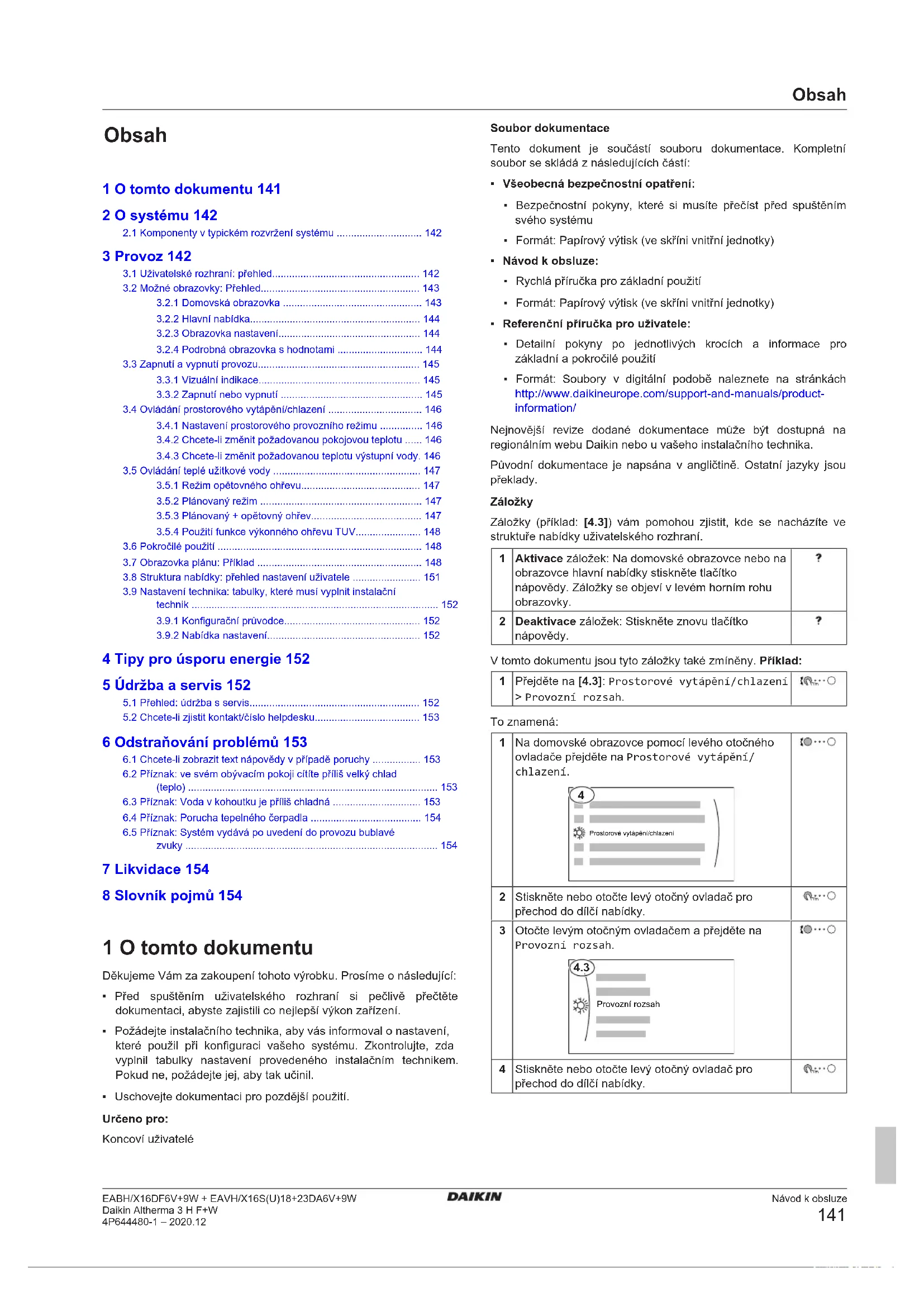 - Formát: Soubory v digitální podobě naleznete na stránkách http://www.daikineurope.com/support-and-manuals/product- information/ Nejnovější revize dodané dokumentace může být dostupná na regionálním webu Daikin nebo u vašeho instalačního technika. Původní dokumentace je napsána v angličtině. Ostatní jazyky jsou překlady. Záložky Záložky (příklad: [4.3]) vám pomohou zjistit, kde se nacházíte ve struktuře nabídky uživatelského rozhraní. 1 Aktivace záložek: Na domovské obrazovce nebo na obrazovce hlavní nabídky stiskněte tlačítko nápovědy. Záložky se objeví v levém horním rohu obrazovky. 2 Deaktivace záložek: Stiskněte znovu tlačítko nápovědy. V tomto dokumentu jsou tyto záložky také zmíněny. Příklad: 1 Přejděte na [4.3]: Prostorové vytápění/chlazení > Provozní rozsah. To znamená: 1 Na domovské obrazovce pomocí levého otočného ovladače přejděte na Prostorové vytápění/ chlazení.