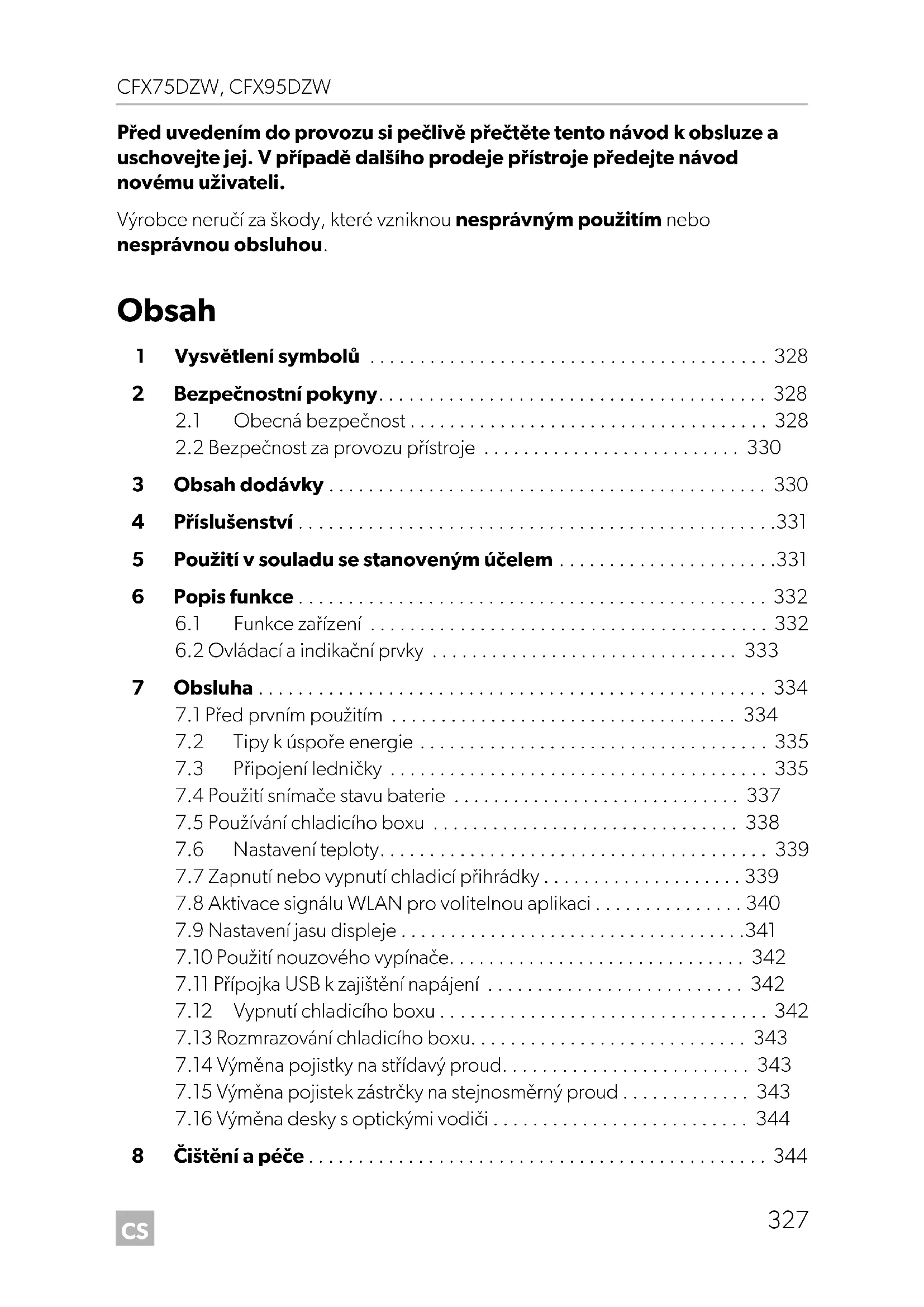 Před uvedením do provozu si pečlivě přečtěte tento návod k obsluze a uschovejte jej. V případě dalšího prodeje přístroje předejte návod novému uživateli. Výrobce neručí za škody, které vzniknou nesprávným použitím nebo nesprávnou obsluhou. Obsah 1 Vysvětlení symbolů . . . . . . . . . . . . . . . . . . . . . . . . . . . . . . . . . . . . . . . . 328 2 Bezpečnostní pokyny. . . . . . . . . . . . . . . . . . . . . . . . . . . . . . . . . . . . . . . 328