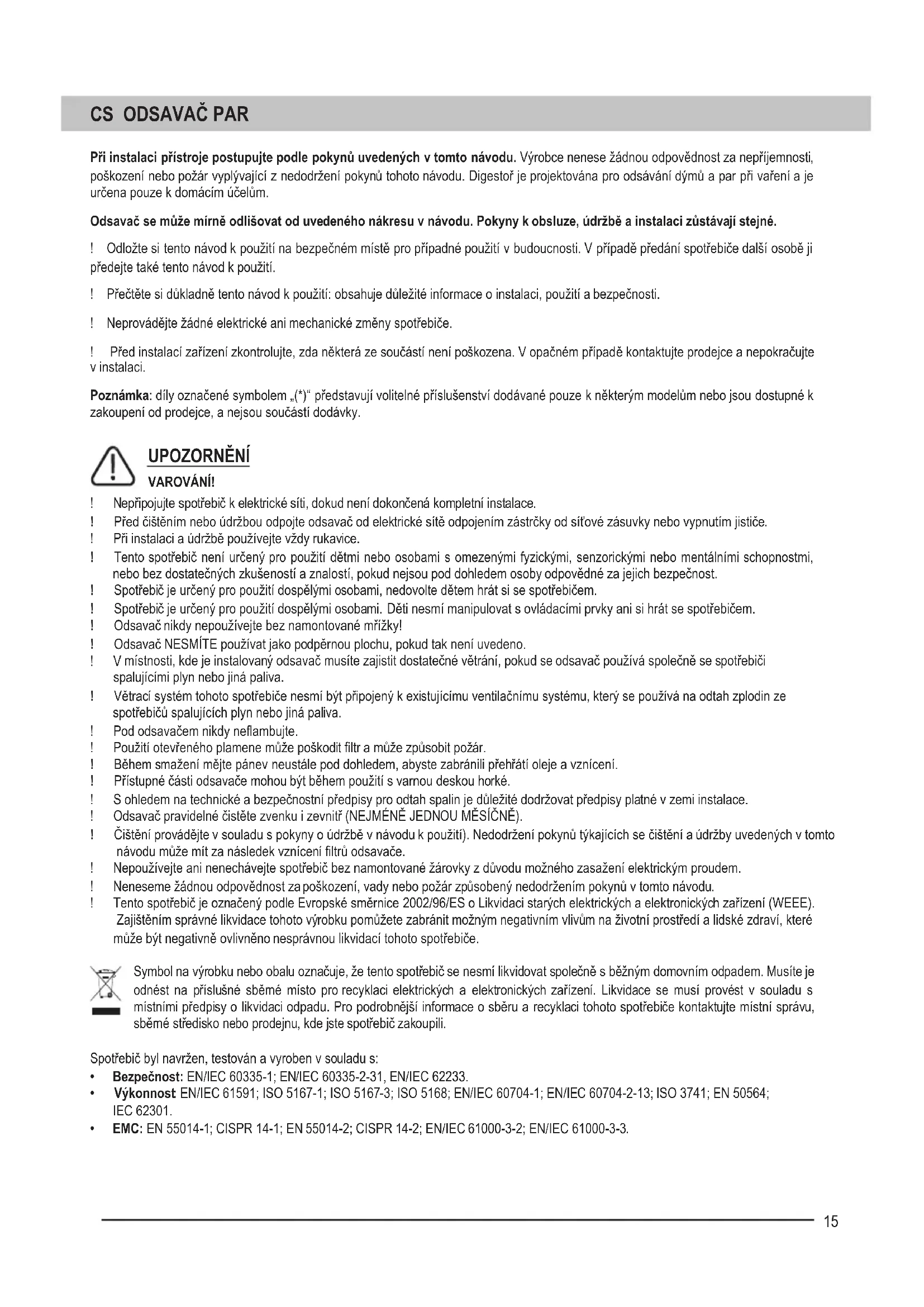 Při instalaci přístroje postupujte podle pokynů uvedených v tomto návodu. Výrobce nenese žádnou odpovědnost za nepříjemnosti, poškození nebo požár vyplývající z nedodržení pokynů tohoto návodu. Digestoř je projektována pro odsávání dýmů a par při vaření a je určena pouze k domácím účelům. Odsavač se může mírně odlišovat od uvedeného nákresu v návodu. Pokyny k obsluze, údržbě a instalaci zůstávají stejné. ! Odložte si tento návod k použití na bezpečném místě pro případné použití v budoucnosti. V případě předání spotřebiče další osobě ji předejte také tento návod k použití. ! Přečtěte si d ůkladně tento návod k použití: obsahuje důležité informace o instalaci, použití a bezpečnosti. ! Neprovádějte žádné elektrické ani mechanické změny spotřebiče. ! Před instalací zařízení zkontrolujte, zda některá ze součástí není poškozena. V opačném případ ě kontaktujte prodejce a nepokračujte v instalaci. Poznámka: díly označené symbolem „(*)“ představují volitelné příslušenství dodávané pouze k některým modelům nebo jsou dostupné k zakoupení od prodejce, a nejsou součástí dodávky. UPOZORNĚNÍ VAROVÁNÍ! ! Nepřipojujte spotřebič k elektrické síti, dokud není dokončená kompletní instalace. ! Před čištěním nebo údržbou odpojte odsavač od elektrické sítě odpojením zástrčky od síťové zásuvky nebo vypnutím jističe. ! Při instalaci a údržbě používejte vždy rukavice. ! Tento spotřebič není určený pro použití dětmi nebo osobami s omezenými fyzickými, senzorickými nebo mentálními schopnostmi, nebo bez dostatečných zkuše ností a znalostí, pokud nejsou pod dohledem osoby odpovědné za jejich bezpečnost. ! Spotřebič je určený pro použití dospělými osobami, nedovolte dětem hrát si se spotřebičem. ! Spotřebič je určený pro použití dospělými osobami. Děti nesmí manipulovat s ovládacími prvky ani si hrát se spotřebičem. ! Odsavač nikdy nepoužívejte bez namontované mřížky! ! Odsavač NESMÍTE používat jako podpěrnou plochu, pokud tak není uvedeno. ! V místnosti, kde je instalovaný odsavač musíte zajistit dostatečné větrání, pokud se odsavač používá společně se spotřebiči spalujícími plyn nebo jiná paliva. ! Větrací systém tohoto spotřebiče nesmí být připojený k existujícímu ventilačnímu systému, který se používá na odtah zplodin ze spotřebičů spalujících plyn nebo jiná paliva. ! Pod odsavačem nikdy neflambujte. ! Použití otevřeného plamene může poškodit filtr a může způsobit požár. ! Během smažení mějte pánev neustále pod dohledem, abyste zabránili přehřátí oleje a vznícení. ! Přístupné části odsavače mohou být během použití s varnou deskou horké. ! S ohledem na technické a bezpečnostní předpisy pro odtah spalin je důležité dodržovat předpisy platné v zemi instalace. ! Odsavač pravidelné čistěte zvenku i zevnitř (NEJMÉNĚ JEDNOU MĚSÍČNĚ). ! Čištění provádějte v souladu s pokyny o údržbě v návodu k použití). Nedodržení pokynů týkajících se čištění a údržby uvedených v tomto návodu může mít za následek vznícení filtrů odsavače. ! Nepoužívejte ani nenechávejte spotřebič bez namontované žárovky z důvodu možného zasažení elektrickým proudem. ! Neneseme žádnou odpovědnost za poškození, vady nebo požár způsobený nedodržením pokynů v tomto návodu. ! Tento spotřebič je označený podle Evropské směrnice 2002/96/ES o Likvidaci starých elektrických a elektronických zařízení (WEEE). Zajištěním správné likvidace tohoto výrobku pomůžete zabránit možným negativním vlivům na životní prostředí a lidské zdraví, které může být negativně ovlivněno nesprávnou likvidací tohoto spotřebiče. Symbol na výrobku nebo obalu označuje, že tento spotřebič se nesmí likvidovat společně s běžným domovním odpadem. Musíte je odnést na příslušné sběrné místo pro recyklaci elektrických a elektronických zařízení. Likvidace se musí provést v souladu s místními předpisy o likvidaci odpadu. Pro podrobnější informace o sběru a recyklaci tohoto spotřebiče kontaktujte místní správu, sběrné středisko nebo prodejnu, kde jste spotřebič zakoupili. Spotřebič byl navržen, testován a vyroben v souladu s:
