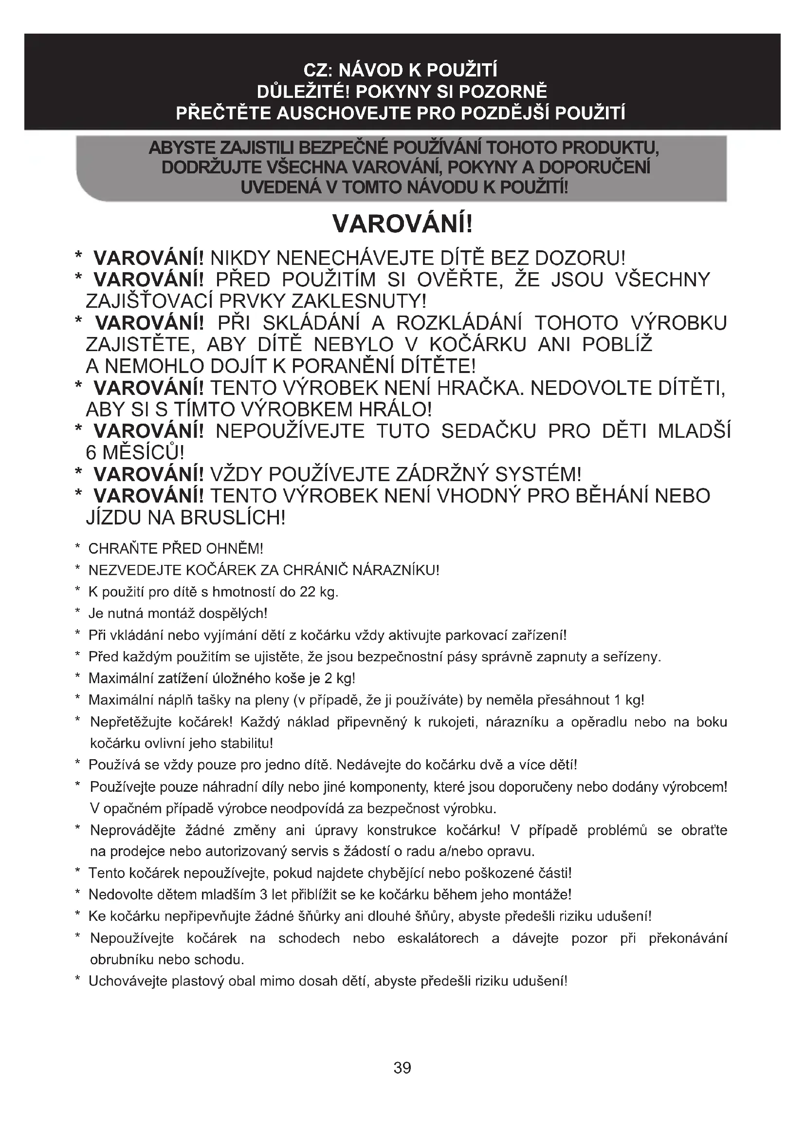 - Tento kočárek nepoužívejte, pokud najdete chybějící nebo poškozené části!