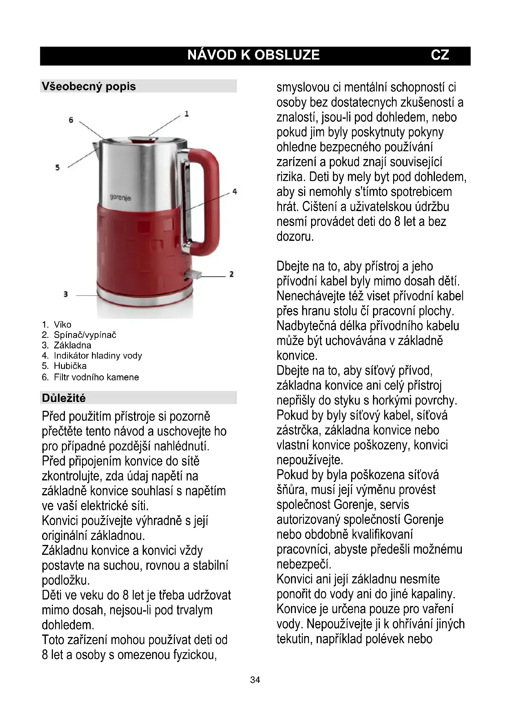 Důležité Před použitím přístroje si pozorně přečtěte tento návod a uschovejte ho pro případné pozdější nahlédnutí. Před připojením konvice do sítě zkontrolujte, zda údaj napětí na základně konvice souhlasí s napětím ve vaší elektrické síti. Konvici používejte výhradně s její originální základnou. Základnu konvice a konvici vždy postavte na suchou, rovnou a stabilní podložku. Děti ve veku do 8 let je třeba udržovat mimo dosah, nejsou-li pod trvalym dohledem. Toto zařízení mohou používat deti od 8 let a osoby s omezenou fyzickou, smyslovou ci mentální schopností ci osoby bez dostatecnych zkušeností a znalostí, jsou-li pod dohledem, nebo pokud jim byly poskytnuty pokyny ohledne bezpecného používání zarízení a pokud znají související rizika. Deti by mely byt pod dohledem, aby si nemohly s'tímto spotrebicem hrát. Cištení a uživatelskou údržbu nesmí provádet deti do 8 let a bez dozoru. Dbejte na to, aby přístroj a jeho přívodní kabel byly mimo dosah dětí. Nenechávejte též viset přívodní kabel přes hranu stolu čí pracovní plochy. Nadbytečná délka přívodního kabelu může být uchovávána v základně konvice. Dbejte na to, aby síťový přívod, základna konvice ani celý přístroj nepřišly do styku s horkými povrchy. Pokud by byly síťový kabel, síťová zástrčka, základna konvice nebo vlastní konvice poškozeny, konvici nepoužívejte. Pokud by byla poškozena síťová šňůra, musí její výměnu provést společnost Gorenje, servis autorizovaný společností Gorenje nebo obdobně kvalifikovaní pracovníci, abyste předešli možnému nebezpečí. Konvici ani její základnu nesmíte ponořit do vody ani do jiné kapaliny. Konvice je určena pouze pro vaření vody. Nepoužívejte ji k ohřívání jiných tekutin, například polévek nebo35 dokonce potravin v zavařovacích sklenicích, lahvích či plechovkách. Vařící se voda vás může vážně opařit. Buďte proto velmi opatrní, pokud je v konvici horká voda. Konvici nikdy neplňte nad označení maximální hladiny. Pokud by byla konvice přeplněna, horká voda by mohla vystřikovat její hubičkou a opařit vás. Během vaření vody neotevírejte víko konvice. Pamatujte na to, že když otevřete víko těsně po uvaření vody, může vás opařit vystupující horká pára. Nedotýkejte se těla konvice, během vaření vody je velmi teplé. Konvici vždy uchopte pouze za její rukojeť. Voda v konvici musí vždy alespoň zakrývat dno, aby nedošlo k vyvaření veškeré vody. Na základně konvice se mohou objevit určité kondenzáty. Jde o zcela normální jev a neznamená to žádnou závadu. V závislosti na tvrdosti vody ve vaší oblasti se mohou objevit na topném tělísku i na vnitřních stěnách konvice po určité době používání malé skvrny. To je způsobeno usazováním vodního kamene na topném tělísku a vnitřku konvice. Čím je voda ve vaší oblasti tvrdší, tím je tvorba vodního kamene rychlejší. Skvrny mohou mít také různé zabarvení. Ačkoli jsou tyto skvrny zcela neškodné, může jejich nadměrné množství ovlivňovat výkon vaší konvice. Proto je vhodné je pravidelně odstraňovat, jak je popsáno v odstavci „Odstraňování vodního kamene“. Tento spotřebič je označen v souladu s evropskou směrnicí 2012/19/EU o nakládání s použitými elektrickými a elektronickými zařízeními (waste electrical and electronic equipment - WEEE). Tato směrnice stanoví jednotný evropský (EU) rámec pro zpětný odběr a recyklování použitých zařízení. Elektromagnetická pole (EMP) Tento přístroj společnosti Gorenje odpovídá všem normám týkajícím se elektromagnetických polí (EMP). Pokud je správně používán v souladu s pokyny uvedenými v této uživatelské příručce, je jeho použití podle dosud dostupných vědeckých poznatků bezpečné. Ochrana proti vaření bez vody Tato konvice je vybavena ochranou proti vaření bez vody. Tato pojistka automaticky vypne konvici, pokud byste ji omylem zapnuli bez vody nebo s malým množstvím vody. Vypínač zůstane v poloze „zapnuto“, ale kroužek s kontrolkou napájení přestane svítit. Přepněte vypínač do polohy „vypnuto“ a nechejte konvici asi 10 minut vychladnout. Potom zdvihněte konvici ze základny, aby se resetovala ochrana proti vaření bez vody. Konvice je nyní připravena k dalšímu použití. Před prvním použitím
