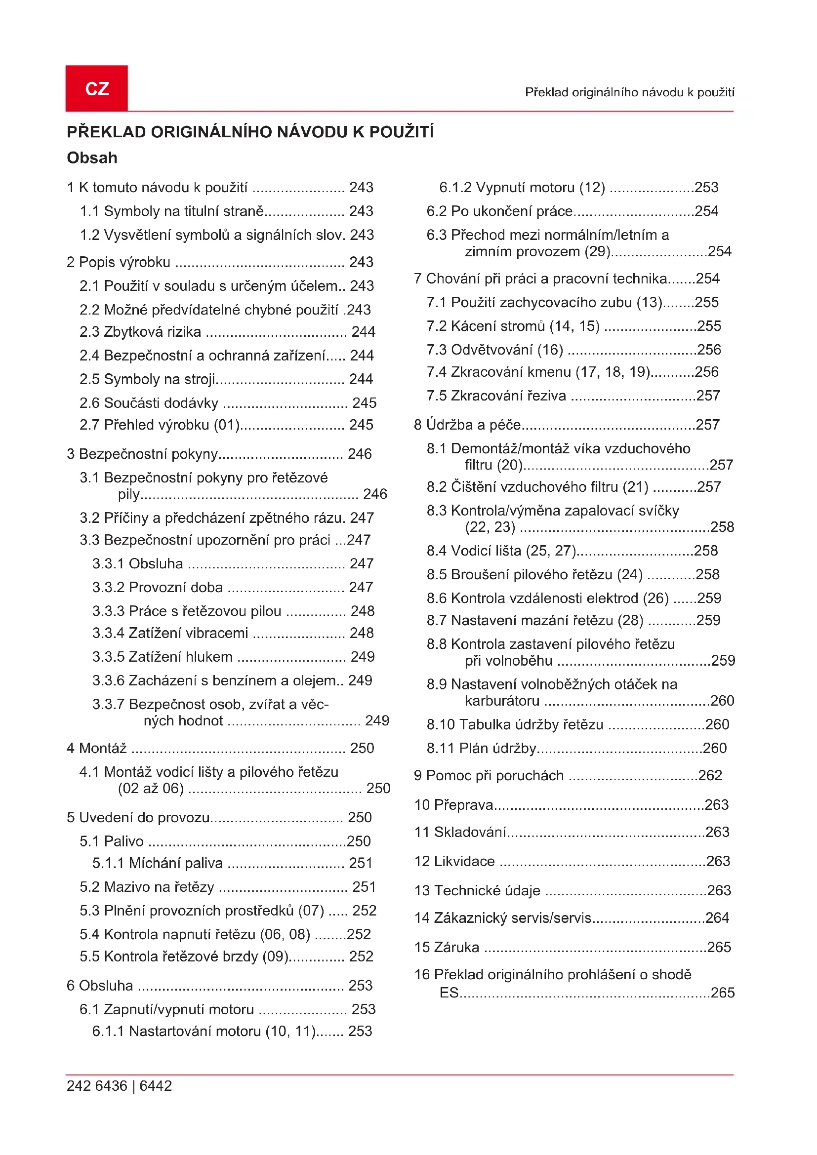 Č. Součást 1 Vodicí lišta 2 Řetěz 3 Přední chránič rukou 4 Přední rukojeť 5 Kryt vzduchového filtru 6 Pojistné svorky pro víko vzduchového filtru 7 Páčka plynu 8 Bezpečnostní blokovací tlačítko 9 Zadní rukojeť 10 Sklopné tlačítko k vypnutí motoru, sa- močinně zaskakujícíCZ 246 6436 | 6442 Bezpečnostní pokyny Č. Součást 11 Palivová nádrž 12 Tlačítko sytiče (pro start za studena) 13 Rukojeť startéru 14 Olejová nádrž 15 Ochranný kryt pro vodicí lištu 16 Opěrná čelist 17 Upevňovací matice pro vodicí lištu 18 Seřizovací šroub pro napínák řetězu 19 Upevnění lišty 20 Balonek palivového čerpadla 21 Návod kpoužití