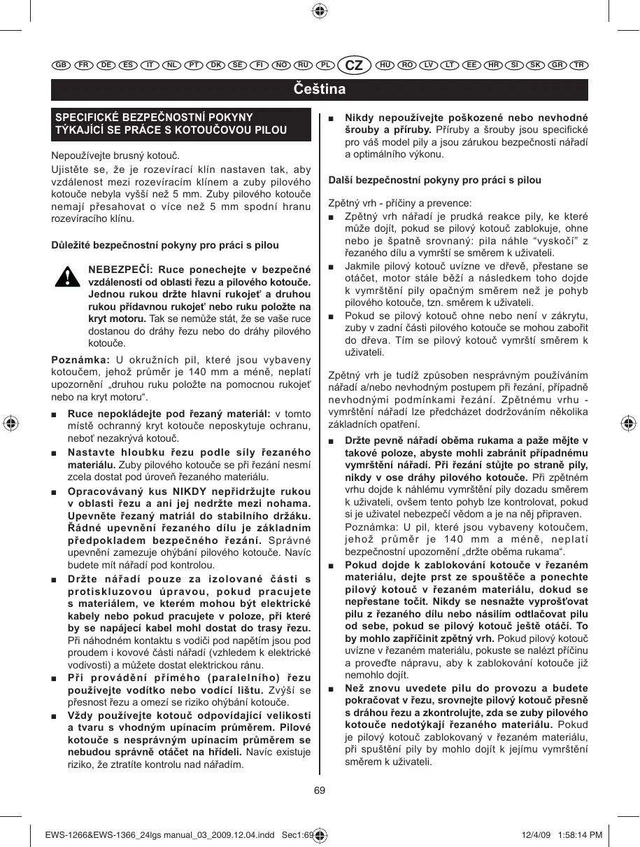 Prohlašujeme na svou zodpovědnost, že tento výrobek splňuje požadavky níže uvedených norem a závazných předpisů: 98/37/EC (do 28. prosince 2009), 2006/42/EC (od 29. prosince 2009), 2006/95/EC, 2004/108/EC, EN55014-1; EN55014-2; EN61000-3-2; EN61000-3-3; EN60745-1; EN60745-2-5; EN50366 12/4/09 1:58:38 PM