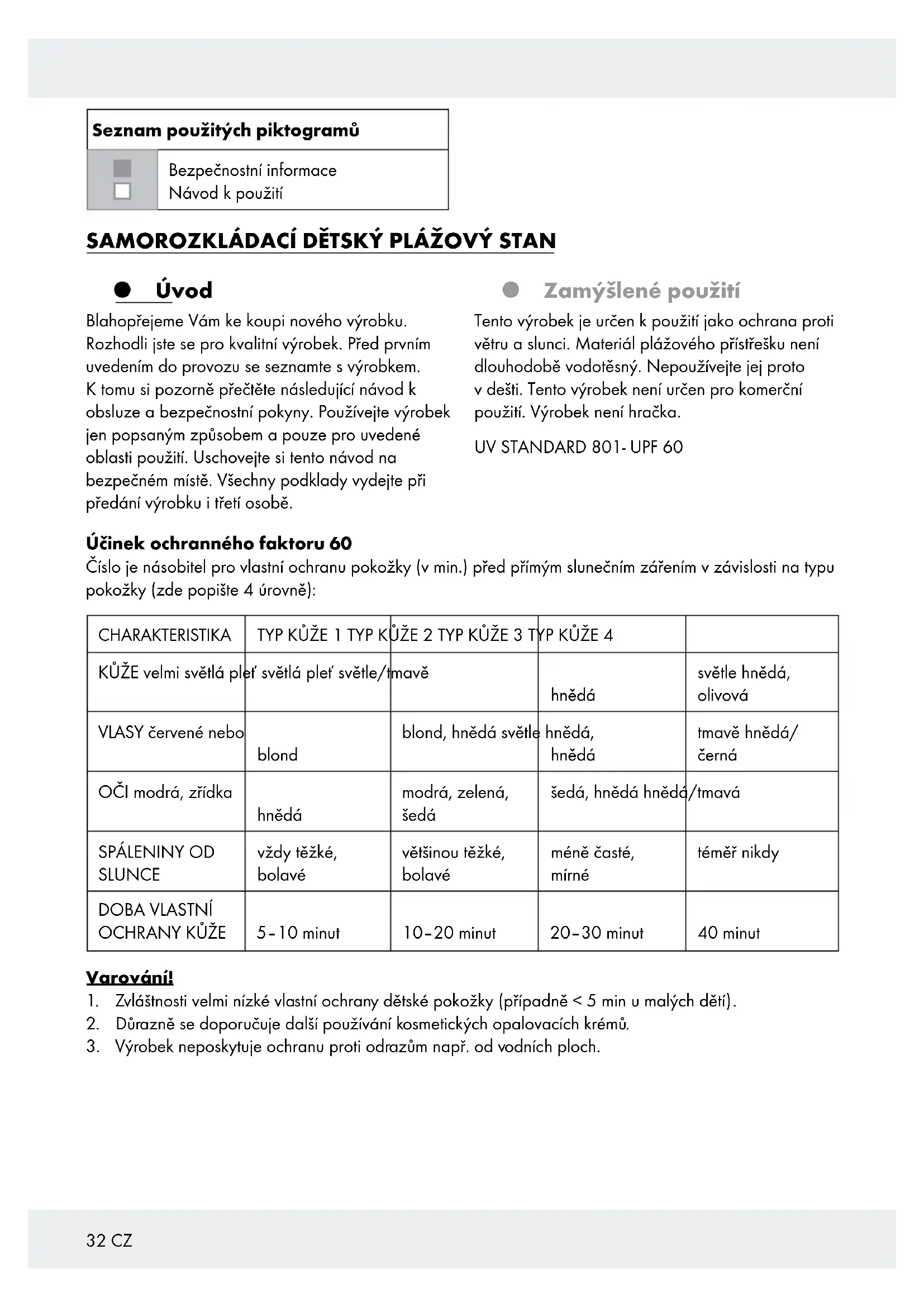SLUNCE vždy těžké, bolavé většinou těžké, bolavé méně časté, mírné téměř nikdy DOBA VLASTNÍ OCHRANY KŮŽE 5–10 minut 10–20 minut 20–30 minut 40 minut Varování!