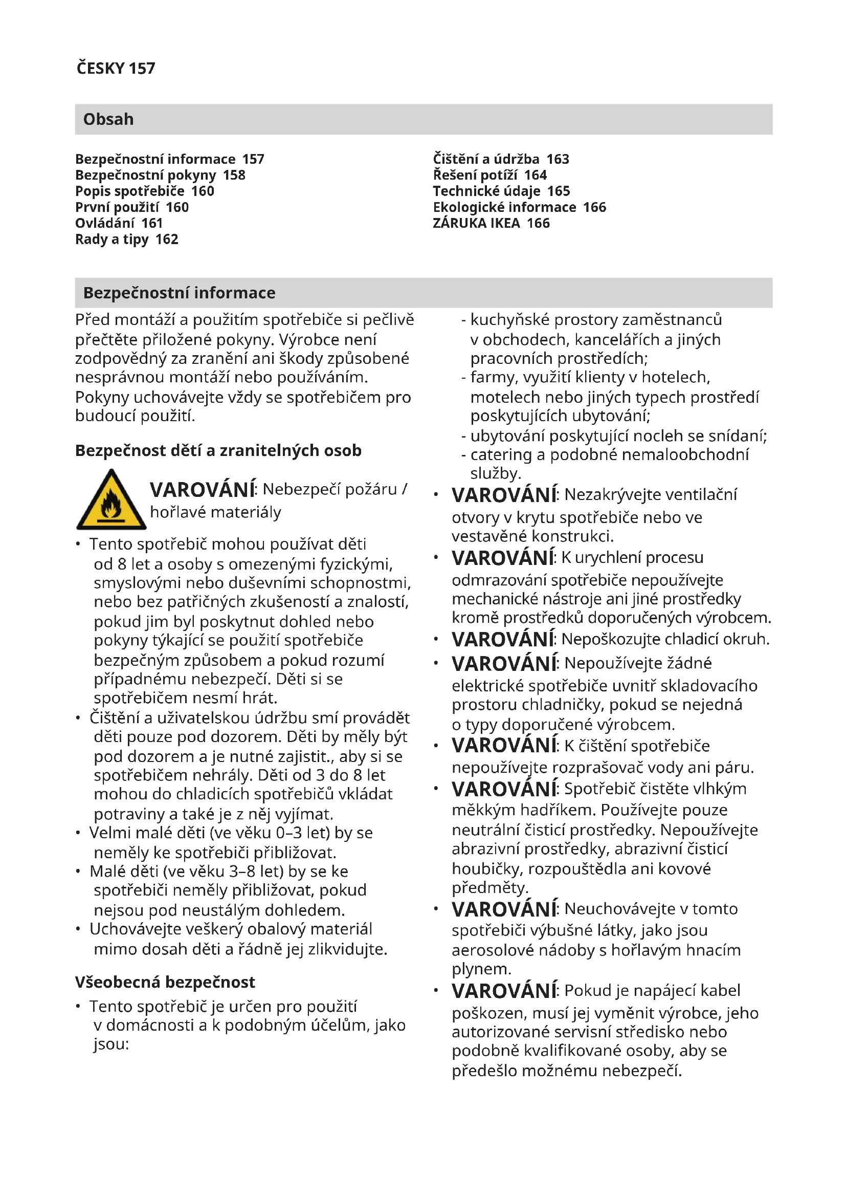 - dotazu týkajícího se vysvětlení funkce spotřebičů IKEA. Než nás kontaktujete, přečtěte si pozorně pokyny kinstalaci anebo návod kpoužití, abychom vám mohli poskytnout co nejlepší pomoc. Kde nás najdete, když potřebujete servisní službu Telefonní čísla pověřených poskytovatelů poprodejního servisu IKEA najdete na konci tohoto návodu. Doporučujeme vám, abyste využili konkrétní telefonní čísla uvedená vtomto návodu, abychom vám mohli poskytnout rychlejší služby. Vždy využívejte telefonní čísla uvedená vnávodu kpoužití ke konkrétnímu spotřebiči, ohledně kterého potřebujete pomoc. Nezapomeňte uvést 8místné číslo výrobku a22místné sériové číslo uvedené na typovém štítku spotřebiče. USCHOVEJTE SI ÚČTENKU! Je to váš doklad okoupi aje nutný kuplatnění záruky. Na účtence je také uveden název a produktový kód IKEA (8místný kód) každého zakoupeného spotřebiče. Potřebujete další pomoc? Máte-li jakékoli další otázky, které nesouvisí spoprodejním servisem kvašemu spotřebiči, obraťte se na nejbližší kontaktní centrum obchodu IKEA. Než nás kontaktujete, doporučujeme přečíst si pozorně dokumentaci ke spotřebiči.ČESKY 168 Informace onáhradních dílech - Následující náhradní díly: termostaty, teplotní senzory, desky splošnými spoji asvětelné zdroje budou kdispozici profesionálním opravářům po dobu minimálně sedmi let od uvedení poslední jednotky daného modelu na trh. - Následující náhradní díly: kliky dveří, závěsy dveří, zásobníky akoše budou kdispozici profesionálním opravářům akoncovým uživatelům po dobu minimálně sedmi let atěsnění dveří po dobu minimálně 10let od uvedení posledního kusu modelu na trh. Náhradní díly naleznete na: www.ikea.comPOLSKI 169 Spis treści Informacje dotyczące bezpieczeństwa Przedzainstalowaniem iużyciem urządzenia należy uważnie przeczytać dostarczony razem znim podręcznik użytkownika. Producent nie ponosi odpowiedzialności, jeśli nieprawidłowy montaż lub niepoprawne użytkowanie spowodują obrażenia ciała bądź szkody materialne. Podręcznikużytkownika należy przechowywać wpobliżu urządzenia. Bezpieczeństwo dzieci iosób zniepełnosprawnościami OSTRZEŻENIE: Niebezpieczeństwo pożaru / materiały łatwopalne