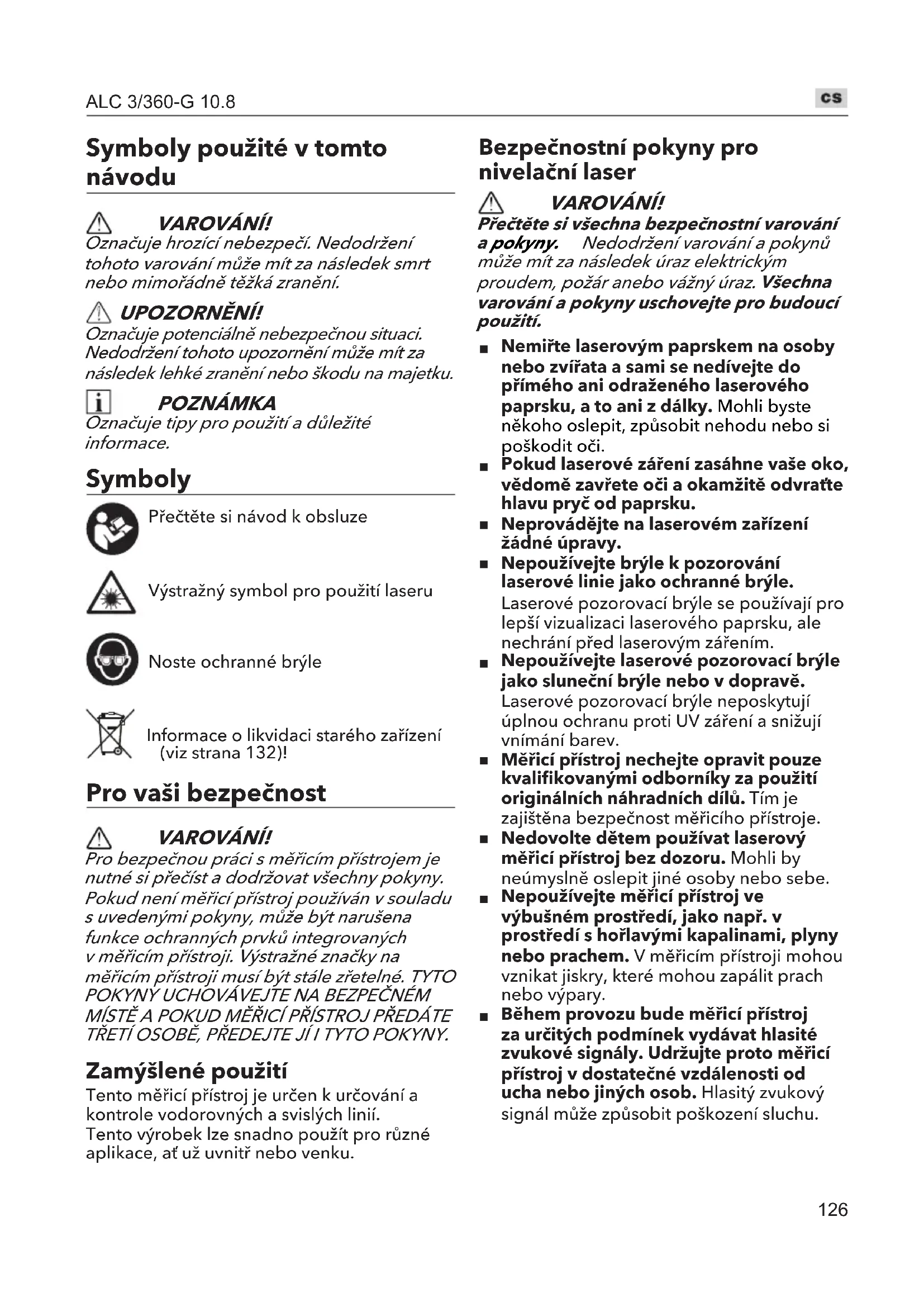 Bahnhofstrasse 15, D-71711 Steinheim/Murr Felelősség alóli mentesség A gyártó és képviselője nem vállal felelősséget semmilyen kárért, amelyet a termék helytelen használata vagy a termék más gyártók termékeivel való használata okozott. A gyártó és képviselője nem vállal felelősséget semmilyen kárért, amelyet a termék helytelen használata vagy a termék más gyártók termékeivel való használata okozott.126 ALC 3/360-G 10.8 Symboly použité v tomto návodu VAROVÁNÍ! Označuje hrozící nebezpečí. Nedodržení tohoto varování může mít za následek smrt nebo mimořádně těžká zranění. UPOZORNĚNÍ! Označuje potenciálně nebezpečnou situaci. Nedodržení tohoto upozornění může mít za následek lehké zranění nebo škodu na majetku. POZNÁMKA Označuje tipy pro použití a důležité informace. Symboly Přečtěte si návod k obsluze Výstražný symbol pro použití laseru Noste ochranné brýle Informace o likvidaci starého zařízení (viz strana 132)! Pro vaši bezpečnost VAROVÁNÍ! Pro bezpečnou práci s měřicím přístrojem je nutné si přečíst a dodržovat všechny pokyny. Pokud není měřicí přístroj používán v souladu s uvedenými pokyny, může být narušena funkce ochranných prvků integrovaných v měřicím přístroji. Výstražné značky na měřicím přístroji musí být stále zřetelné. TYTO POKYNY UCHOVÁVEJTE NA BEZPEČNÉM MÍSTĚ A POKUD MĚŘICÍ PŘÍSTROJ PŘEDÁTE TŘETÍ OSOBĚ, PŘEDEJTE JÍ I TYTO POKYNY. Zamýšlené použití Tento měřicí přístroj je určen k určování a kontrole vodorovných a svislých linií.Tento výrobek lze snadno použít pro různé aplikace, ať už uvnitř nebo venku. Bezpečnostní pokyny pro nivelační laser VAROVÁNÍ! Přečtěte si všechna bezpečnostní varování