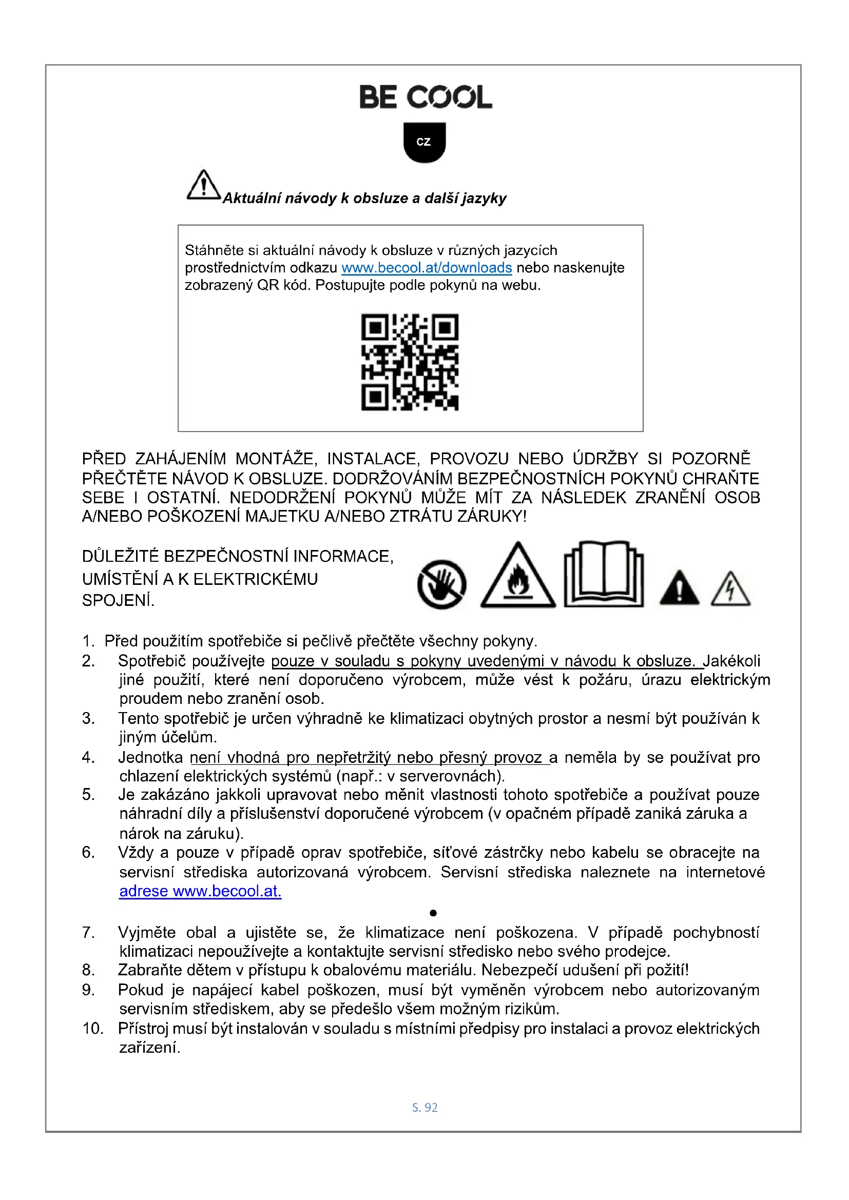 Stáhněte si aktuální návody k obsluze v různých jazycích prostřednictvím odkazu www.becool.at/downloads nebo naskenujte zobrazený QR kód. Postupujte podle pokynů na webu.