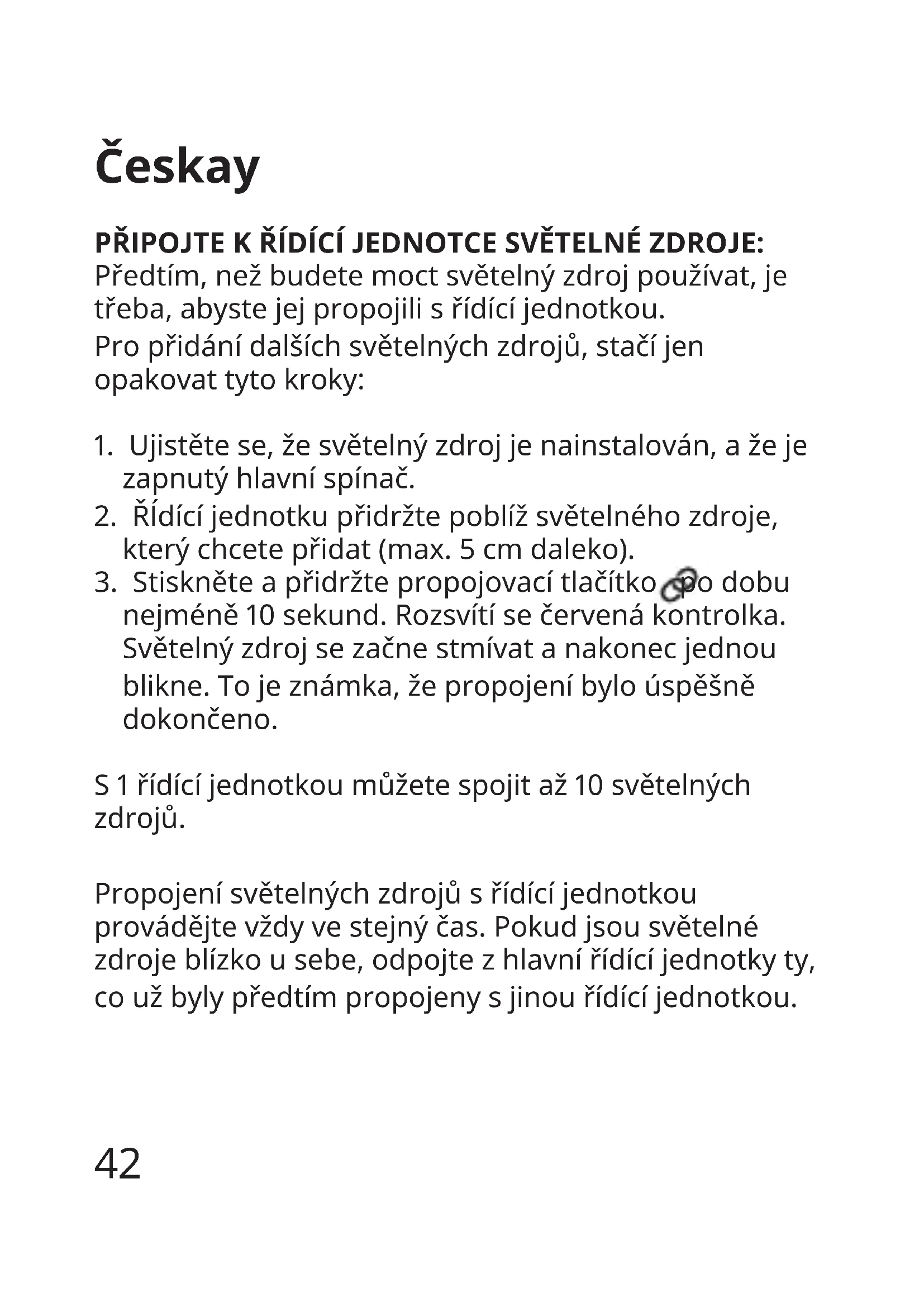 nejméně 10 sekund. Rozsvítí se červená kontrolka. Světelný zdroj se začne stmívat a nakonec jednou blikne. To je známka, že propojení bylo úspěšně dokončeno. S 1 řídící jednotkou můžete spojit až 10 světelných zdrojů. Propojení světelných zdrojů s řídící jednotkou provádějte vždy ve stejný čas. Pokud jsou světelné zdroje blízko u sebe, odpojte z hlavní řídící jednotky ty, co už byly předtím propojeny s jinou řídící jednotkou.43 UPOZORNĚNÍ: NEPOUŽÍVEJTE KLASICKÉ STMÍVAČE. Používejte pouze originální ovladače, nebo takové, které jsou zmíněny v těchto pokynech. Pokud tuto žárovku propojíte s běžným stmívačem, nebude fungovat tak, jak má. Pouze pro použití s výrobky ze série Chytré osvětlení IKEA. Díky dálkovému ovládání budete moct vybírat z 9 barev: Bílétóny Chladná bílá – 4000 Kelvinů Teplá bílá – 2700 Kelvinů Teplá záře – 2200 Kelvinů Světlo svíčky – 1780 Kelvinů Barvy Jantarová, Tmavě broskvová, Sytě růžová, Světle alová, Světle modrá Pokud přidáte bránu a aplikaci, získáte celkem 20 barev:44 Bílétóny Chladná obloha – 6000 Kelvinů Chladné denní světlo – 5000 Kelvinů Chladná bílá – 4000 Kelvinů Svítání – 3000 Kelvinů Teple bílá – 2700 Kelvinů Teplá záře – 2200 Kelvinů Světlo svíčky – 1780 Kelvinů Barvy Jantarová, Broskvová, Tmavě broskvová, Sytě červená, Růžová, Světle růžová, Sytě růžová, Světle alová, Sytě alová, Modrá, Světle modrá, Limetková, Žlutá RESETOVÁNÍ Zapněte a vypněte hlavní spínač 6krát za sebou. TECHNICKÁ DATA: Operačnífrekvence:2405–2480 MHz. Výstupní výkon: 10 dBm. Výrobce: IKEA of Sweden AB Adresa:Box702,SE-34381Älmhult,SWEDEN45 Symbol přeškrtnutého kontejneru označuje, že tento výrobek musí být likvidován odděleně od běžného domácího odpadu. Výrobek by měl být odevzdán k recyklaci v souladu s místními předpisy pro nakládání s odpadem. Oddělením označeného výrobku z komunálního odpadu, pomůžete snížit objem odpadů posílaných do spaloven nebo na skládku a minimalizovat případný negativní dopad na lidské zdraví a životní prostředí. Pro více informací, prosím, kontaktujte obchodní dům IKEA.46 Español AÑADIR LUCES AL DISPOSITIVO DE CONTROL: Antes de usar la luz, deberás sincronizarla con un dispositivo de control. Para añadir más luces, repite los siguientes pasos:
