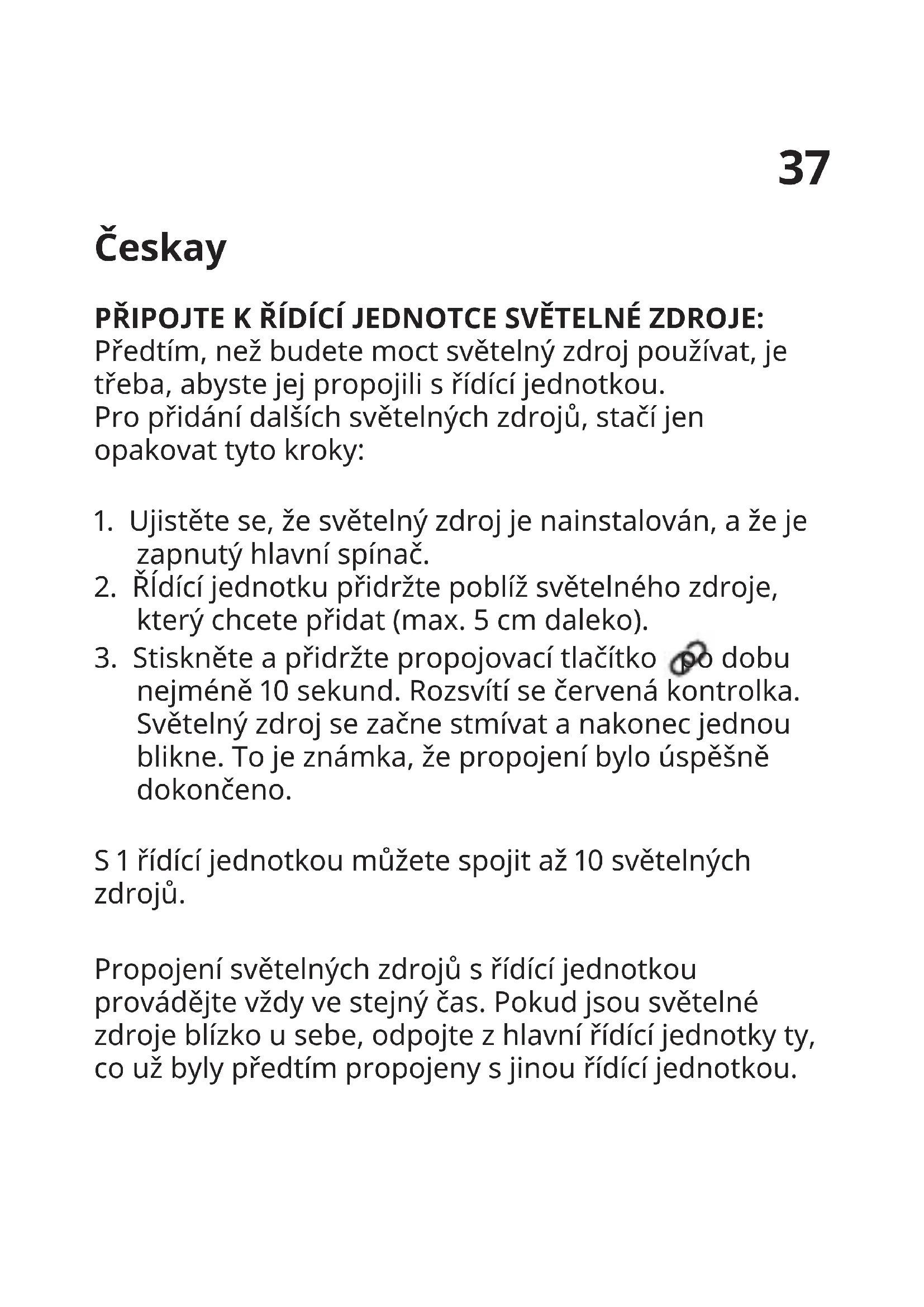 nejméně 10 sekund. Rozsvítí se červená kontrolka. Světelný zdroj se začne stmívat a nakonec jednou blikne. To je známka, že propojení bylo úspěšně dokončeno. S 1 řídící jednotkou můžete spojit až 10 světelných zdrojů. Propojení světelných zdrojů s řídící jednotkou provádějte vždy ve stejný čas. Pokud jsou světelné zdroje blízko u sebe, odpojte z hlavní řídící jednotky ty, co už byly předtím propojeny s jinou řídící jednotkou.38 UPOZORNĚNÍ: NEPOUŽÍVEJTE KLASICKÉ STMÍVAČE. Používejte pouze originální ovladače, nebo takové, které jsou zmíněny v těchto pokynech. Pokud tuto žárovku propojíte s běžným stmívačem, nebude fungovat tak, jak má. Pouze pro použití s výrobky ze série Chytré osvětlení IKEA. Díky dálkovému ovládání budete moct vybírat z 9 barev: Bílétóny Chladná bílá – 4000 Kelvinů Teplá bílá – 2700 Kelvinů Teplá záře – 2200 Kelvinů Světlo svíčky – 1780 Kelvinů Barvy Jantarová, Tmavě broskvová, Sytě růžová, Světle alová, Světle modrá Pokud přidáte bránu a aplikaci, získáte celkem 20 barev: Bílétóny Chladná obloha – 6000 Kelvinů39 Chladné denní světlo – 5000 Kelvinů Chladná bílá – 4000 Kelvinů Svítání – 3000 Kelvinů Teple bílá – 2700 Kelvinů Teplá záře – 2200 Kelvinů Světlo svíčky – 1780 Kelvinů Barvy Jantarová, Broskvová, Tmavě broskvová, Sytě červená, Růžová, Světle růžová, Sytě růžová, Světle alová, Sytě alová, Modrá, Světle modrá, Limetková, Žlutá RESETOVÁNÍ Zapněte a vypněte hlavní spínač 6krát za sebou. TECHNICKÁ DATA: Operačnífrekvence:2405–2480 MHz. Výstupní výkon: 10 dBm. Výrobce: IKEA of Sweden AB Adresa: Box 702, SE-343 81 Älmhult, SWEDEN40 Symbol přeškrtnutého kontejneru označuje, že tento výrobek musí být likvidován odděleně od běžného domácího odpadu. Výrobek by měl být odevzdán k recyklaci v souladu s místními předpisy pro nakládání s odpadem. Oddělením označeného výrobku z komunálního odpadu, pomůžete snížit objem odpadů posílaných do spaloven nebo na skládku a minimalizovat případný negativní dopad na lidské zdraví a životní prostředí. Pro více informací, prosím, kontaktujte obchodní dům IKEA. Español AÑADIR LUCES AL DISPOSITIVO DE CONTROL: Antes de usar la luz, deberás sincronizarla con un dispositivo de control. Para añadir más luces, repite los siguientes pasos: