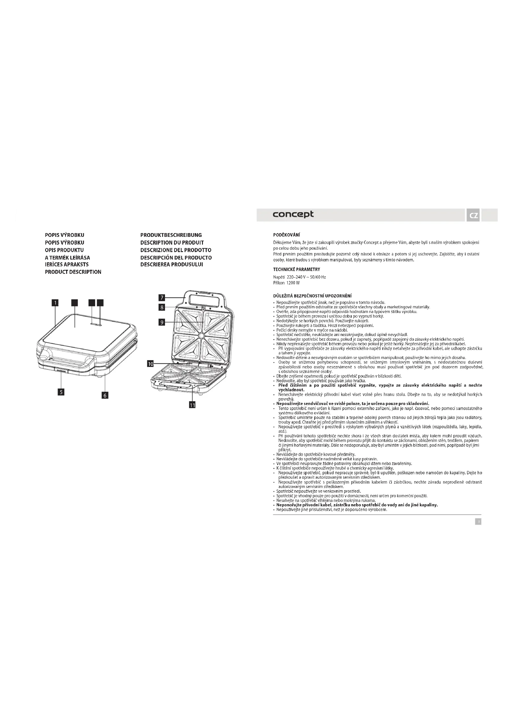 - Plastové sáčky z polyetylénu (PE) odevzdejte do sběru materiálu k recyklaci. Recyklace spotřebiče na konci jeho životnosti Tento spotřebič je označen v souladu s Evropskou směrnicí 2012/19/EU o elektrickém odpadu aelektrických zařízeních (WEEE). Symbol na výrobku nebo jeho balení udává, že tento výrobek nepatří do domácího odpadu. Je nutné odvést ho do sběrného místa pro recyklaci elektrického aelektronického zařízení. Zajištěním správné likvidace tohoto výrobku pomůžete zabránit negativním důsledkům pro životní prostředí a lidské zdraví, které by jinak byly způsobeny nevhodnou likvidací tohoto výrobku. Likvidace musí být provedena v souladu s předpisy pro nakládání s odpady. Podrobnější informace orecyklaci tohoto výrobku zjistíte u příslušného místního úřadu, služby pro likvidaci domovního odpadu nebo v obchodě, kde jste výrobek zakoupili. Tento výrobek splňuje veškeré základní požadavky směrnic EU, které se na něj vztahují. Změny v textu, designu a technických specifikací se mohou měnit bez předchozího upozornění a vyhrazujeme si právo na jejich změnu.6 7 SKSK POĎAKOVANIE Ďakujeme vám, že ste sa rozhodli kúpiť si výrobok značky Concept, a prajeme vám, aby ste boli s naším výrobkom spokojní po celý čas jeho používania. Pred prvým použitím si prosím pozorne preštudujte celý návod naobsluhu a dobre ho odložte. Zabezpečte, aby všetci, ktorí budú tento výrobok používať, boli oboznámení stýmto návodom. TECHNICKÉ PARAMETRE Napätie 220–240 V ~ 50/60 Hz Príkon 1200 W