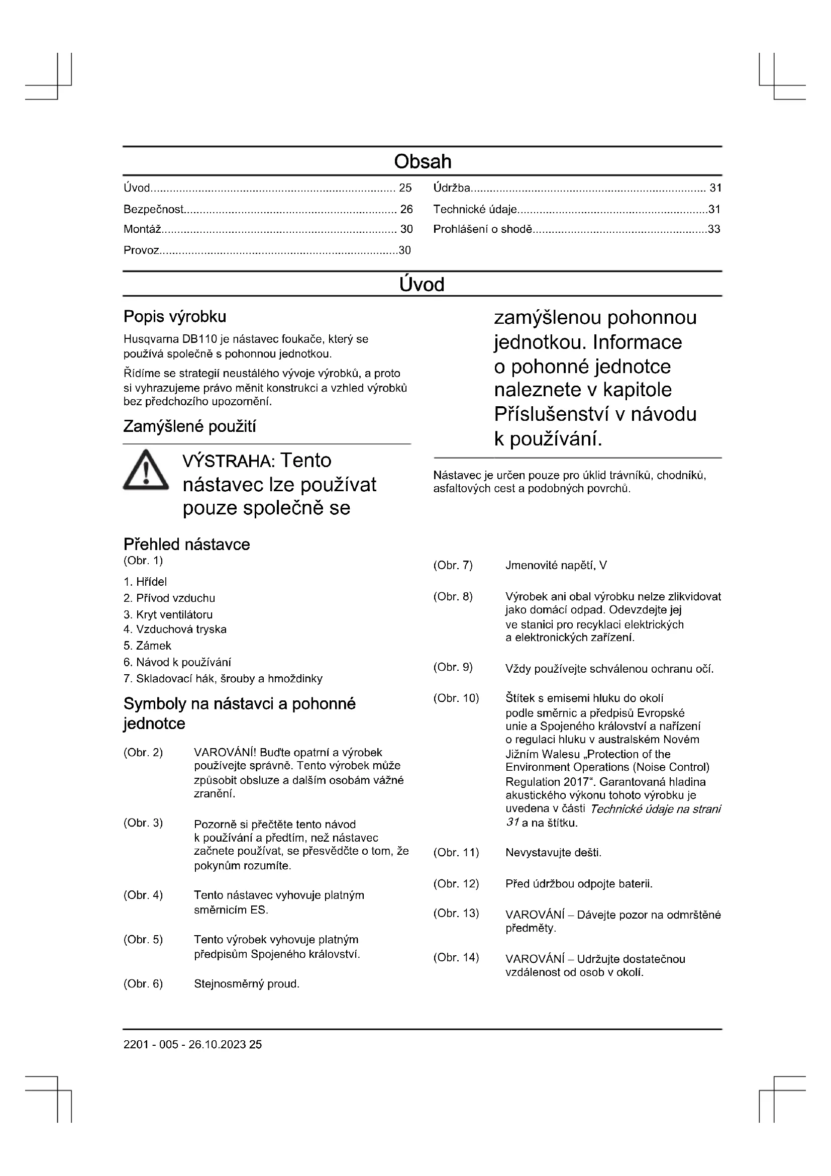 ana štítku. (Obr. 11) Nevystavujte dešti. (Obr. 12) Před údržbou odpojte baterii. (Obr. 13) VAROVÁNÍ– Dávejte pozor na odmrštěné předměty. (Obr. 14) VAROVÁNÍ– Udržujte dostatečnou vzdálenost od osob vokolí. 2201 - 005 - 26.10.2023 25Povšimněte si: Další symboly/štítky na nástavci se týkají zvláštních certifikačních požadavků pro určité obchodní trhy. Bezpečnost Definice týkající se bezpečnosti Varování, upozornění apoznámky slouží jako upozornění na specifické důležité části návodu kpoužívání. VÝSTRAHA: Používá se vpřípadě nebezpečí úrazu nebo usmrcení obsluhy nebo okolních osob, pokud nejsou dodrženy pokyny uvedené vtéto příručce. VAROVÁNÍ: Používá se vpřípadě nebezpečí poškození výrobku nebo nástavce, dalších materiálů či škod na majetku vblízkém okolí, pokud nejsou dodrženy pokyny uvedené vtéto příručce. Povšimněte si: Používá se kposkytnutí dalších informací, které jsou nezbytné vdané situaci. Obecné bezpečnostní pokyny VÝSTRAHA: Před použitím nástavce si přečtěte následující bezpečnostní pokyny.