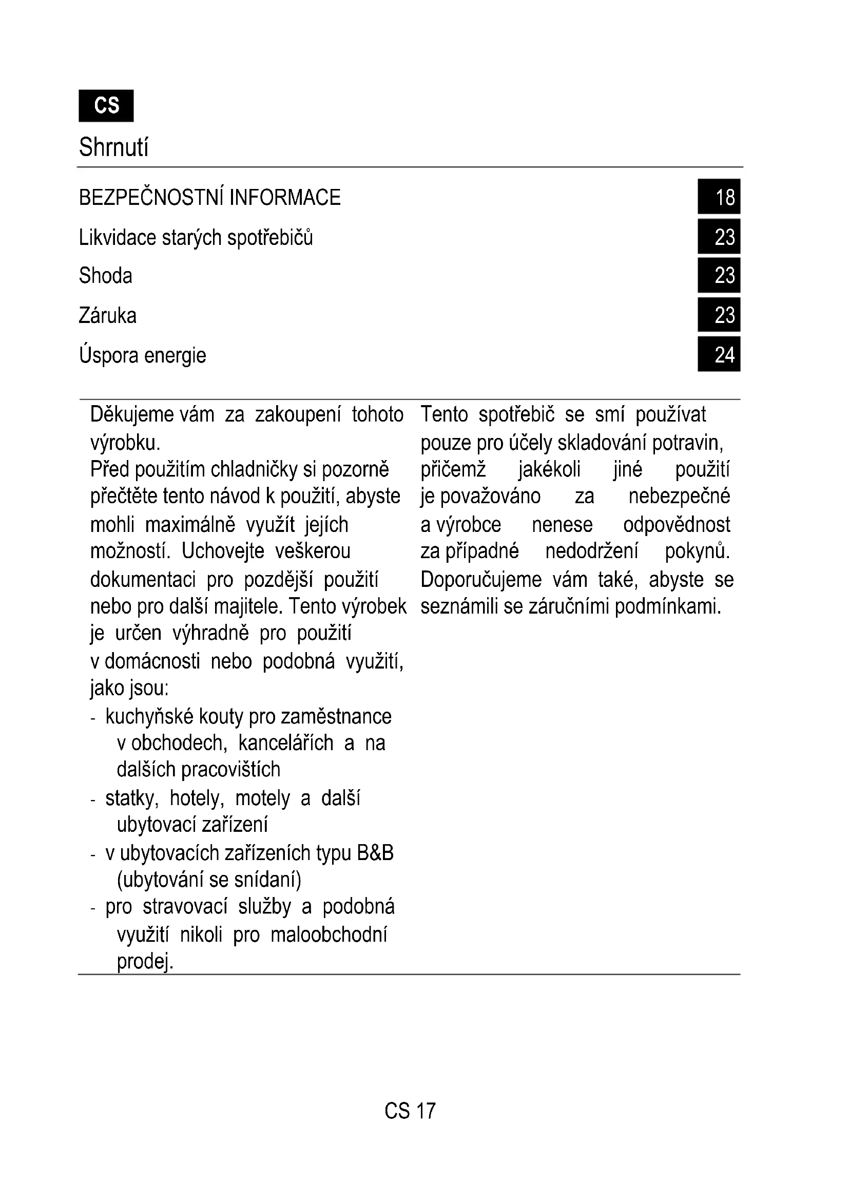Děkujeme vám za zakoupení tohoto výrobku. Před použitím chladničky si pozorně přečtěte tento návod k použití, abyste mohli maximálně využít jejích možností. Uchovejte veškerou dokumentaci pro pozdější použití nebo pro další majitele. Tento výrobek je určen výhradně pro použití v domácnosti nebo podobná využití, jako jsou: - kuchyňské kouty pro zaměstnance v obchodech, kancelářích a na dalších pracovištích - statky, hotely, motely a další ubytovací zařízení - v ubytovacích zařízeních typu B&B (ubytování se snídaní) - pro stravovací služby a podobná využití nikoli pro maloobchodní prodej. Tento spotřebič se smí používat pouze pro účely skladování potravin, přičemž jakékoli jiné použití je považováno za nebezpečné a výrobce nenese odpovědnost za případné nedodržení pokynů. Doporučujeme vám také, abyste se seznámili se záručními podmínkami.CS 18