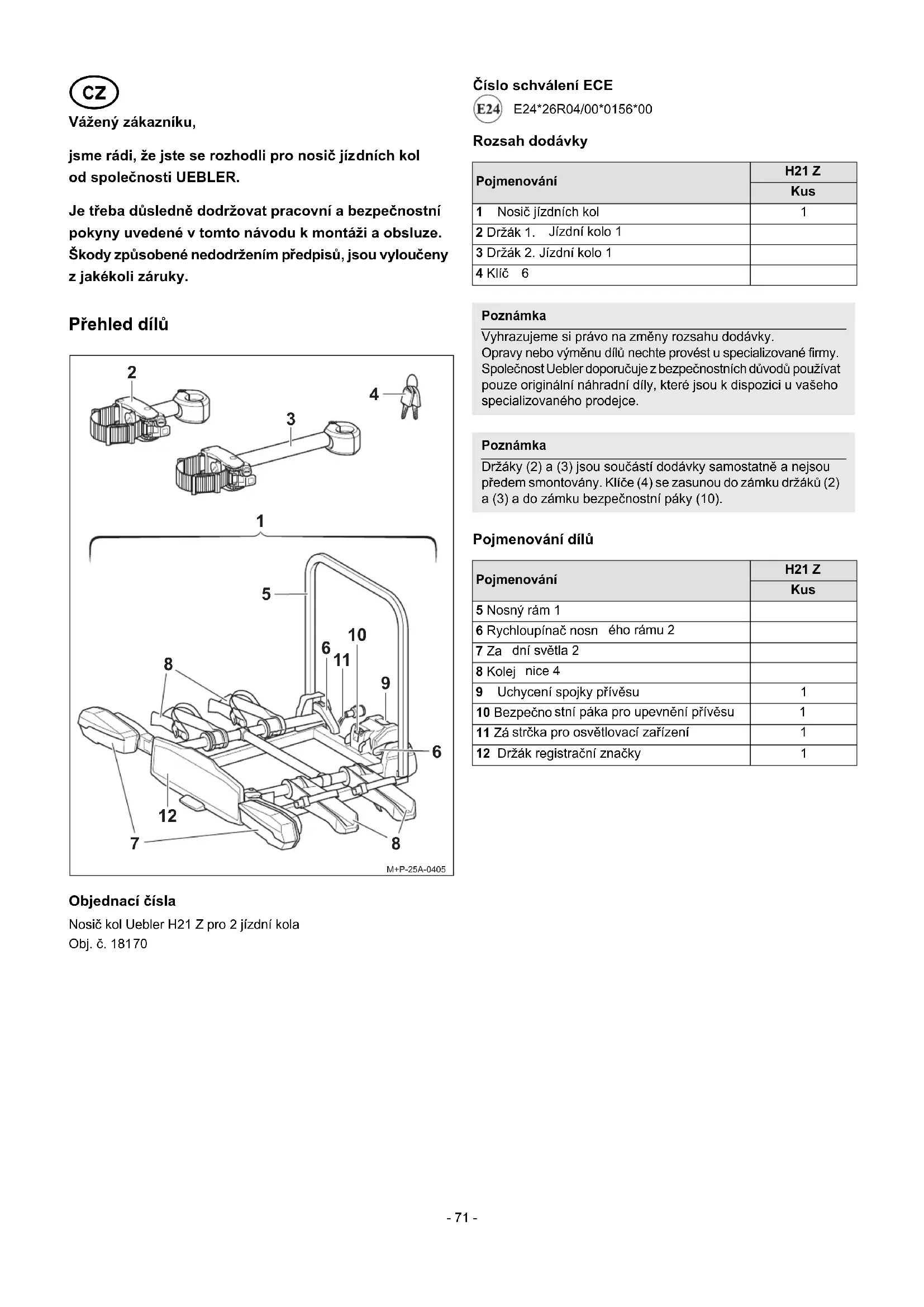 Vážený zákazníku, jsme rádi, že jste se rozhodli pro nosič jíz dních kol od společno sti UEBLER. Je třeb a důsledně dodržovat pracovní a bezpečnostní pokyny uvedené v tomto návodu k montáži a obsluze. Škody způsobené nedodržením předpisů, jsou vyloučeny z jakékoli záruky. Přehled dílů Objednací čísla Nosič kol Uebler H21 Z pro 2 jízdní kola Obj. č. 181